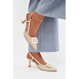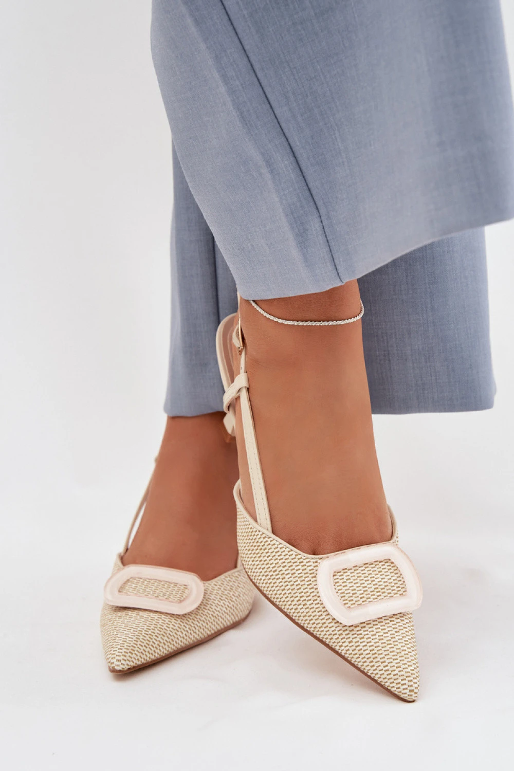 Dámské sandály vyrobené z kombinace eko kůže a umělé hmoty jsou stylovým doplňkem pro ženské outfit. Špičaté špičky zdůrazňují štíhlou linii nohy a dodávají modelu elegantní charakter. Boty jsou umístěny na štíhlém podpatku, který jemně prodlužuje siluetu a dodává lehkost krokům. Přezka s nastavitelným popruhem umožňuje přizpůsobení se noze, což zaručuje pohodlí a stabilitu. Ozdobný prvek umístěný vpředu přitahuje pozornost a tvoří efektní detail, díky čemuž se sandály skvěle hodí pro elegantní výstupy a zvláštní příležitosti.