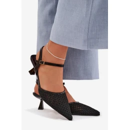 Dámské sandály vyrobené z kombinace eko kůže a textilního materiálu jsou stylovým doplňkem pro ženské outfity. Kombinace materiálů zajistí estetický vzhled a pohodlí při nošení, což znamená, že se tento model skvěle hodí na různé příležitosti. Boty jsou umístěny na úzkém podpatku, který jemně zjemňuje postavu a dodává lehkost krokům. Špičaté špičky zdůrazňují elegantní charakter a pásek s přezkou a regulací umožňuje správné přizpůsobení noze. Jsou to efektní sandály, které skvěle doplní jak večerní, tak více elegantní letní outfity.