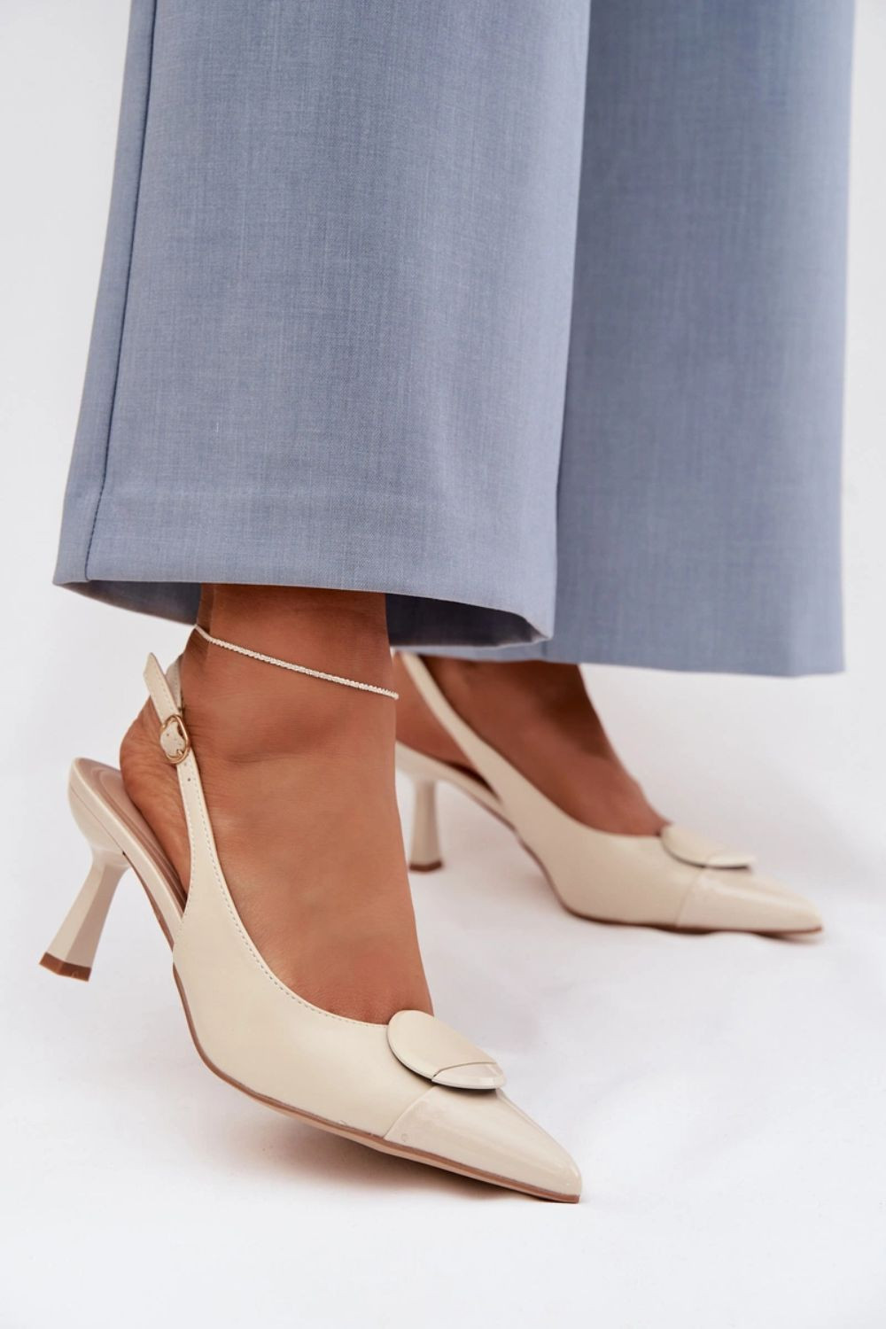 Dámské sandály vyrobené z ekokože jsou nabídkou pro ženy, které oceňují elegantní styl a ženské detaily. Špičaté špičky opticky zjemňují nohu a zdůrazţují štíhlou linii obuvi. Model na podpatku ve tvaru jehly dodává postavě lehkost a elegantní charakter. Vepředu je ozdobný detail, který přitahuje pozornost a dodává celku výjimečný výraz. Nastavitelný popruh s přezkou umožňuje přizpůsobení noze, zajistí pohodlí a stabilitu. Jedná se o stylové sandály, které se skvěle hodí na elegantní výlety a výjimečné příležitosti.