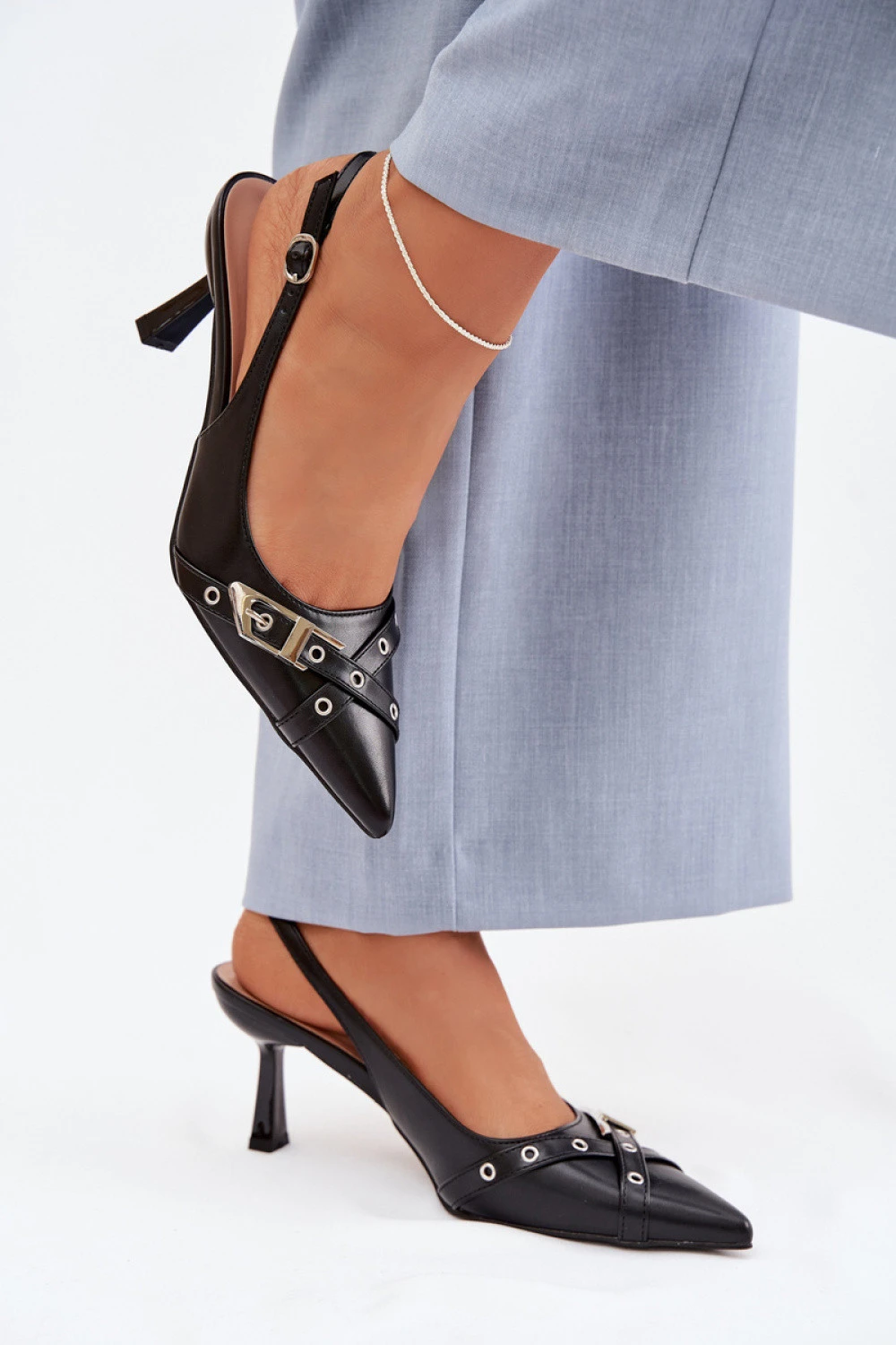 Dámské sandály vyrobené z ekokože jsou stylovým návrhem pro ženské outfit. Zakryté, špičaté špičky jim dodávají elegantní charakter a opticky prodlužují nohu, zdůrazňujíce štíhlou linii boty. Model je umístěn na jehlovém podpatku, který dodává postavě lehkost a ženskou eleganci. Zapínání na přezku s nastavitelným páskem umožňuje správné přizpůsobení noze a zajišťuje stabilitu při chůzi. Vepředu jsou umístěny dva popruhy a dekorativní přezka, které představují efektní detail a zdůrazňují stylový charakter sandálů. Jedná se o ideální volbu na speciální příležitosti a elegantní letní outfit.