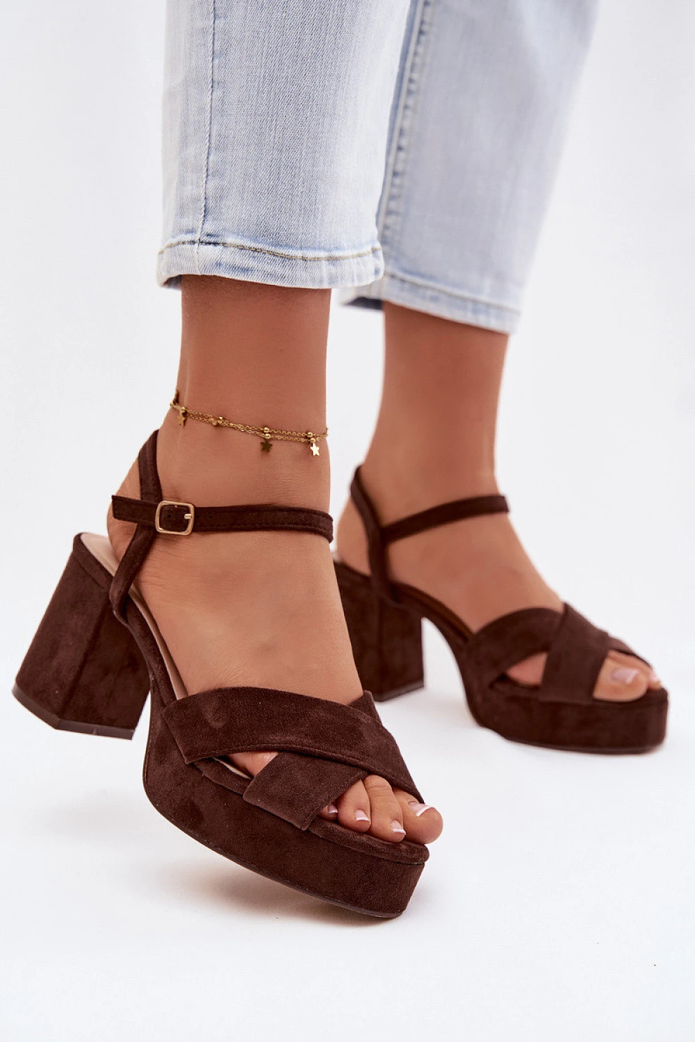 Dámské sandály vyrobené z ekologického semiše. Model usazený na stabilním sloupkovém podpatku a platformě poskytuje pohodlí při nošení a jistotu kroku, zároveň zdůrazňuje postavu. Dva se protínající popruhy vpředu efektně vystavují nohu a přidávají celku módní charakter. Nastavitelný popruh se sponou umožňuje ideální přizpůsobení sandálů noze. Tento model se skvěle hodí jak na každý den, tak na speciální příležitosti.