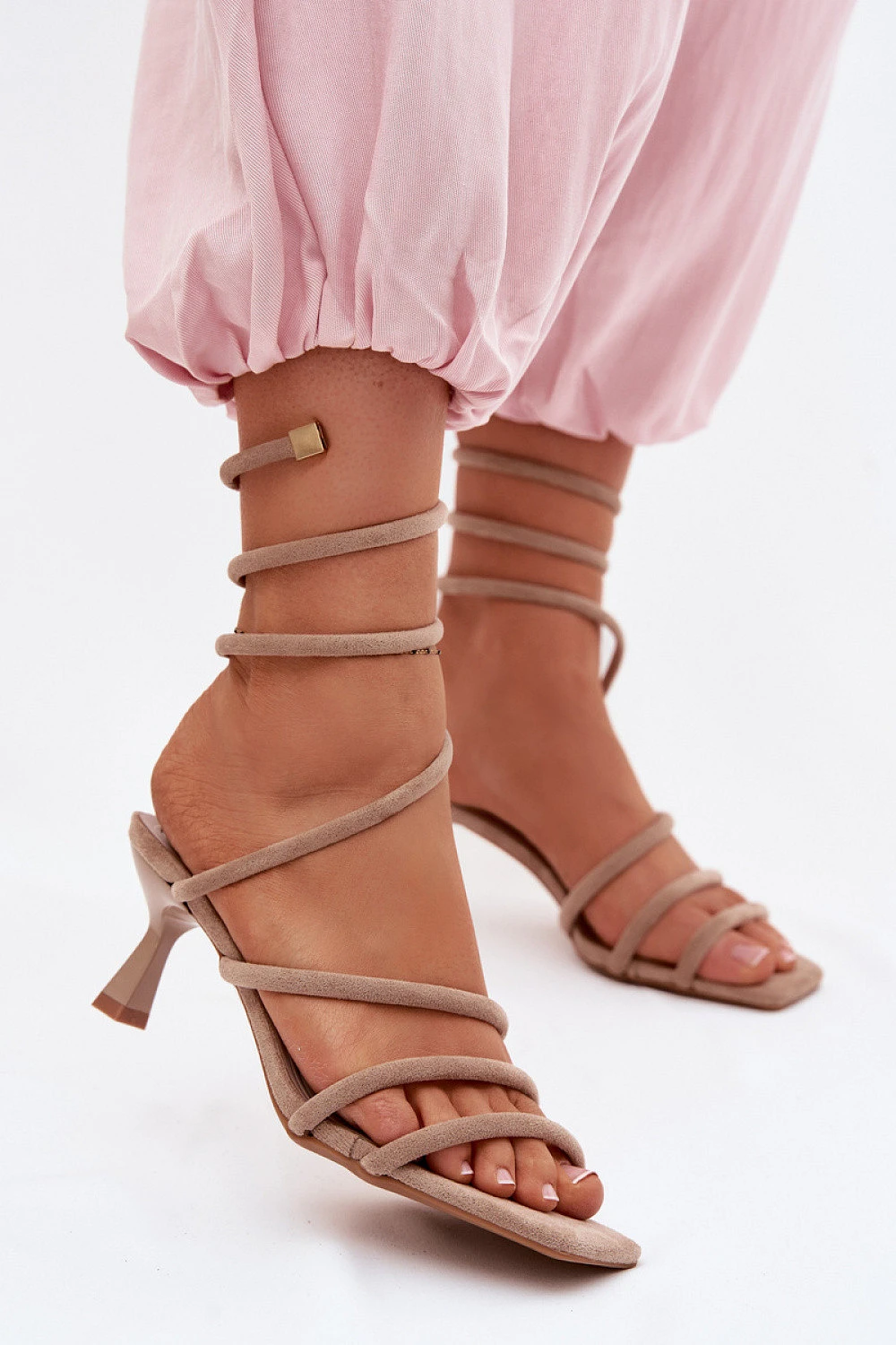 Dámské sandály vyrobené z ekologického semiše jsou ideální volbou na večerní vycházky a slavnostní události, jako jsou svatby nebo večírky. Jejich ženský a stylový design skvěle podtrhuje jedinečný charakter každého outfitu. Model je umístěn na štíhlém podpatku. Charakteristickým prvkem je efektní popruh obepínající nohu, který celkově dodává vzhledu smyslnost a módnost a zajišťuje pohodlné nošení. Jedná se o skvělé spojení elegance, pohodlí a moderního vzhledu ideální pro ženy, které chtějí vypadat výjimečně a stylově.
