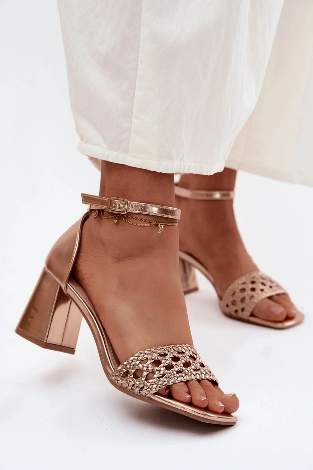 Dámské sandály s podpatkem z ekologické kůže jsou skvělým návrhem na léto, který kombinuje klasiku s módním detailom. Pletený pásek dodává celku originální charakter a přináší jemný letní akcent. Spona s nastavitelným páskem umožňuje ideální přizpůsobení noze a zajišťuje pohodlné nošení. Jedná se o model, který se hodí na různé příležitosti, od setkání po slavnosti, kdy chcete vypadat stylově a cítit se pohodlně.