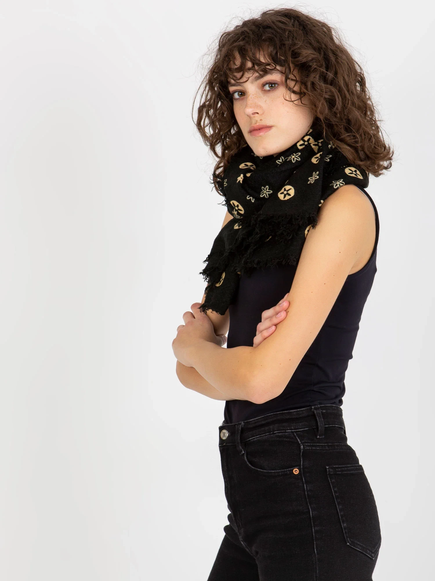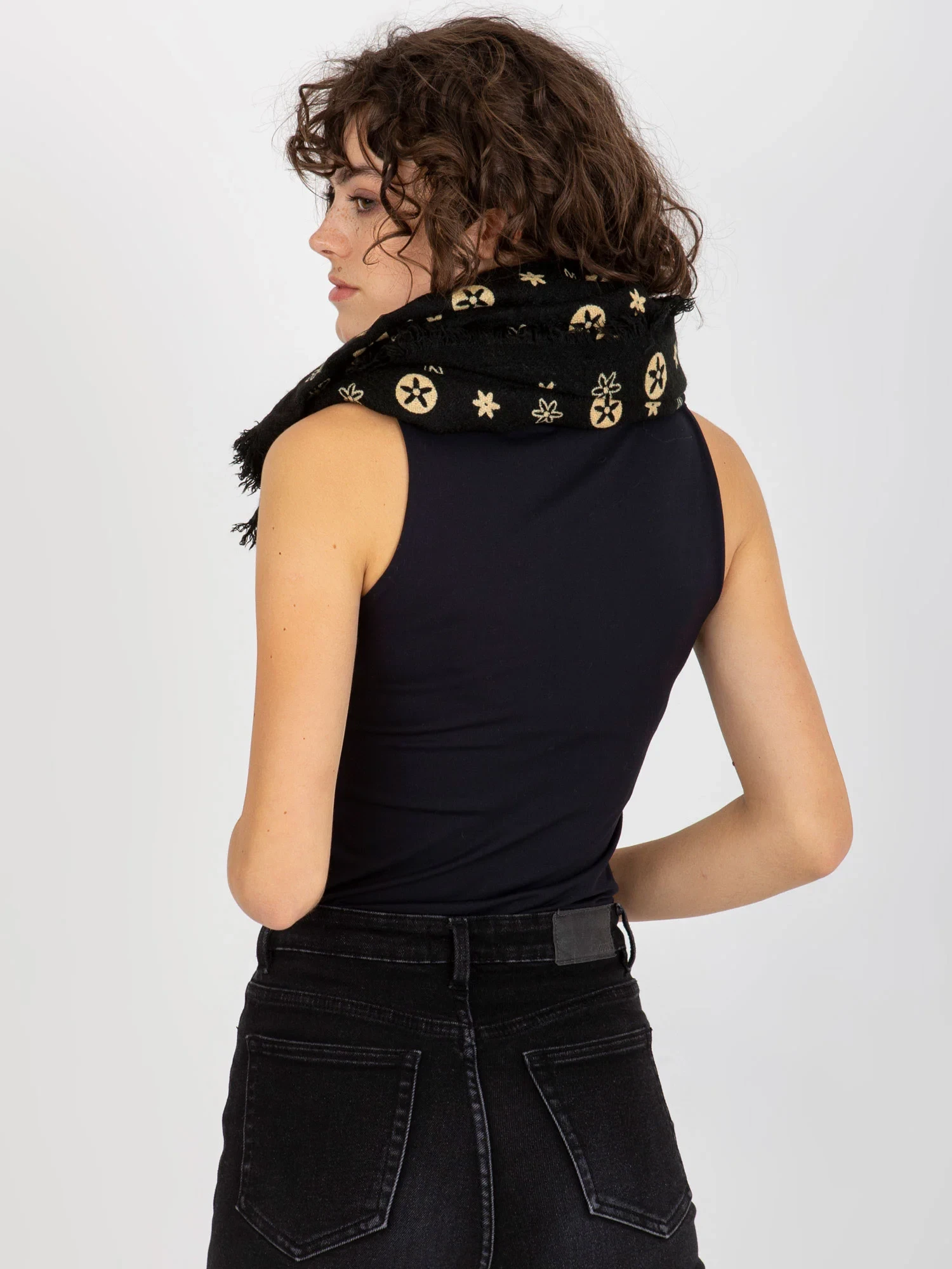 Černý dámský šátek s potisky .