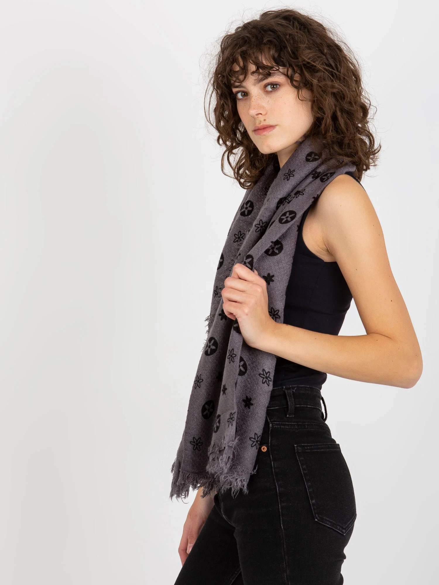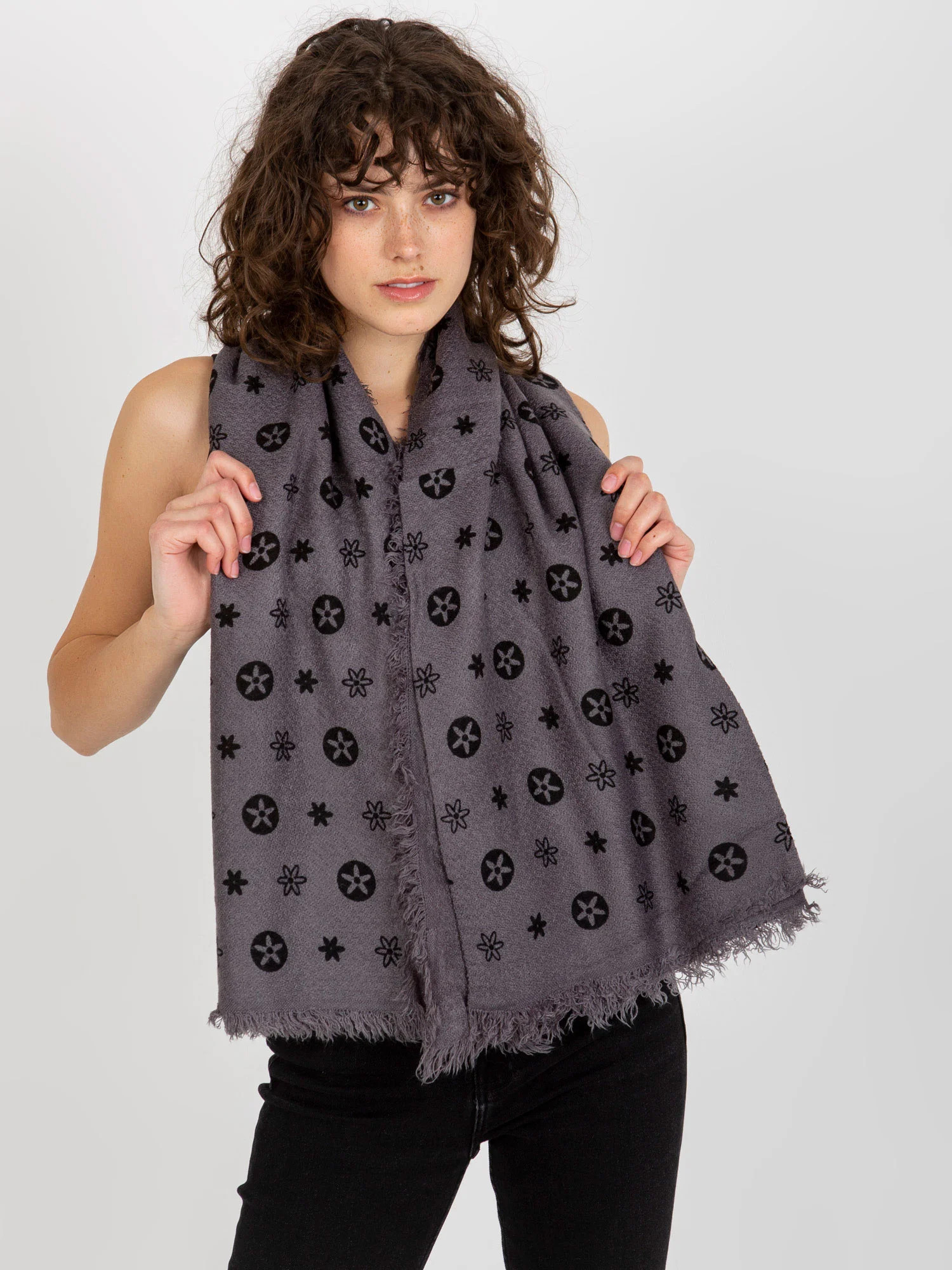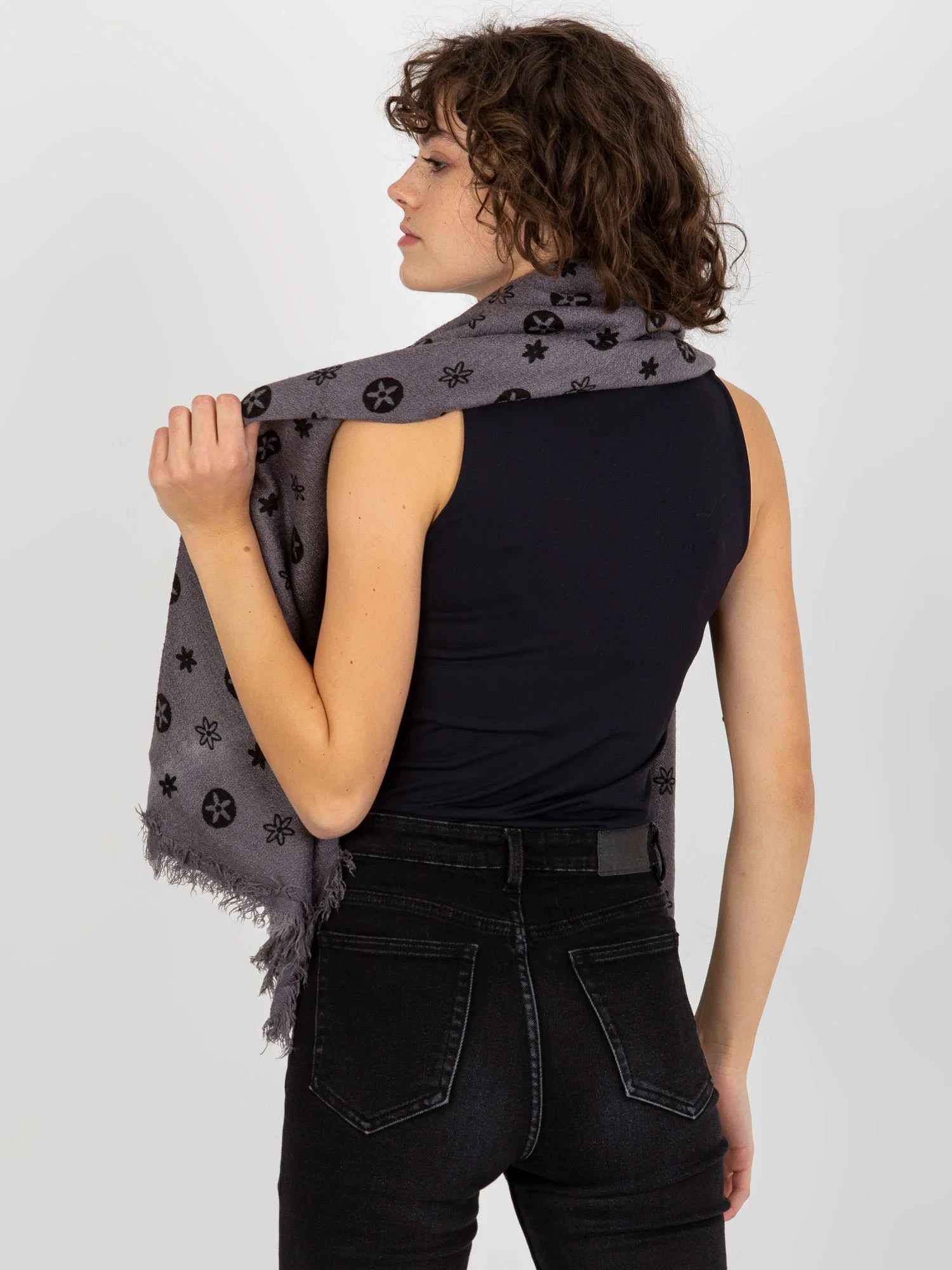 Tmavě šedý dámský šátek s potiskem .