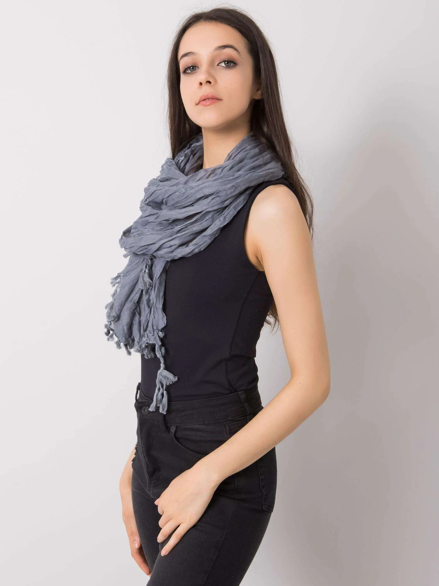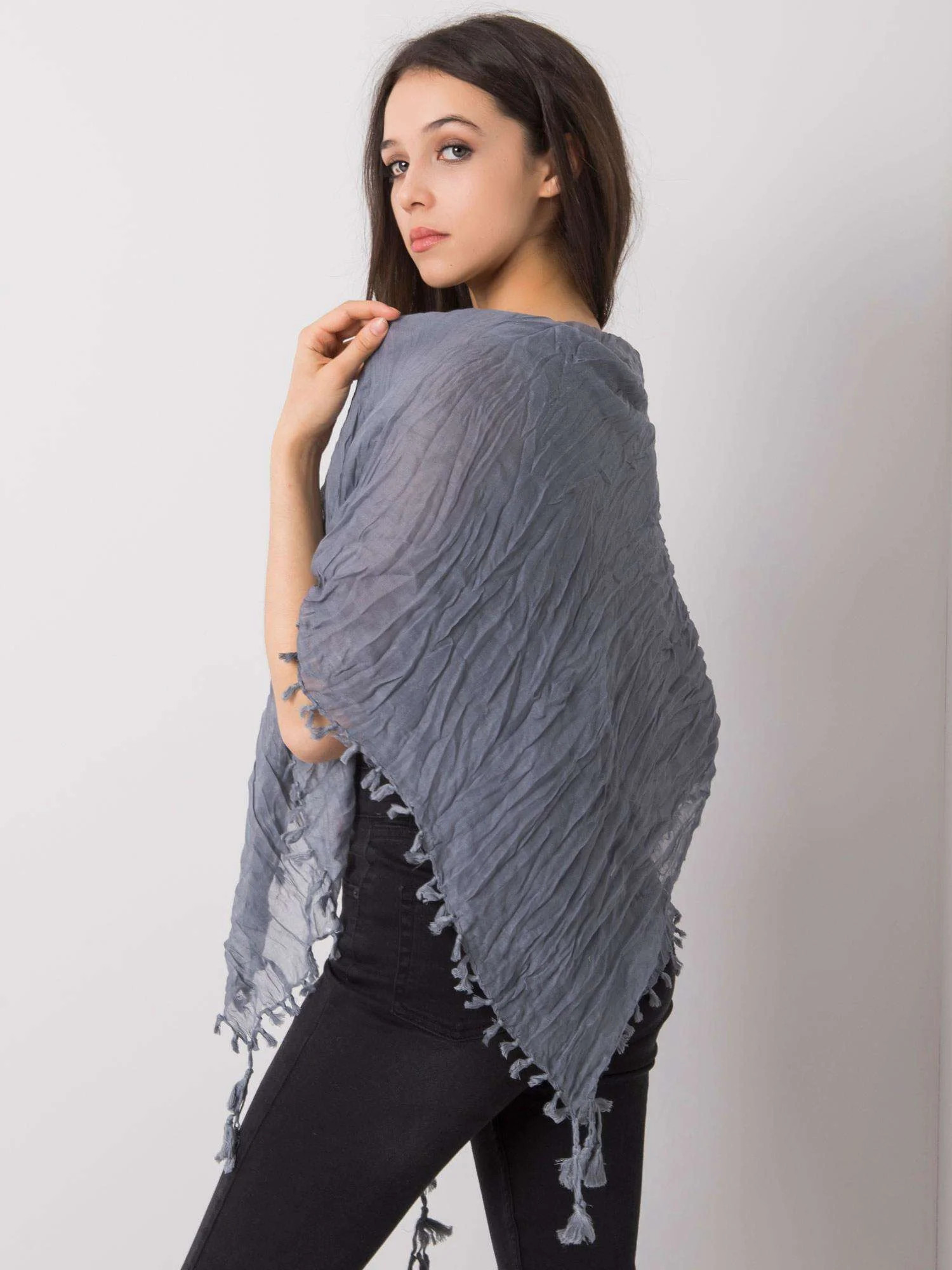 Šedá dámská šála se střapci.