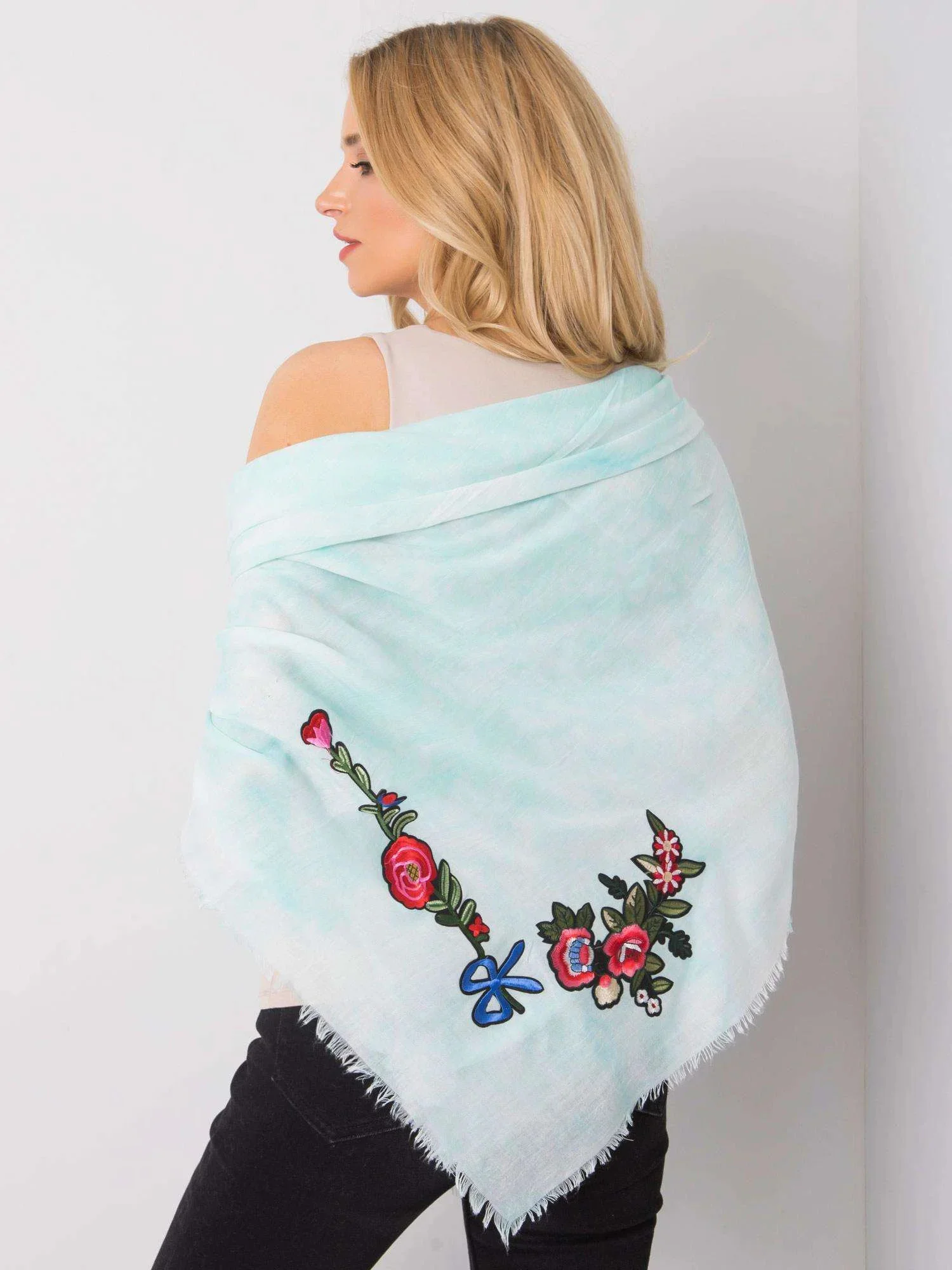Dámská šála mentolové barvy s barevnými nášivkami.