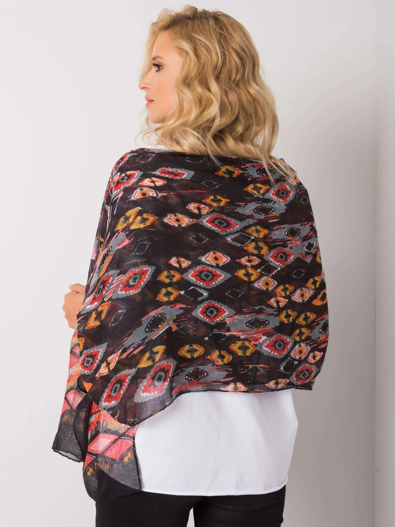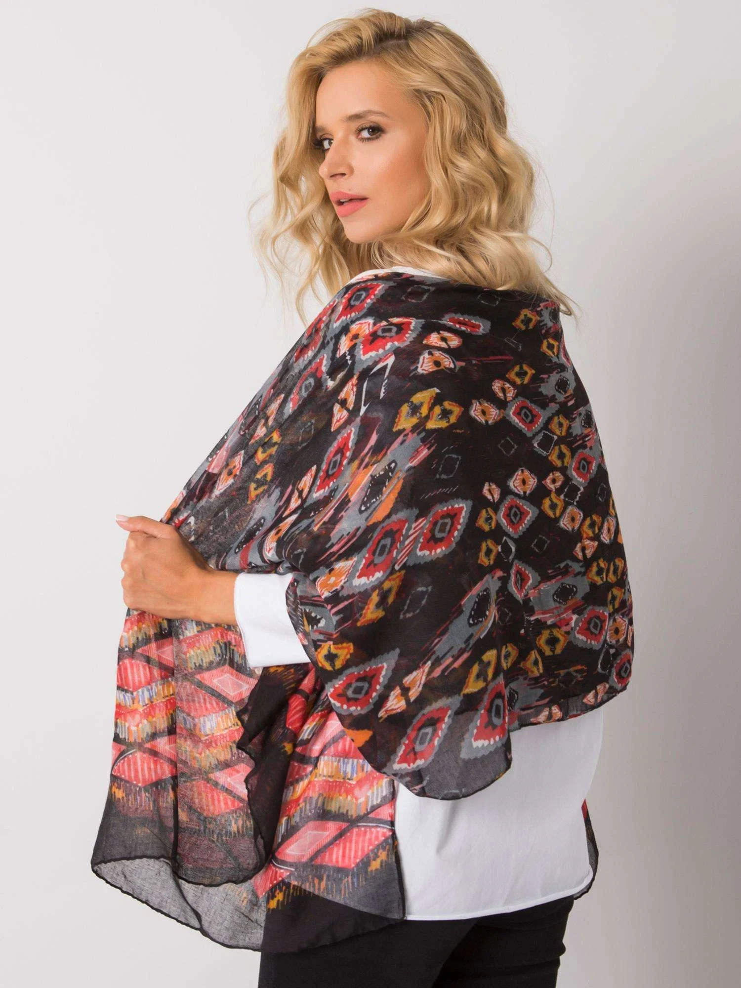Černo-červená šála s etnickými vzory.