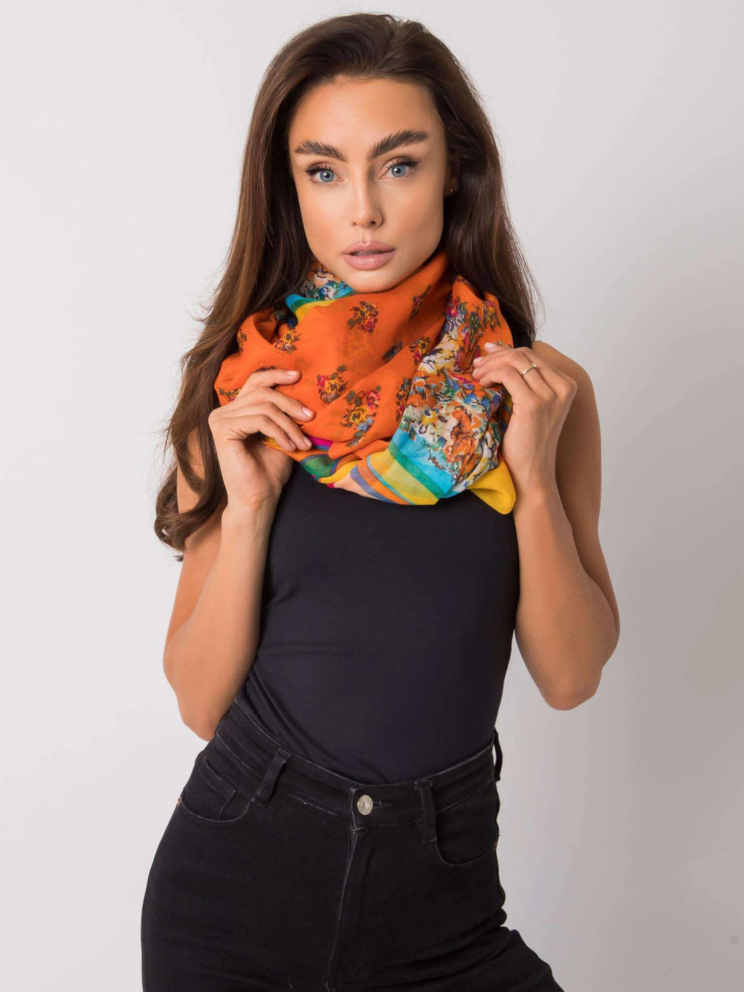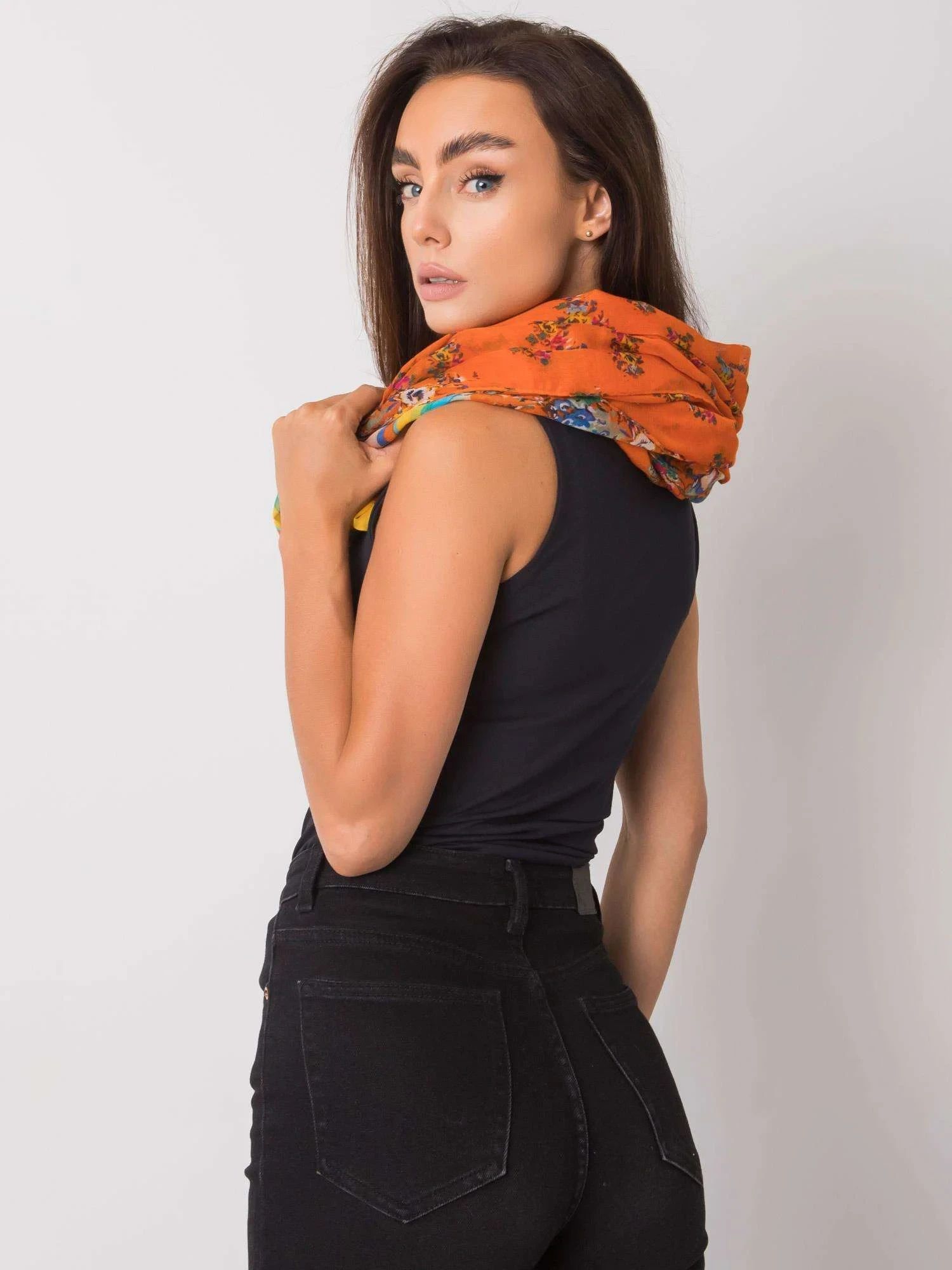Oranžová šála s potisky.