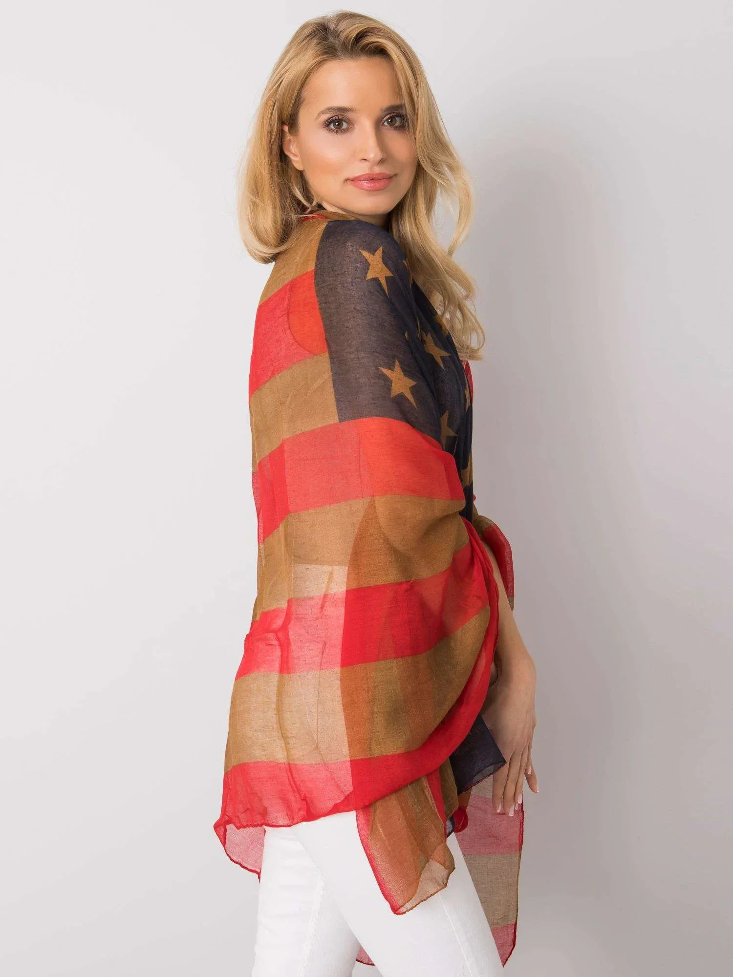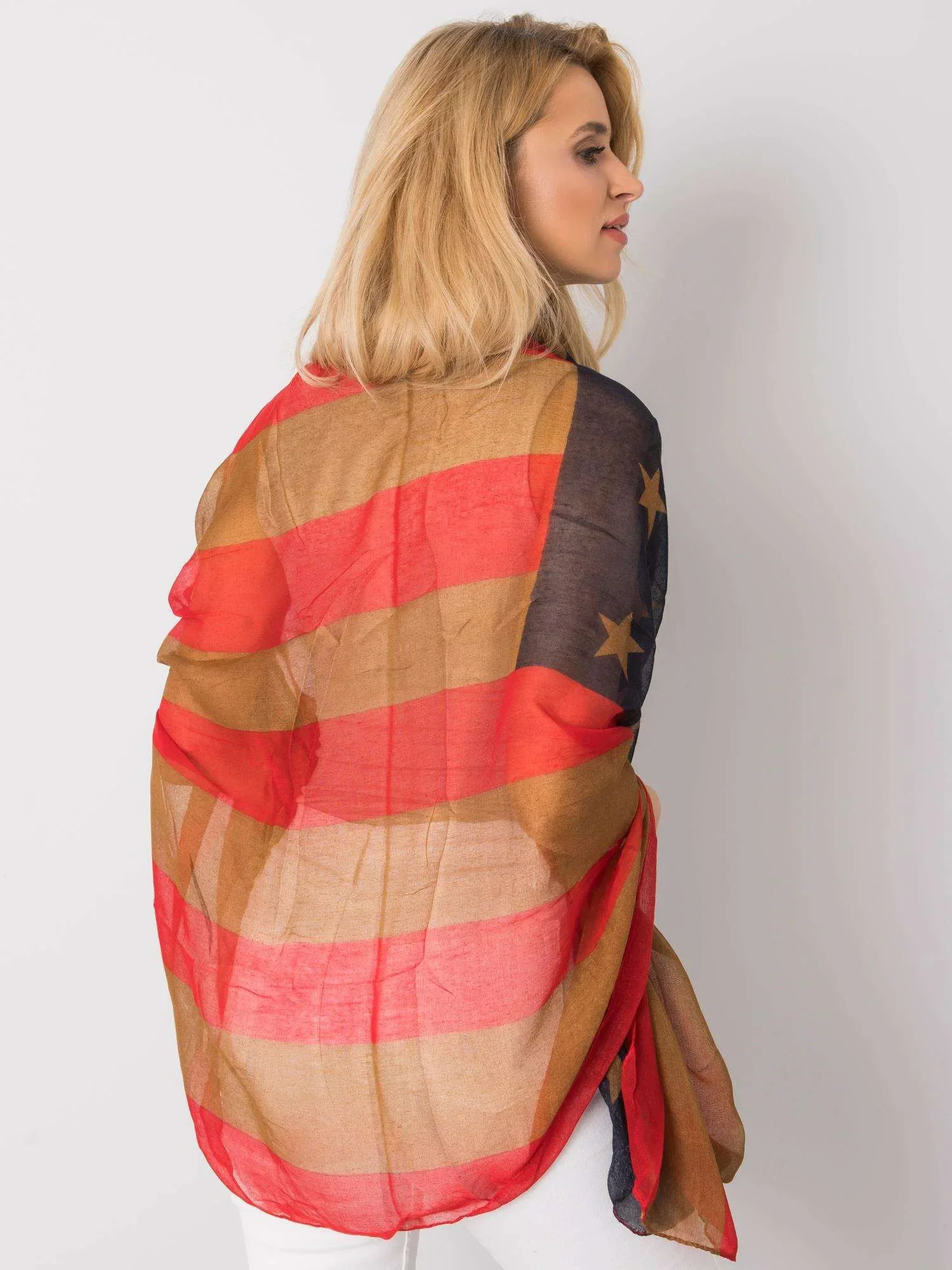 Červenohnědý šátek s potiskem.