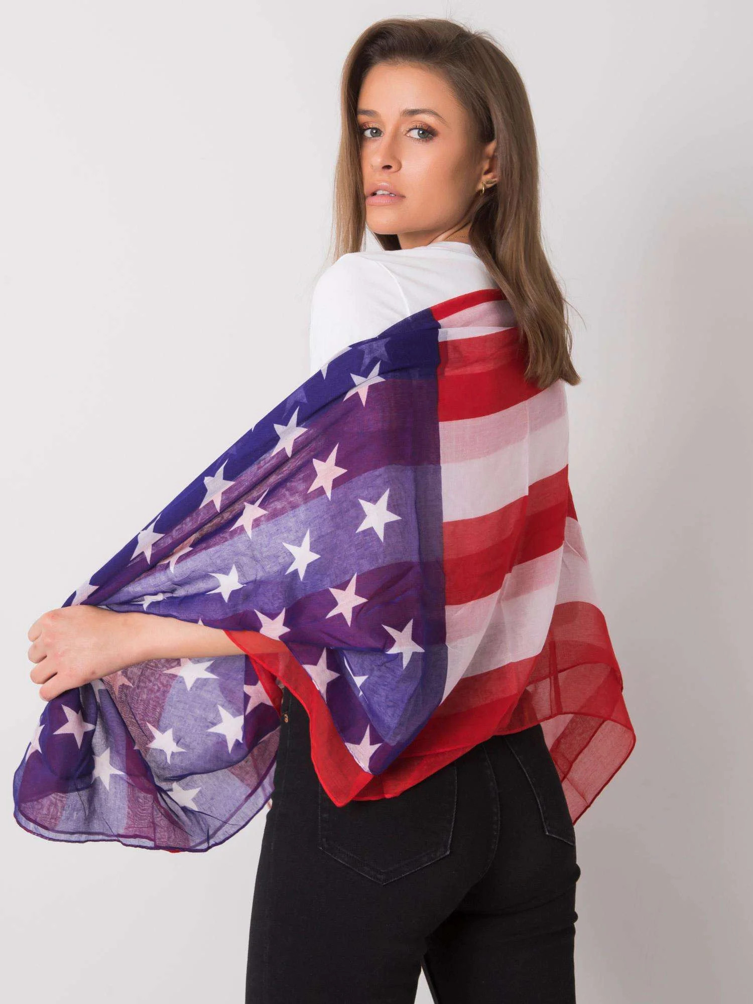 Červenobílá šála s potiskem.
