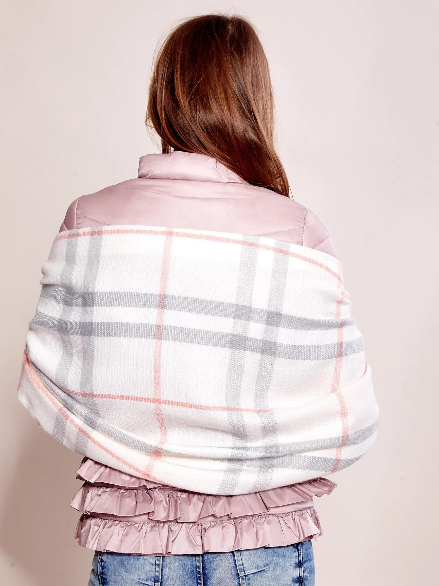 Světle růžový a bílý vzorovaný šátek s třásněmi .