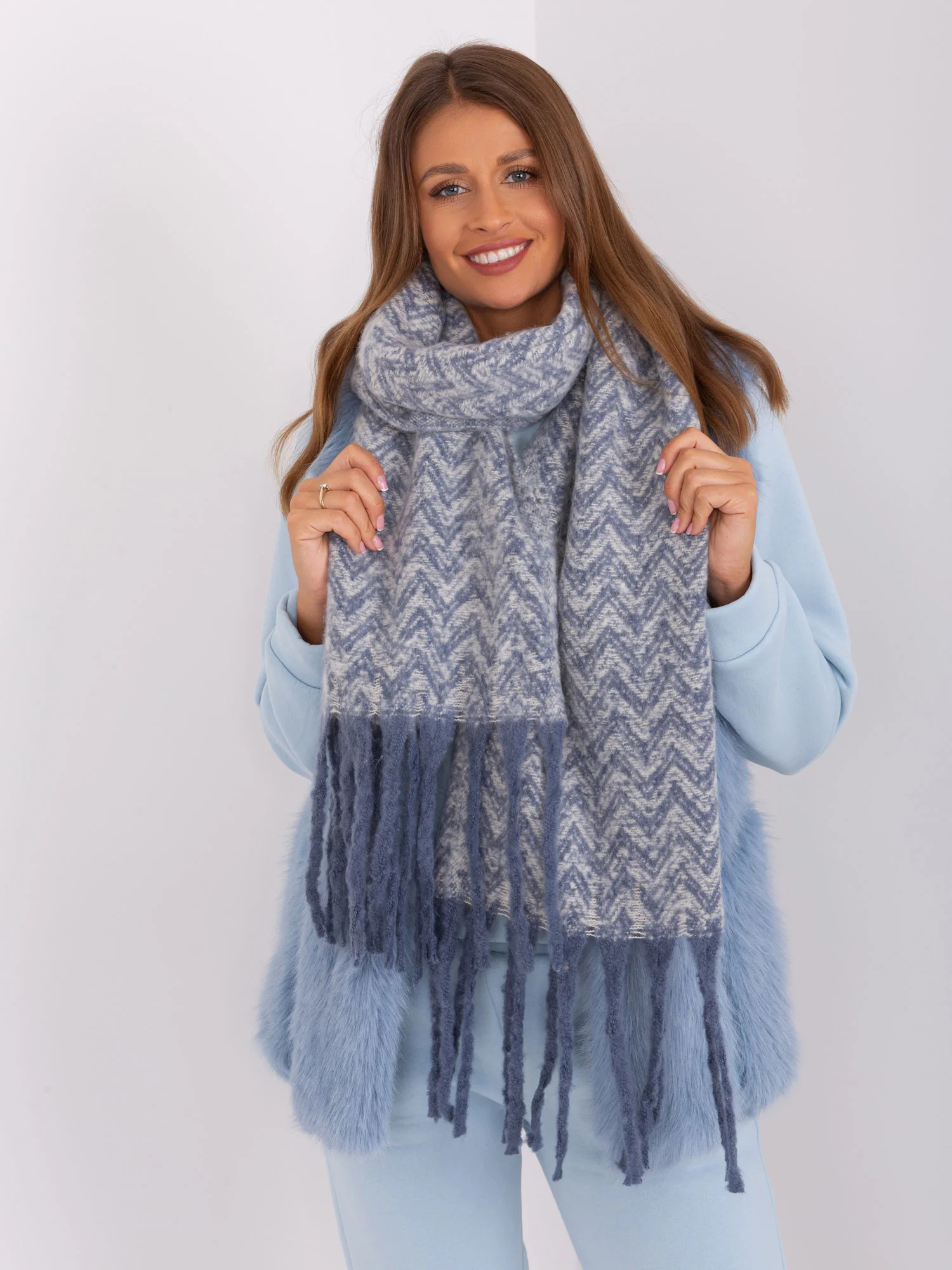 Dámská bílo-modrá šála s třásněmi.