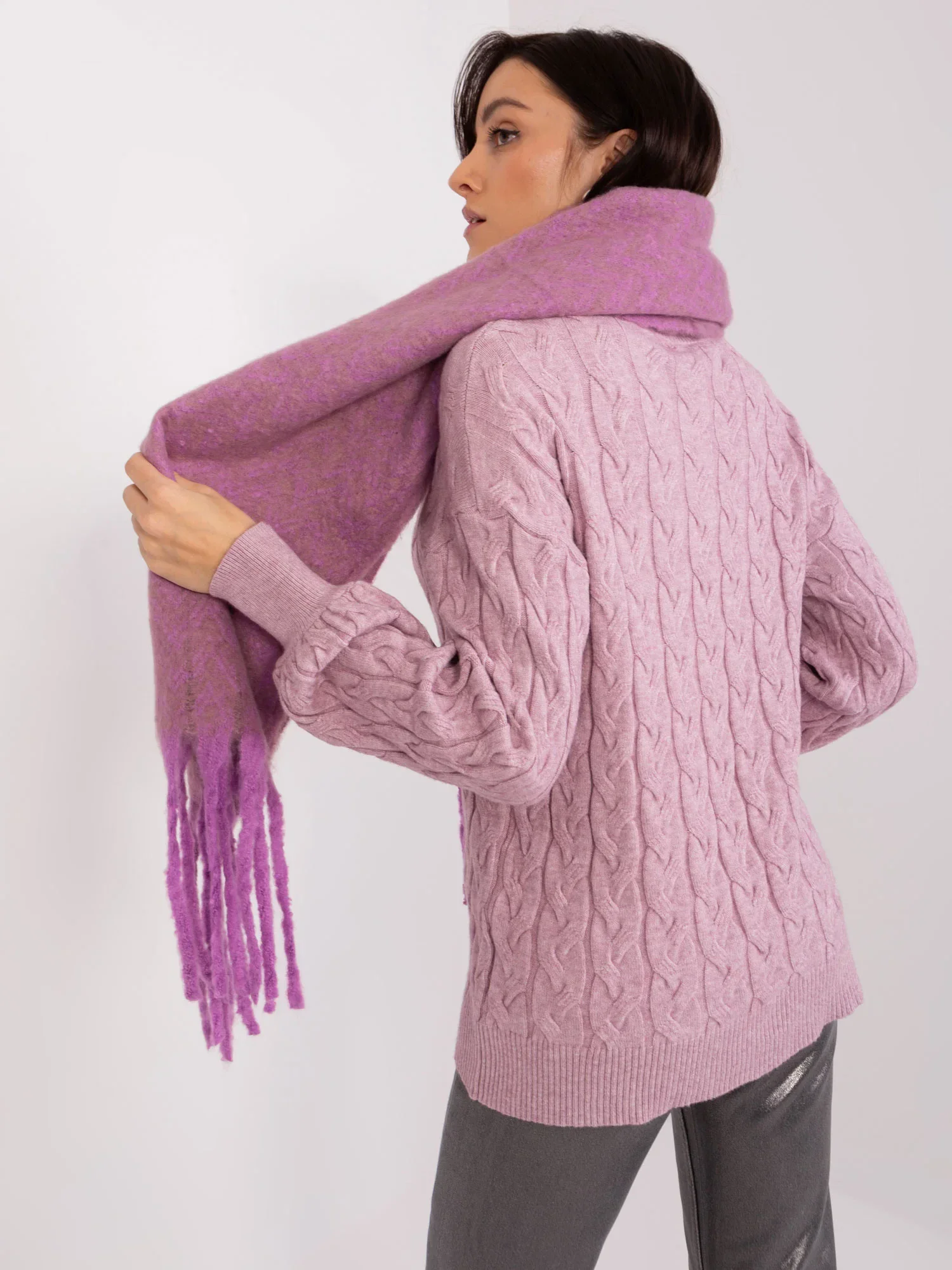 Fialový a tmavě béžový šátek s třásněmi .