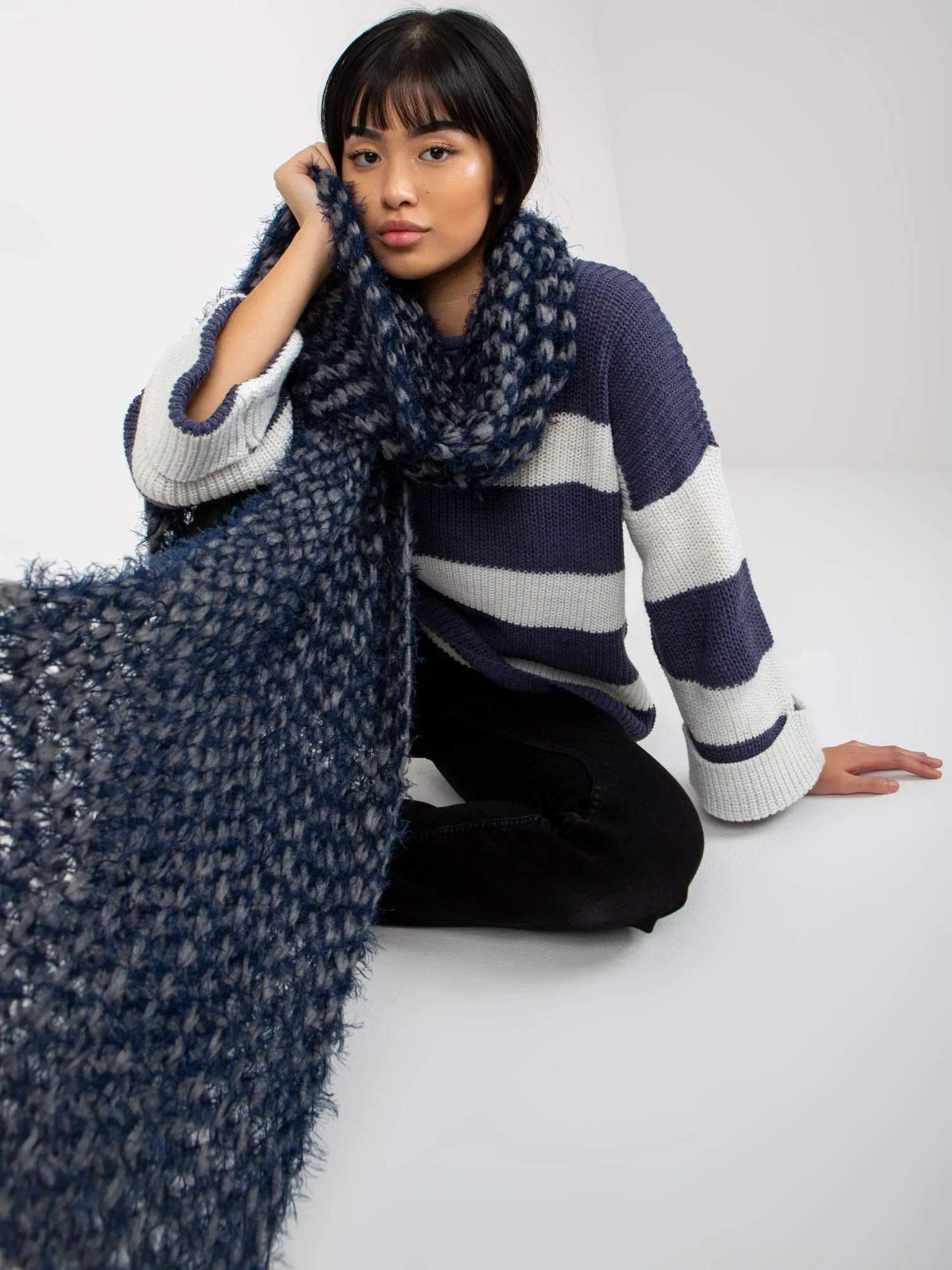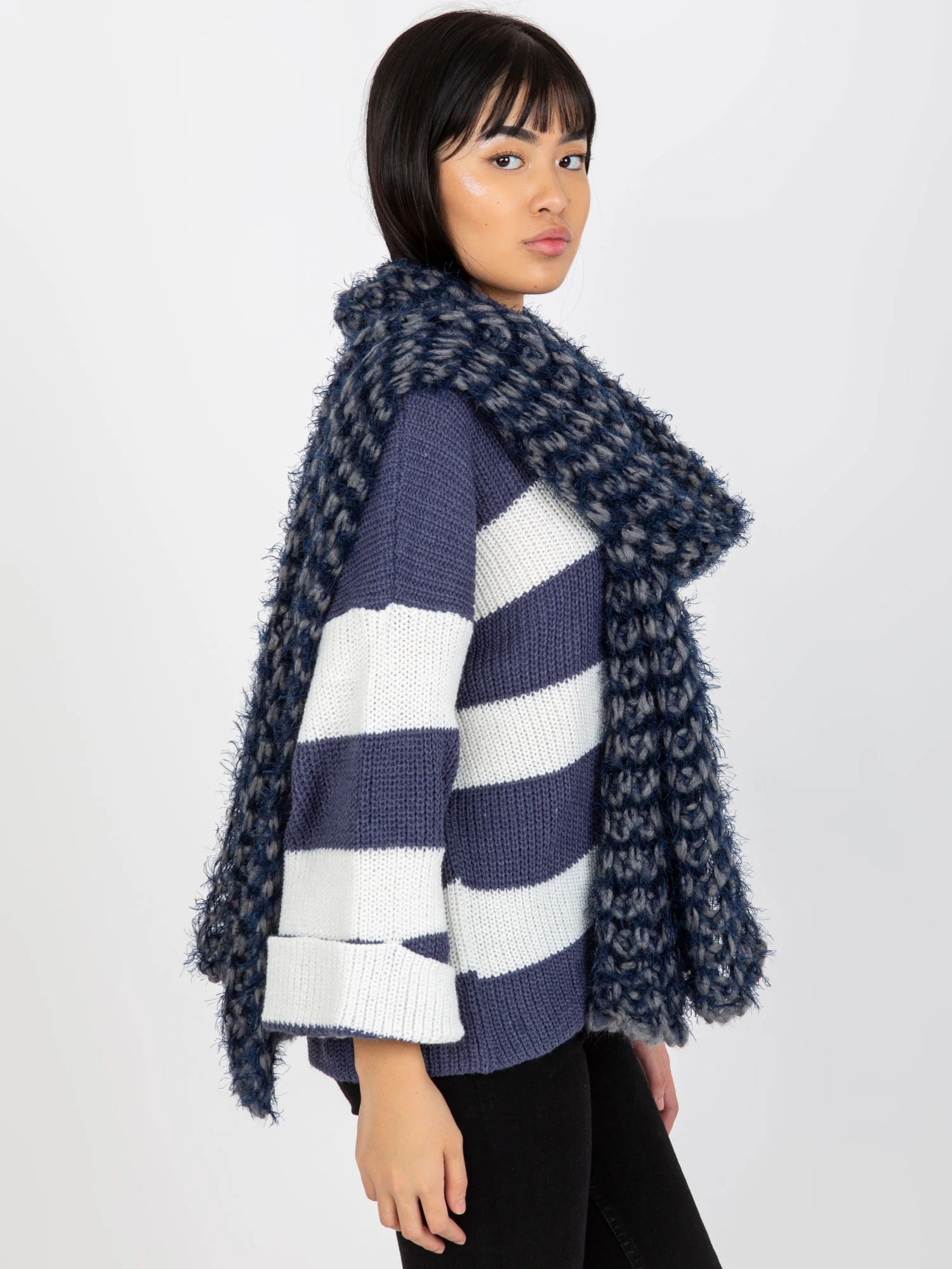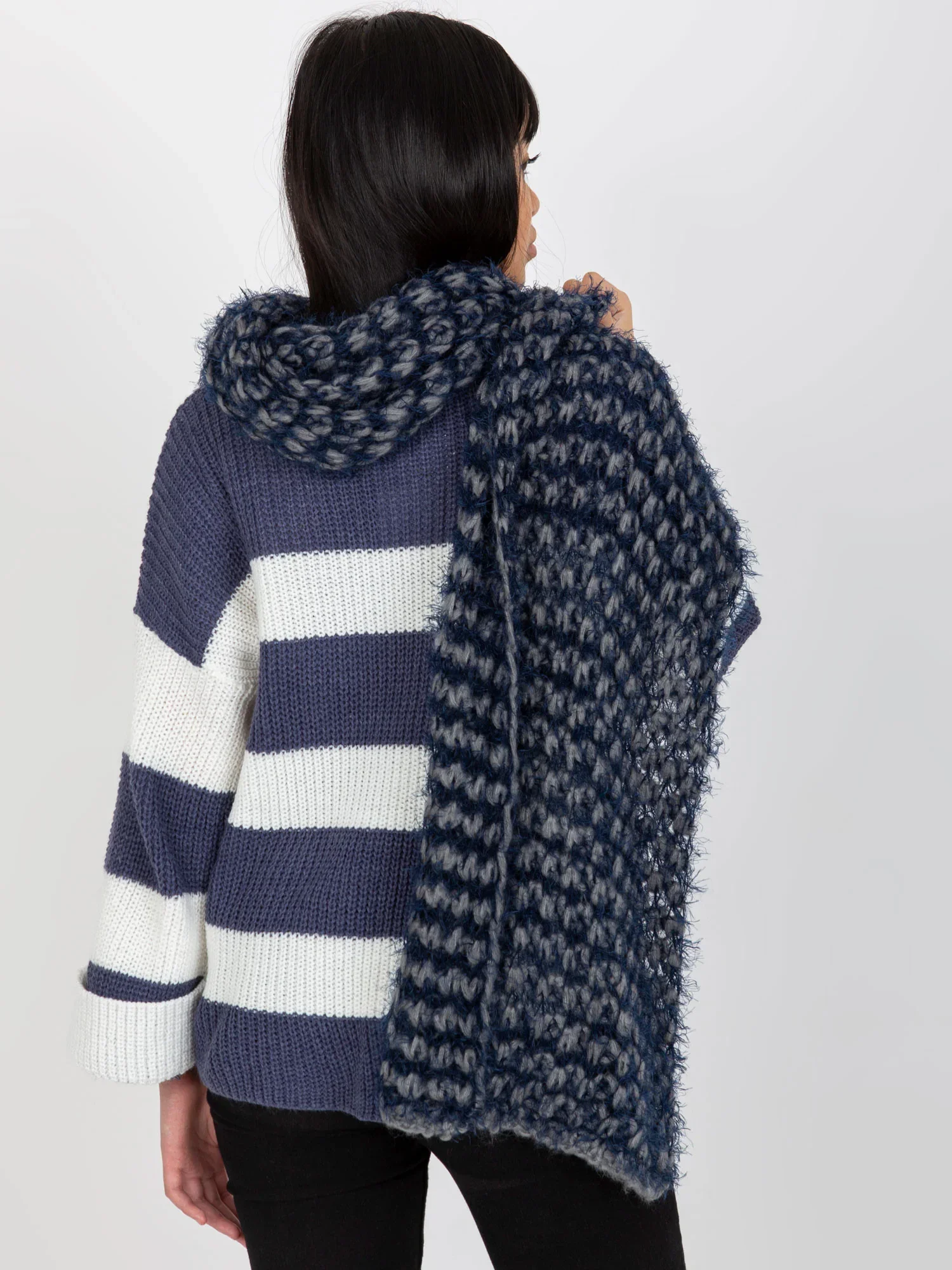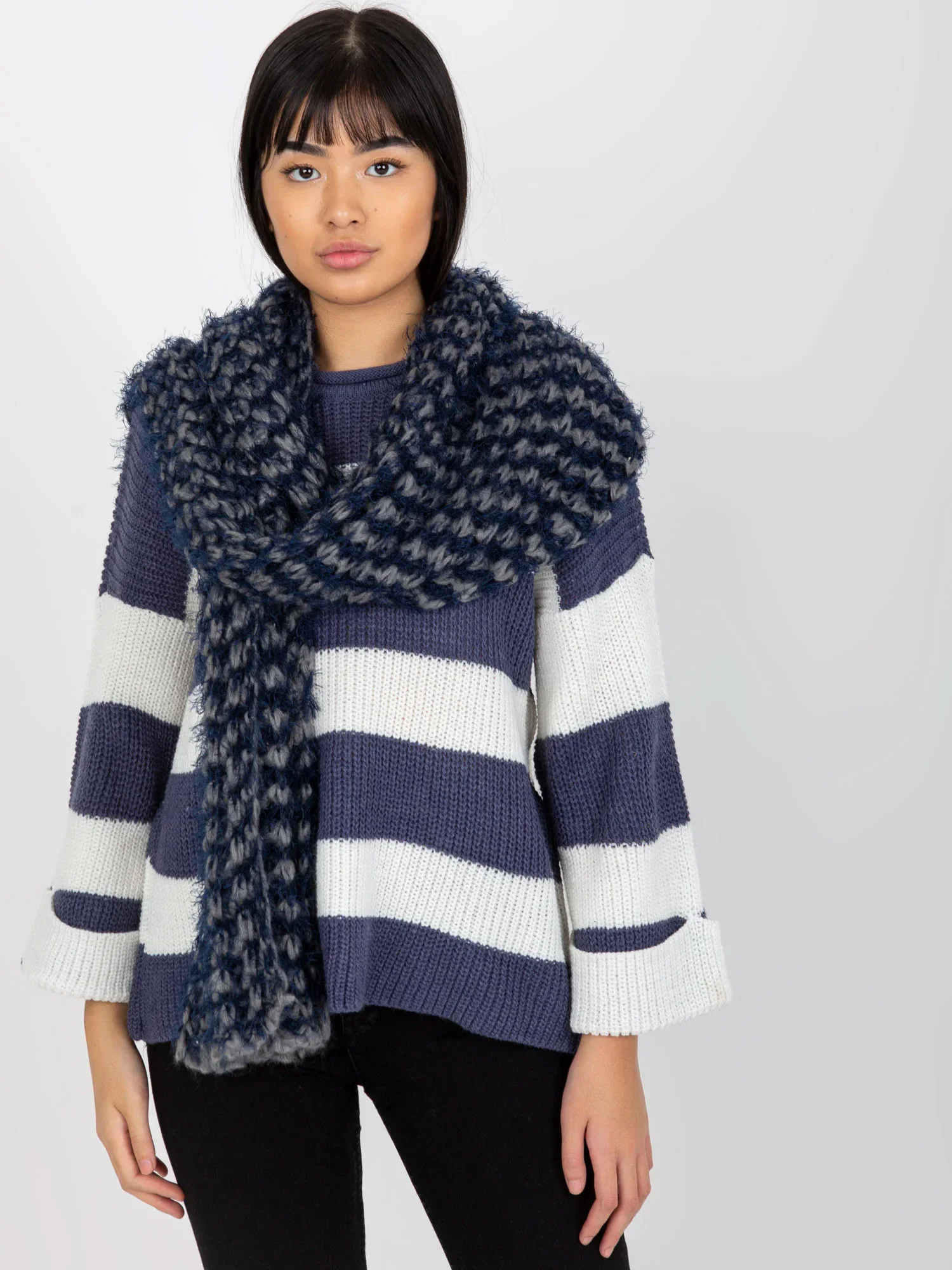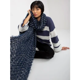 Šedá a tmavě modrá pletená dámská zimní šála .