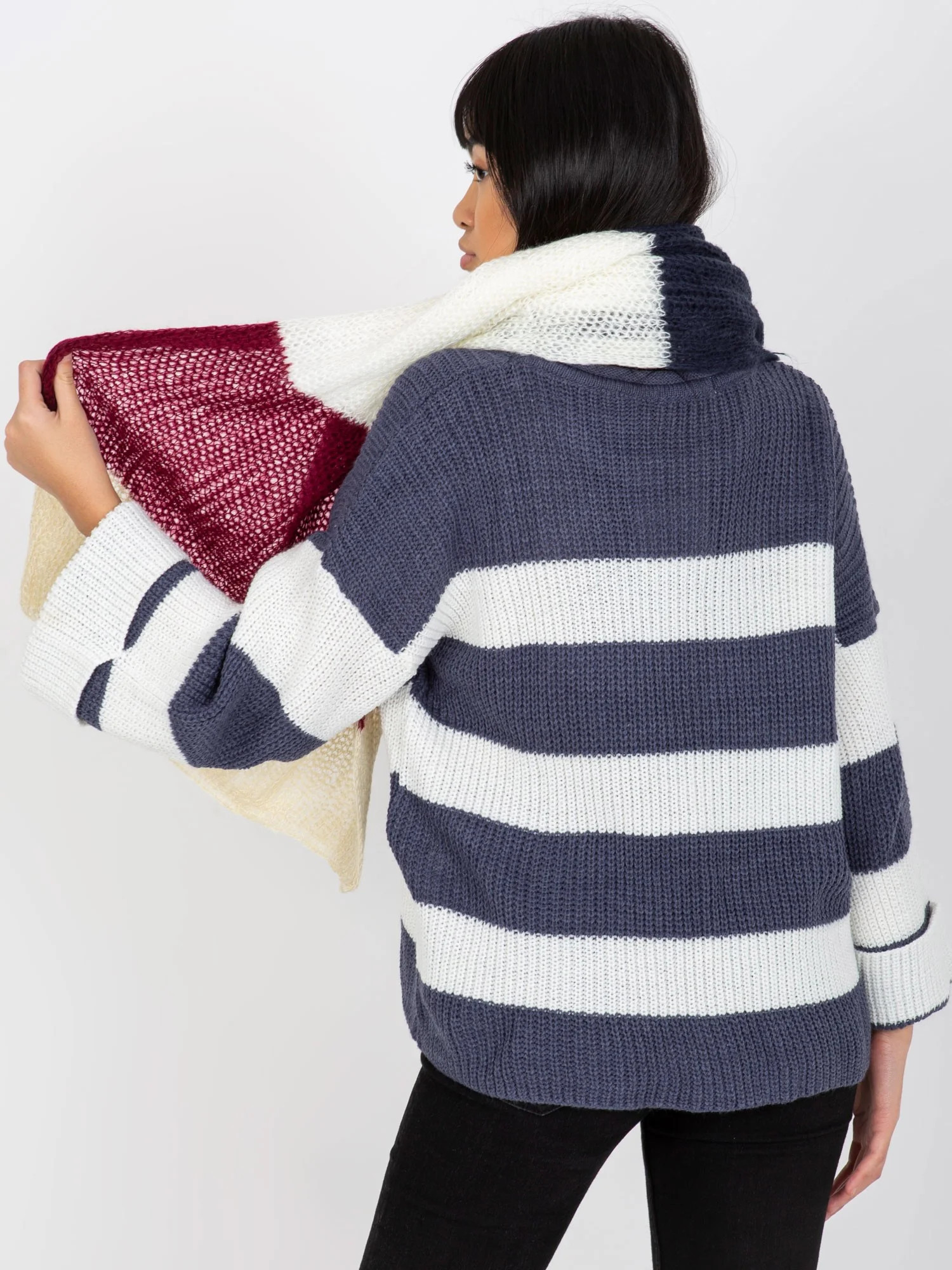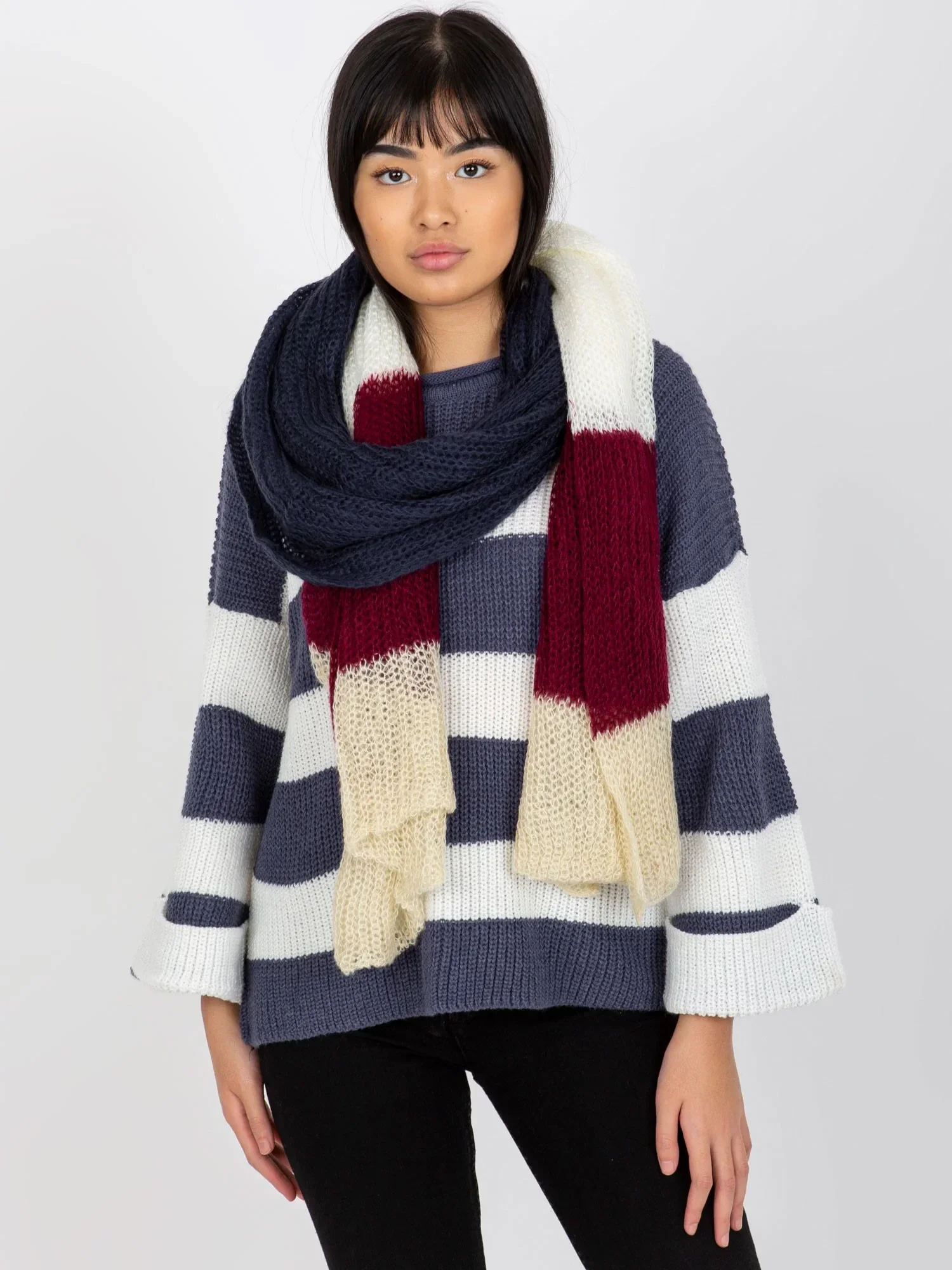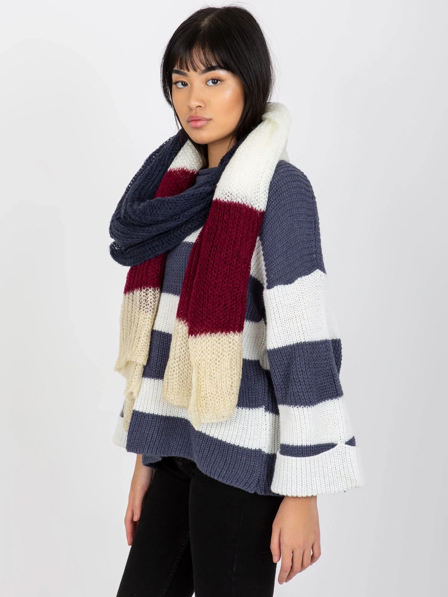Dámský pletený šátek v barvě ecru-bordeaux .