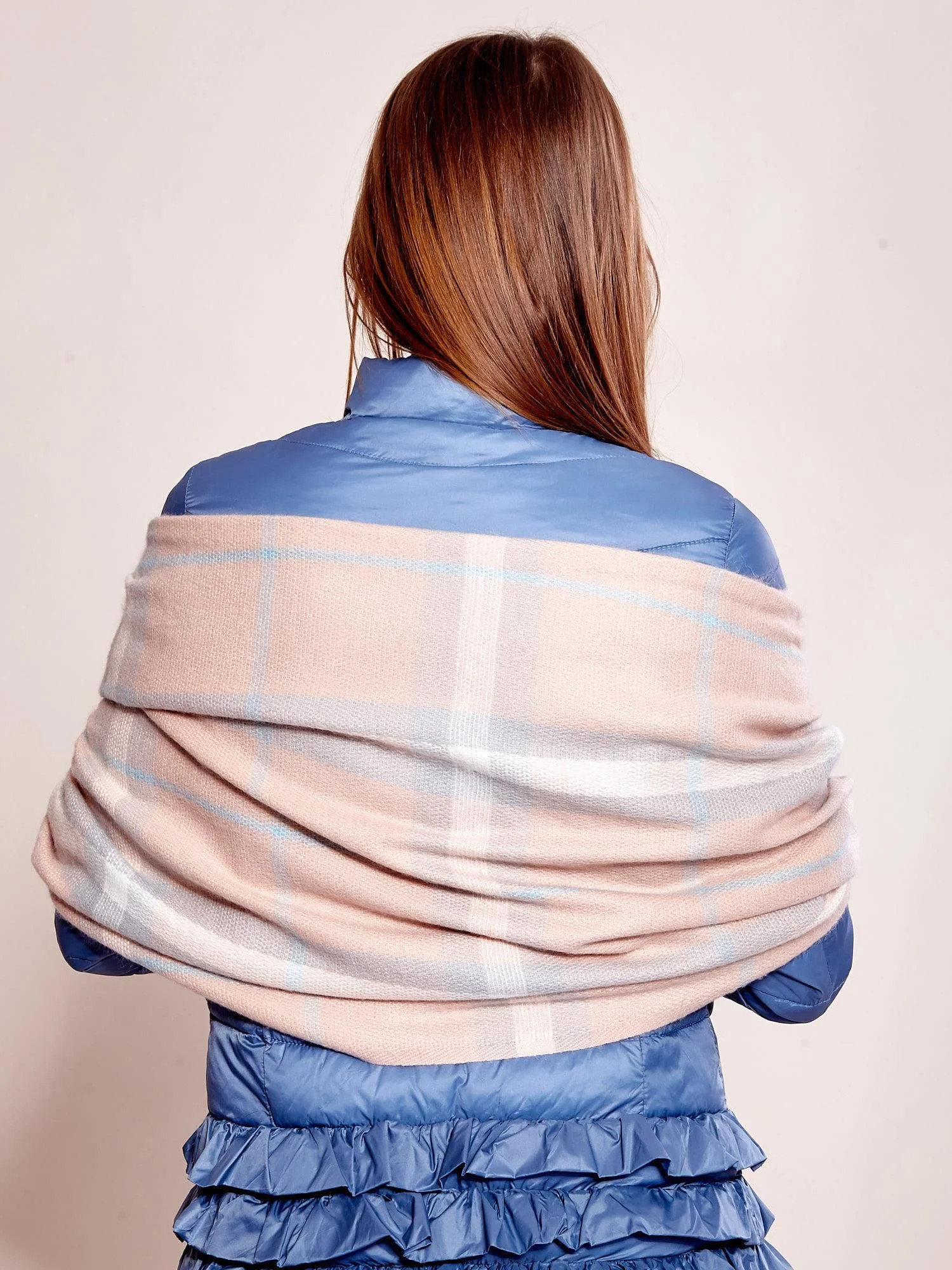 Růžový a šedý kostkovaný šátek s třásněmi