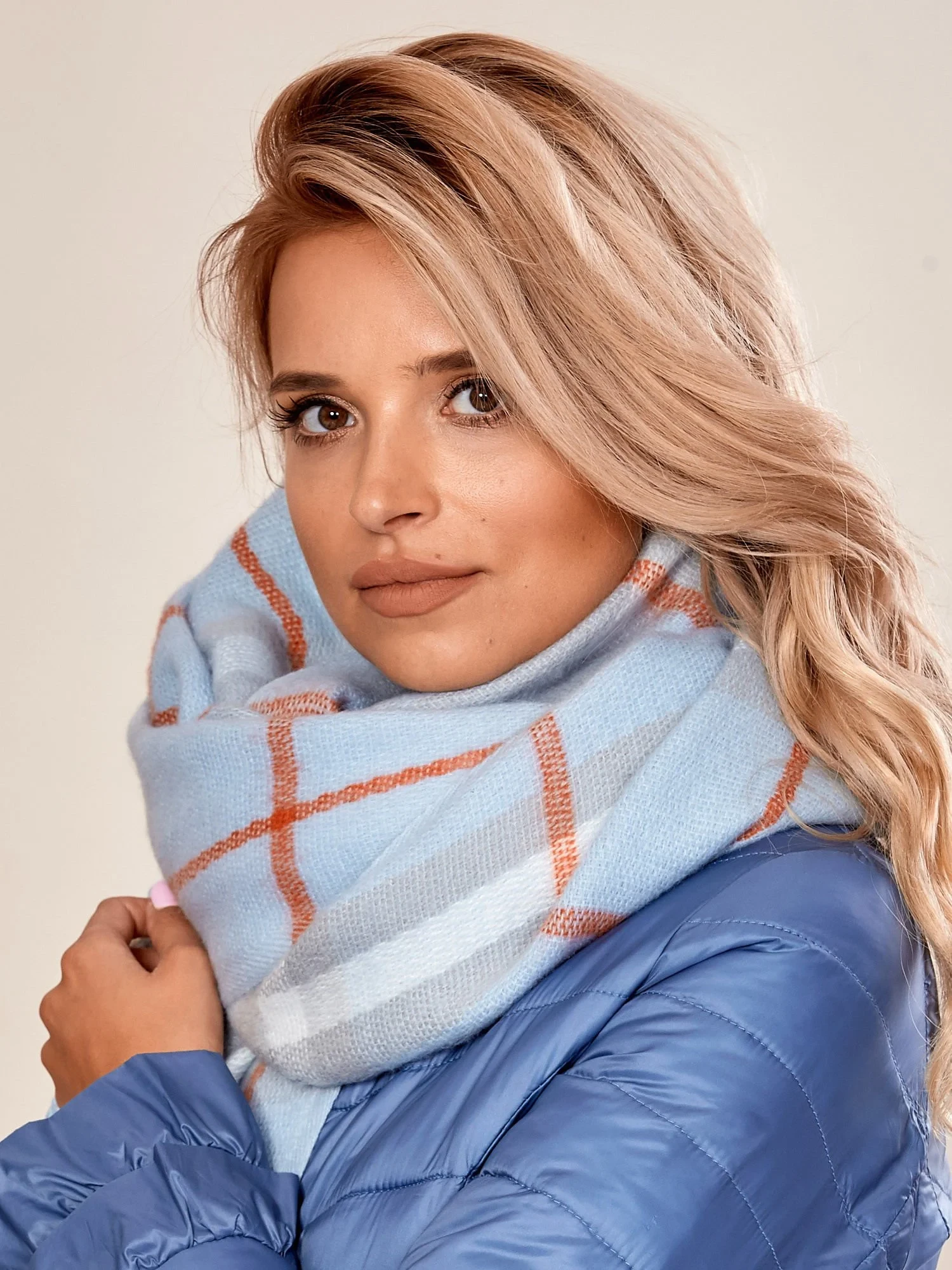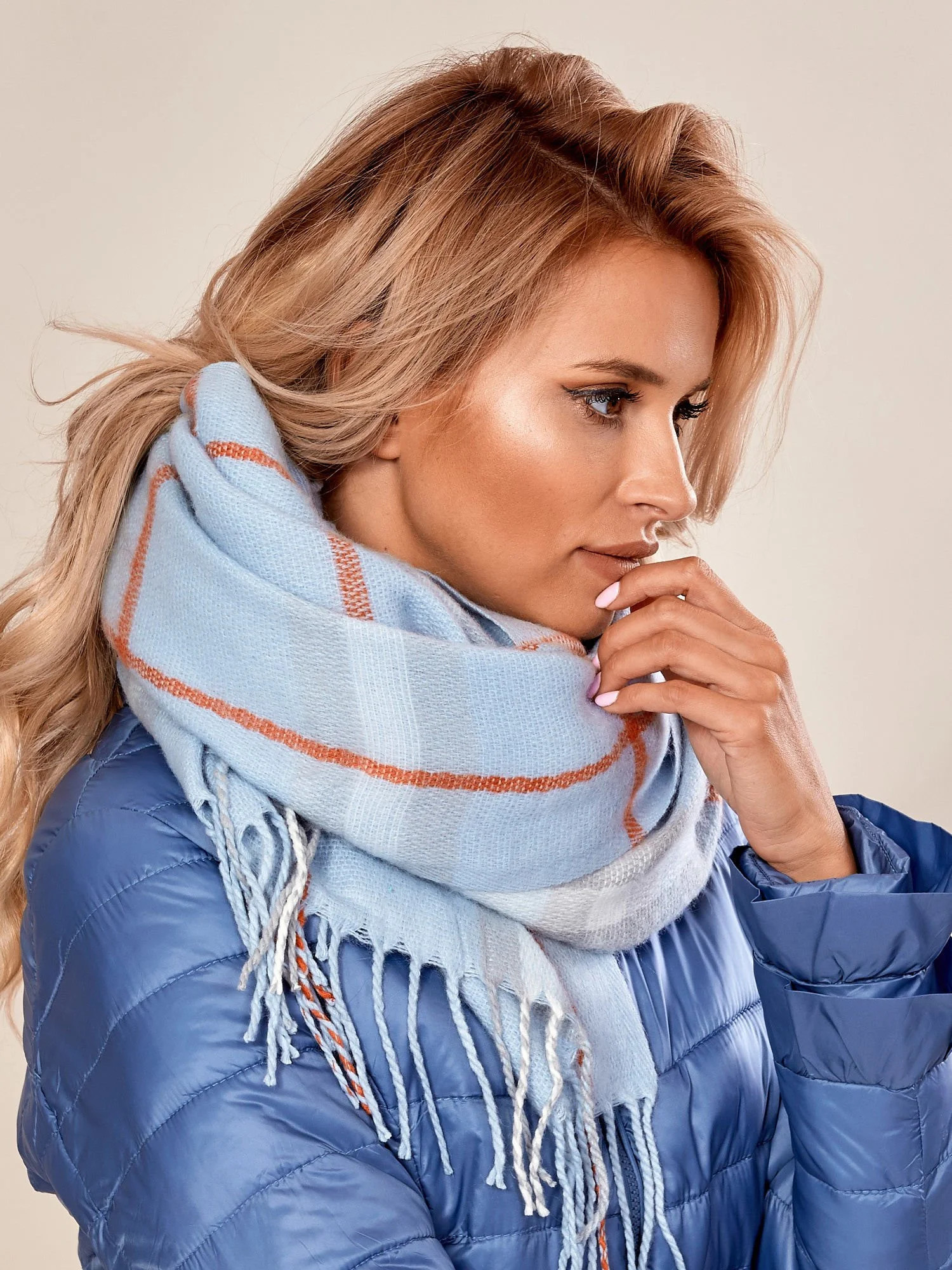 Světle modrý kostkovaný šátek s třásněmi