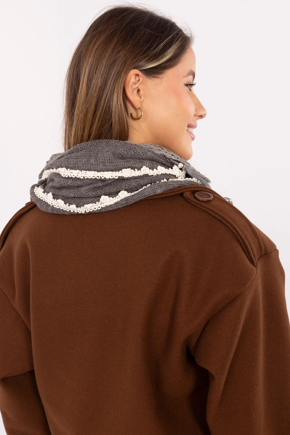 Elegantní a ženský trojúhelníkový šátek s různorodou strukturou materiálu, vyrobený z jemné viskózy, která je příjemná na dotek a lehká. Model o délce 52 cm a šířce 152 cm se skvěle nosí na ramenou, dodávají styl každému outfitu. Šátek zdobí krajkové detaily a řetízky s perlami, které mu dodávají jemný, romantický charakter. Ideální na každý den i na speciální příležitosti, krásně doplní jak elegantní kabát, tak i casualovou bundu.