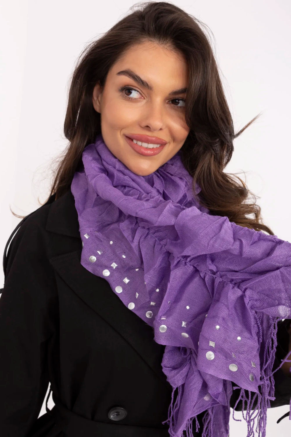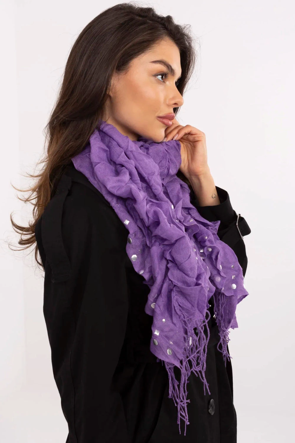 Elegantní šátek s frčkami a ozdobnými nitěmi je efektním doplňkem, který skvěle doplní jak denní, tak výraznější stylizace. Vyrobený z lehké a příjemné viskózy se hebkou texturou se jemně skládá na krku nebo ramenou, poskytujíc pohodlné nošení. Model o rozměrech přibližně 134 cm délky a 47 cm šířky nabízí mnoho možností stylizace, lze ho nosit klasicky, volně přehozený nebo uvázaný různými způsoby. Dekorativní frčky a decentní nitě dodávají šátku módní charakter a přitahují oko, činí ho výjimečným akcentem každé stylizace.