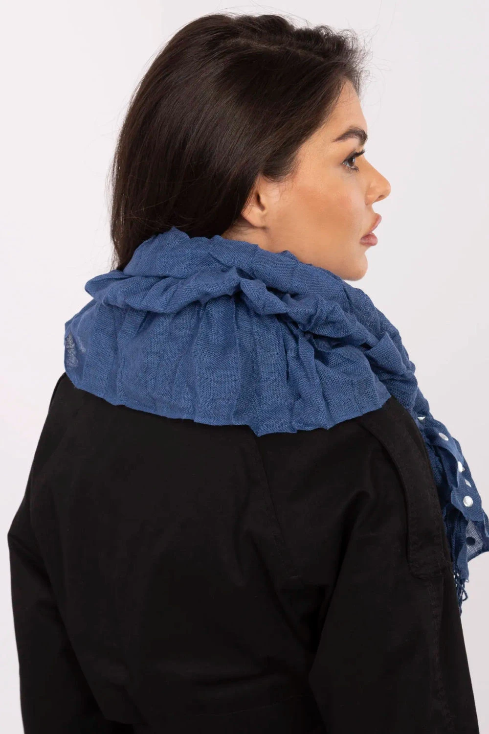 Elegantní šála s franžlemi a ozdobnými nýty je efektním doplňkem, který skvěle doplní jak každodenní, tak výraznější styling. Vyrobená z lehké a příjemné viskózy, jemně se usazuje na krku nebo ramenou, poskytujíc pohodlné nošení. Model o rozměrech asi 134 cm délky a 47 cm šířky nabízí mnoho možností stylingu, lze nosit klasicky, volně přehozenou nebo svázanou různými způsoby. Dekorativní franže a decentní nýty dodávají šále módní charakter a upoutávají pozornost, činí ji výjimečným akcentem každého stylingu.