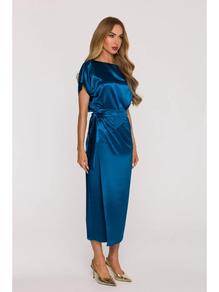 97% polyester 3% elastan MATERIÁL Tkanina: satén - hladký, lesklý PODROBNOSTI O PRODUKTU Výstřih: lodičkový výstřih Rukávy: krátké, volné Sukně: zavinovací ve stylu pareo zavazující se kolem pasu Zapínání: zavazování v pase Podšívka: žádná Model: M887 Navrženo a vyrobeno v Polsku Modelka na fotografii měří 171 cm a má na sobě velikost S STYL A STŘIH Styl: elegantní saténové midi šaty Tvar: volný top, který lze zastrčit do sukně nebo nosit přes ni, zavinovací sukně ve stylu pareo zavazující se kolem pasu Délka: midi