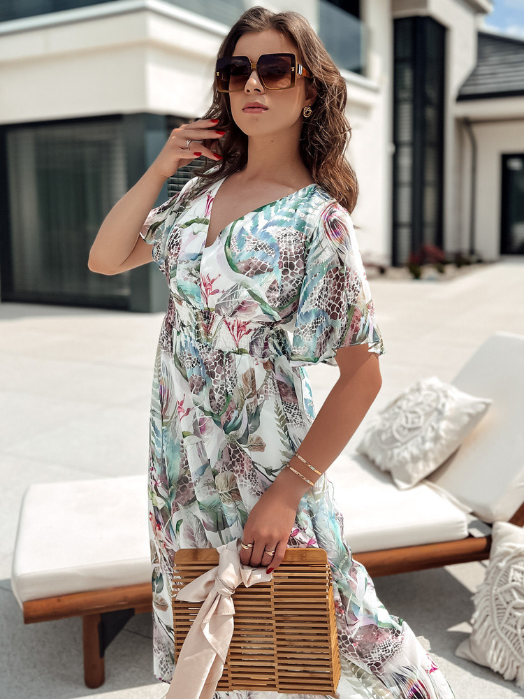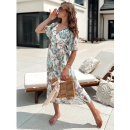 Wyjątkowa sukienka MIDI ARABELLA w modny kwiecisty wzór to absolutny MUST HAVE w każdej letniej garderobie. Przepięknie wycięty dekolt na zakładkę prezentuje się bardzo kobieco, a falbany przy rękawach nadają delikatności i lekkości. Model posiada delikatną podszewkę oraz gumkę w pasie, która perfekcyjnie wyeksponuje talię. To zdecydowanie idealny wybór do stworzenia fantastycznych stylizacji na większe i mniejsze okazje. Dodaj sukienkę ARABELLA do swojej kolekcji i ciesz się jej urokiem każdego dnia!