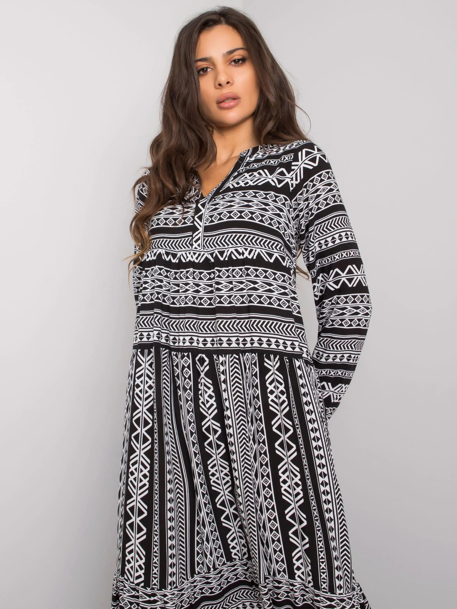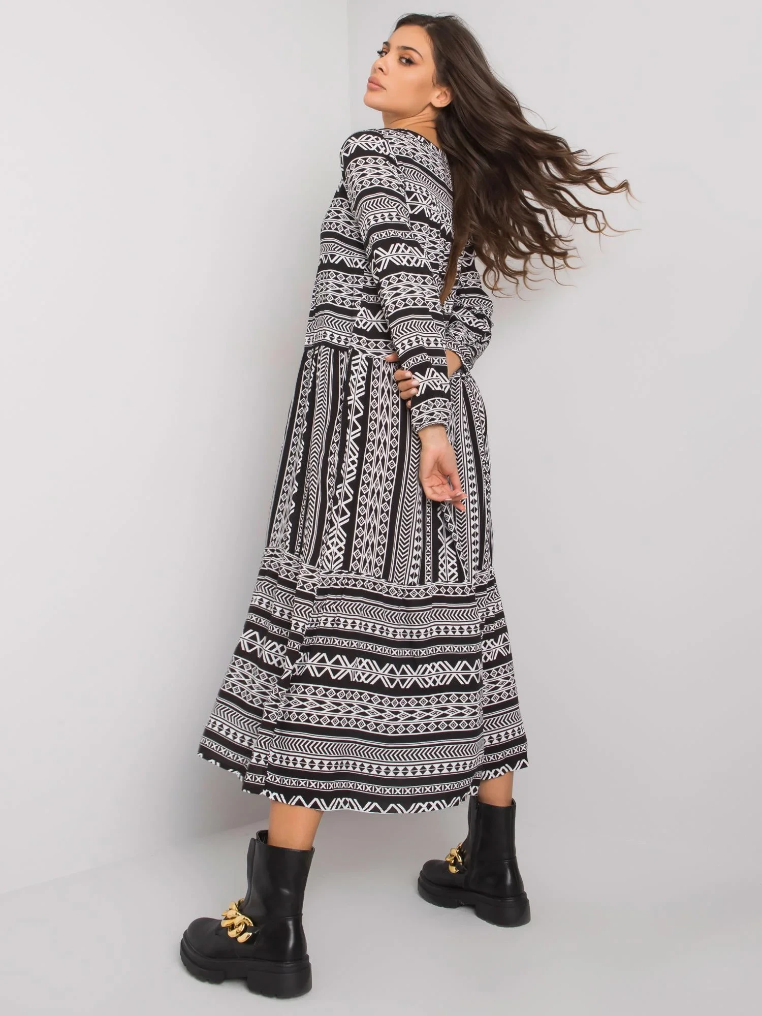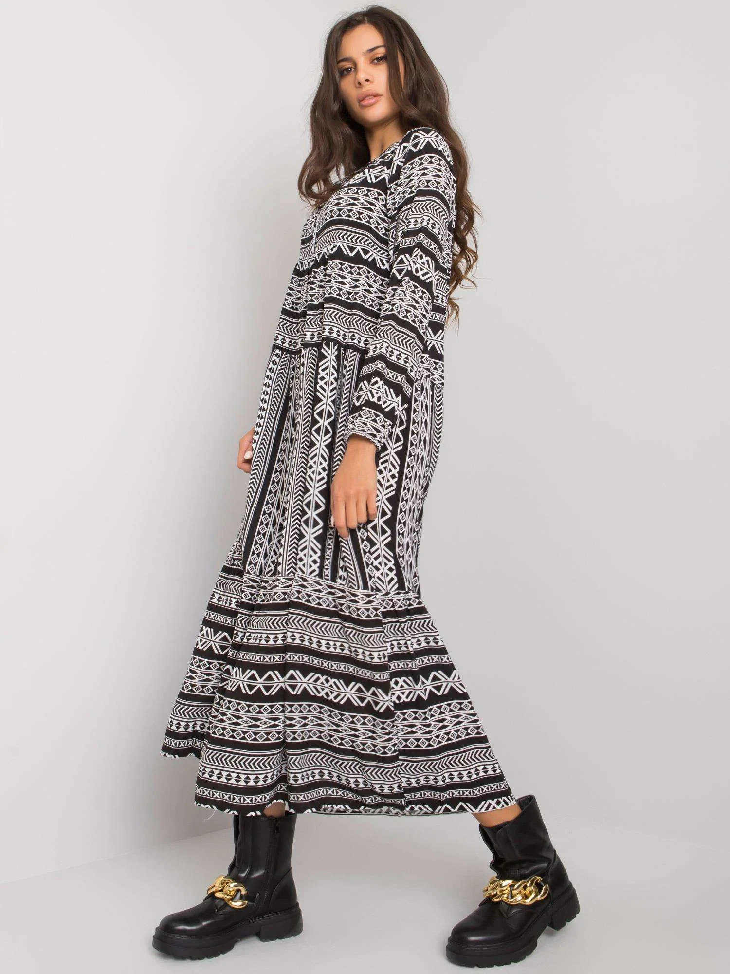 Černé maxi šaty s geometrickými vzory.