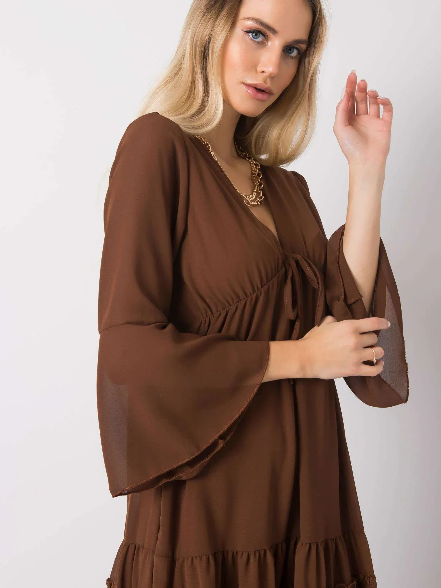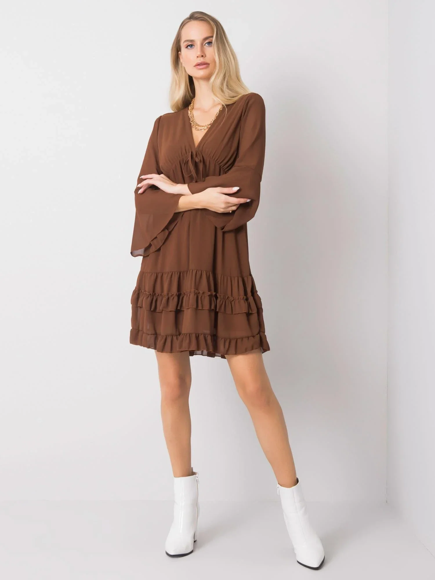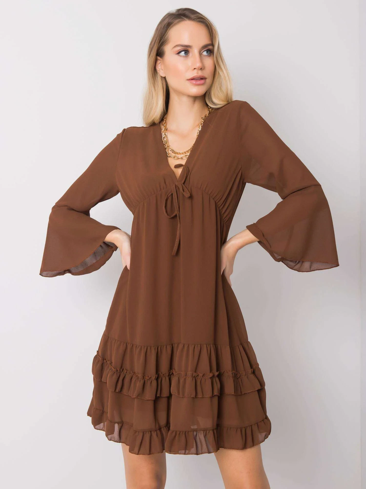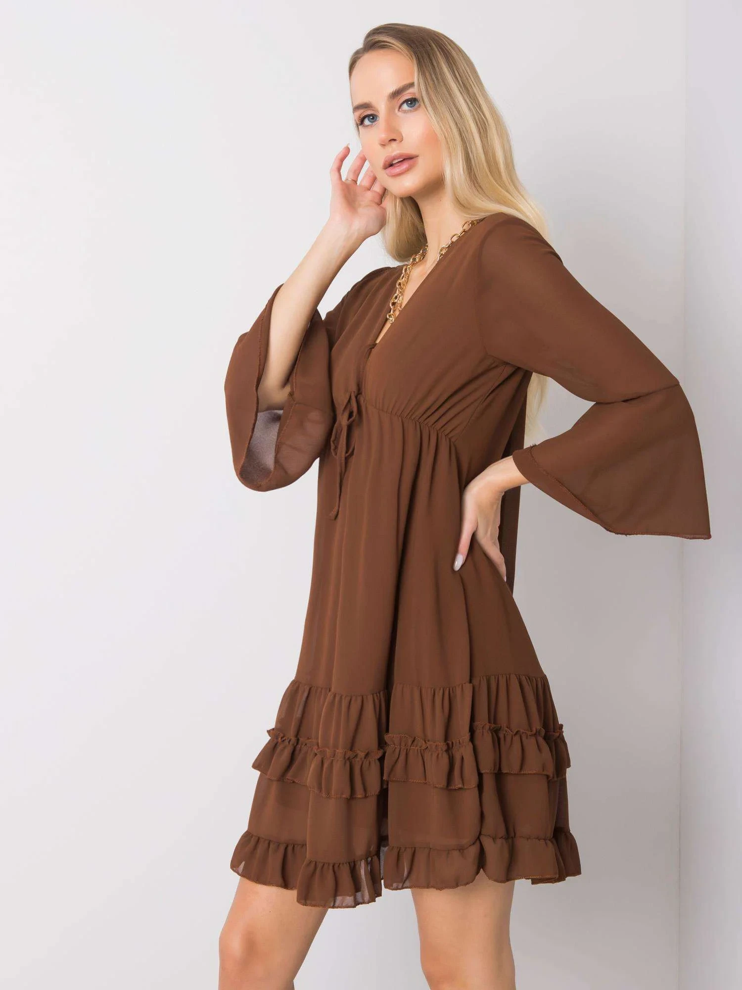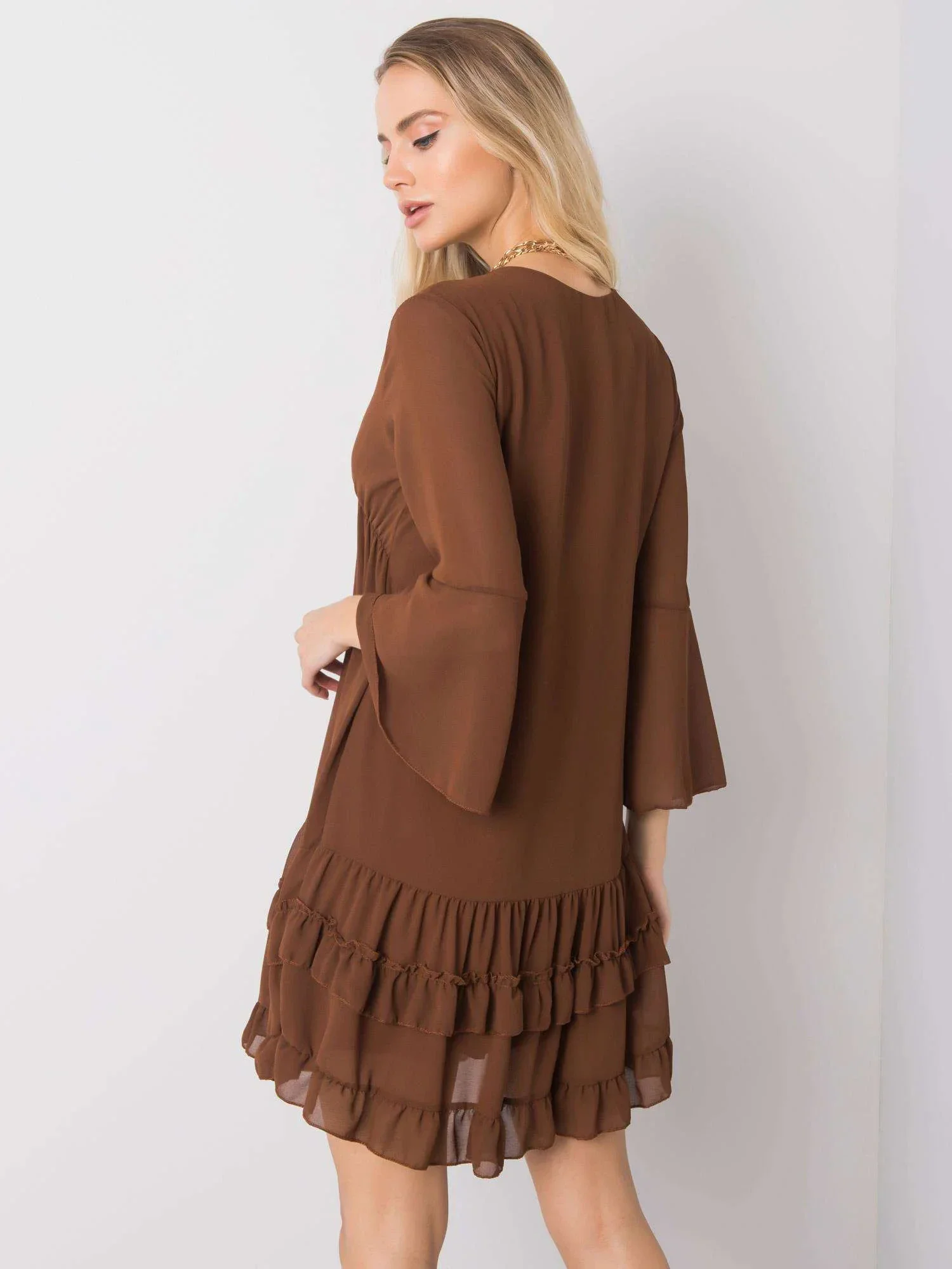 Hnědé šaty s volánky.