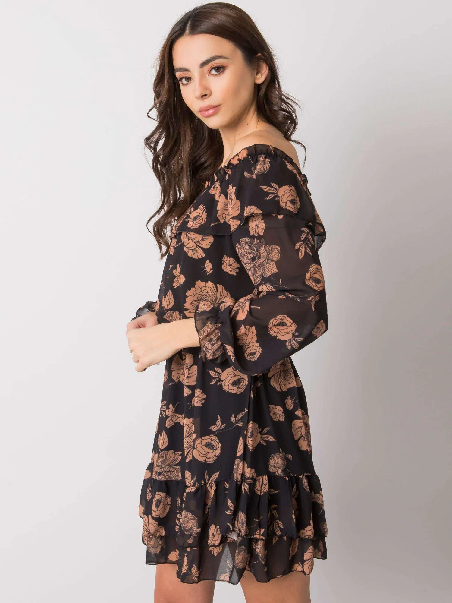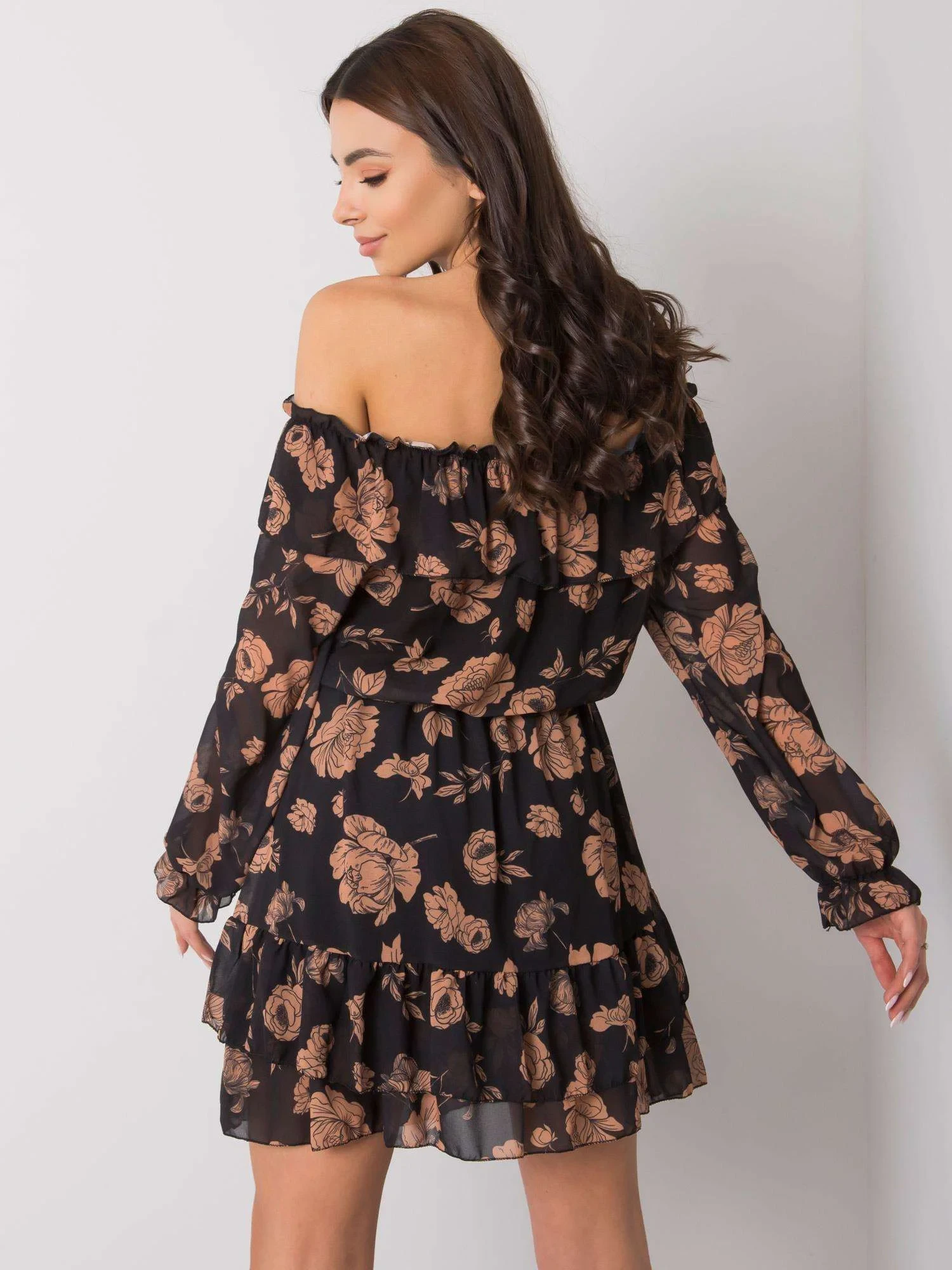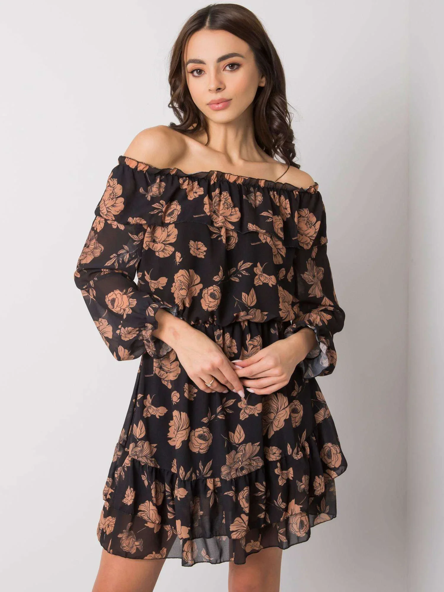 Černo-kamenné šaty se španělským výstřihem.