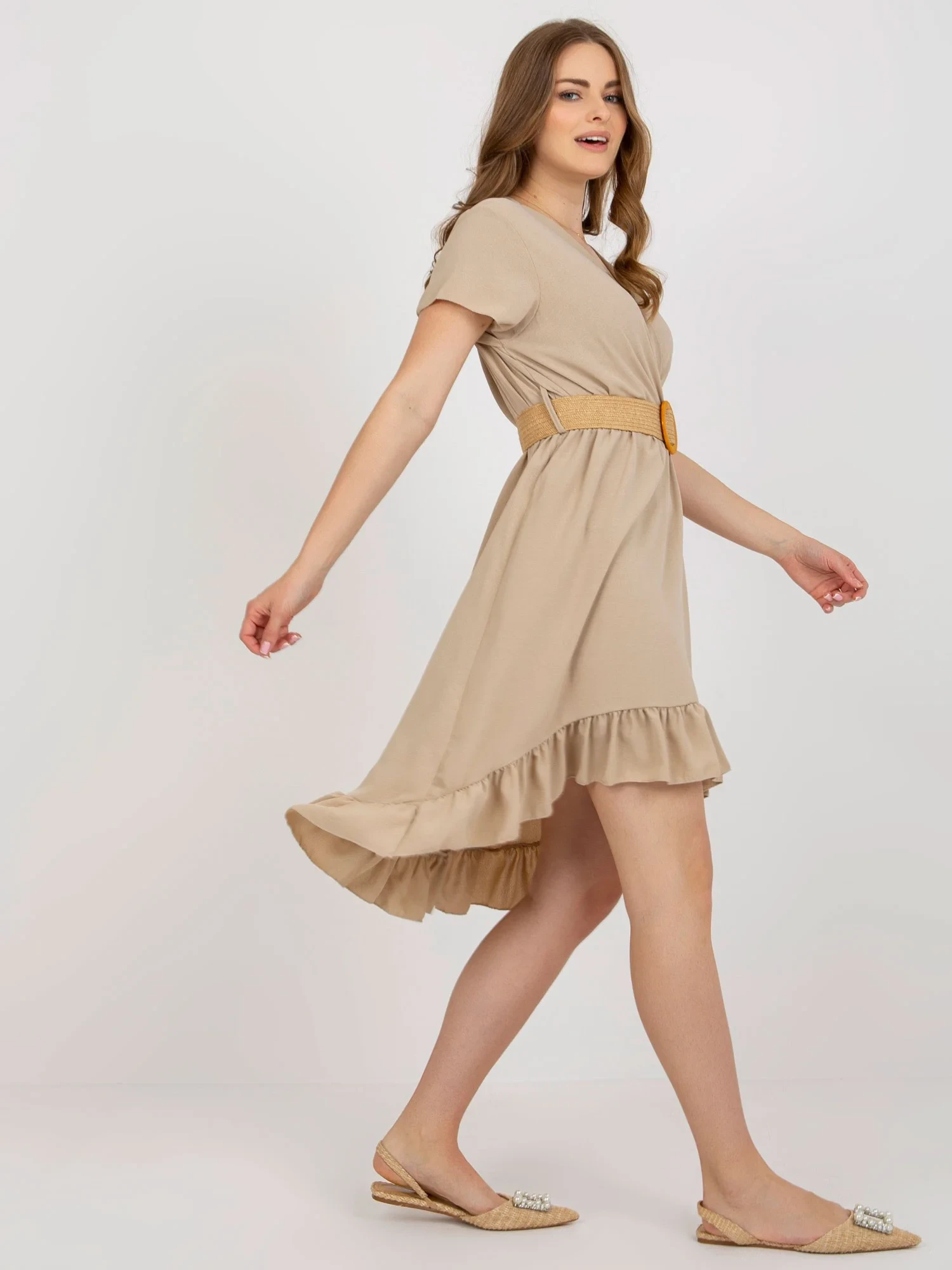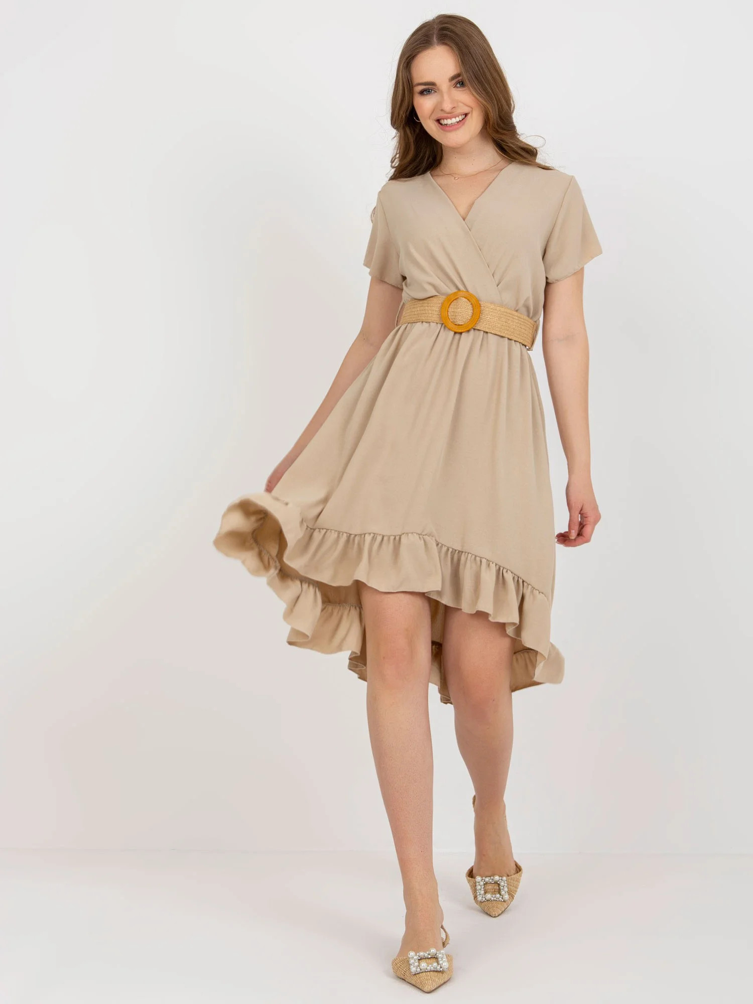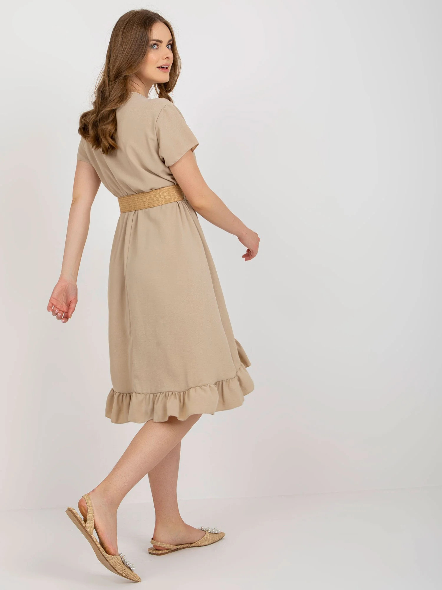 Béžové šaty s volánkem a páskem .