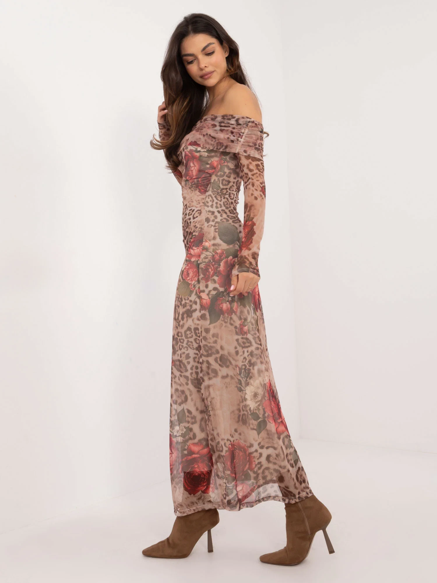 Wymiary sukienki w rozmiarze one size mierzone na płasko: szerokość pod pachami - 44 cm, długość całkowita - 141 cm, długość rękawa - 58 cm..