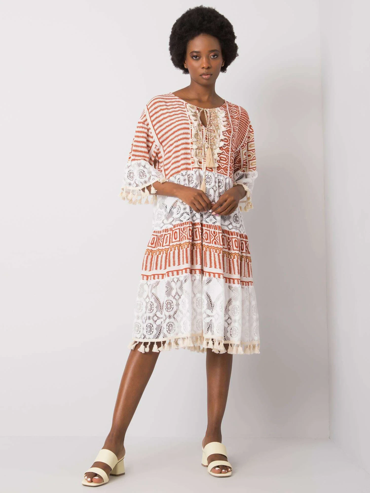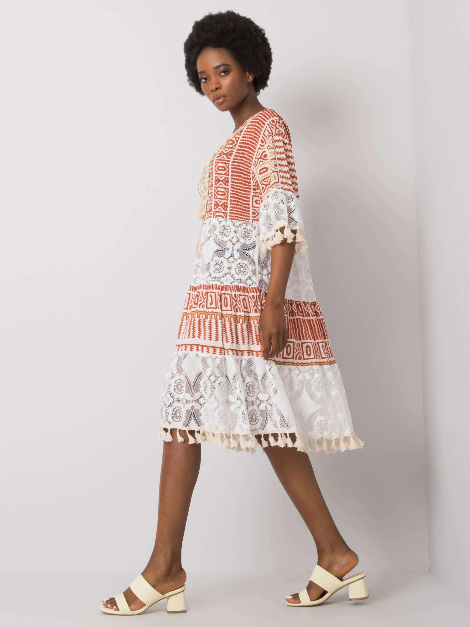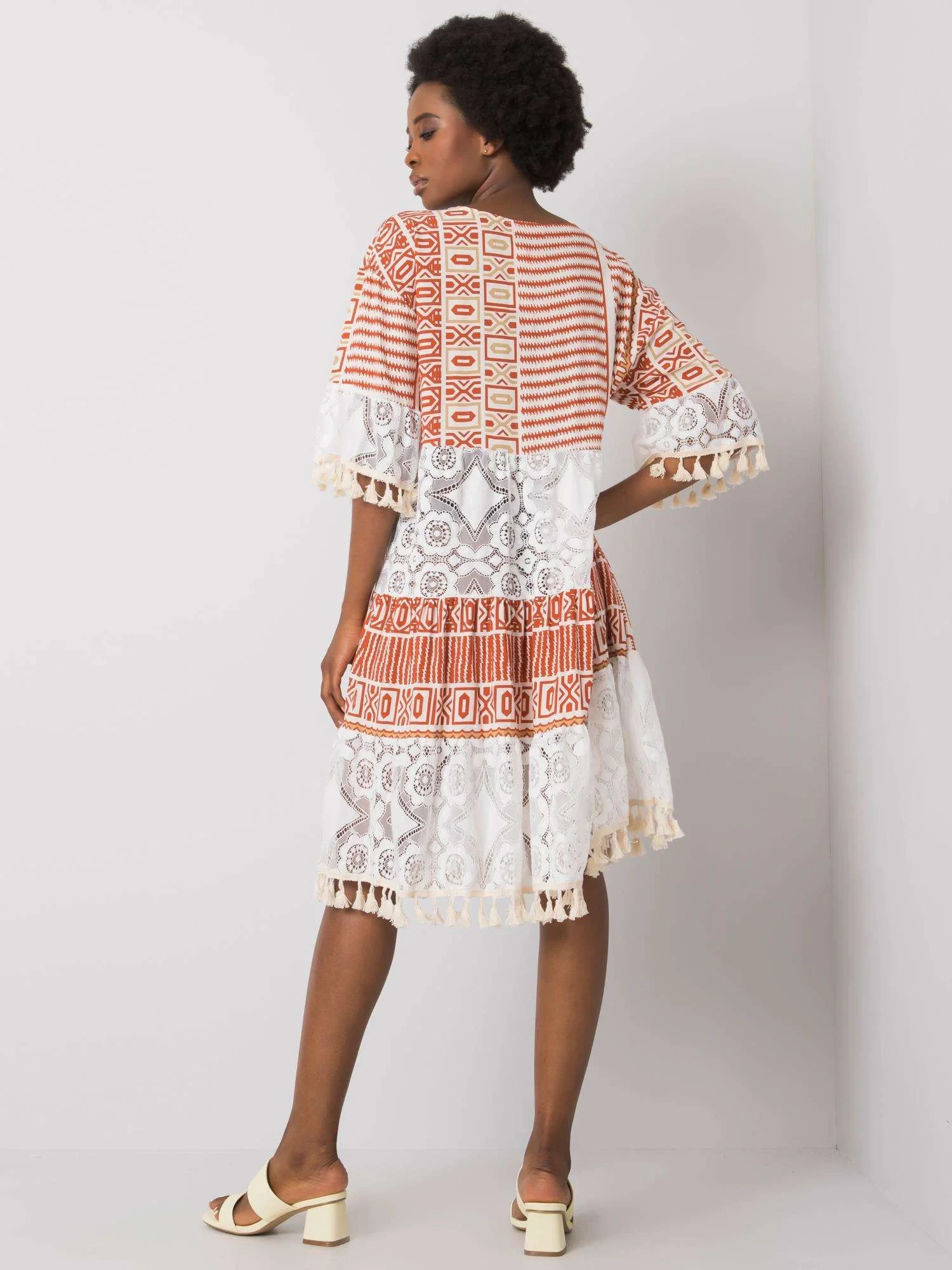 Tmavě oranžové šaty s krajkou.
