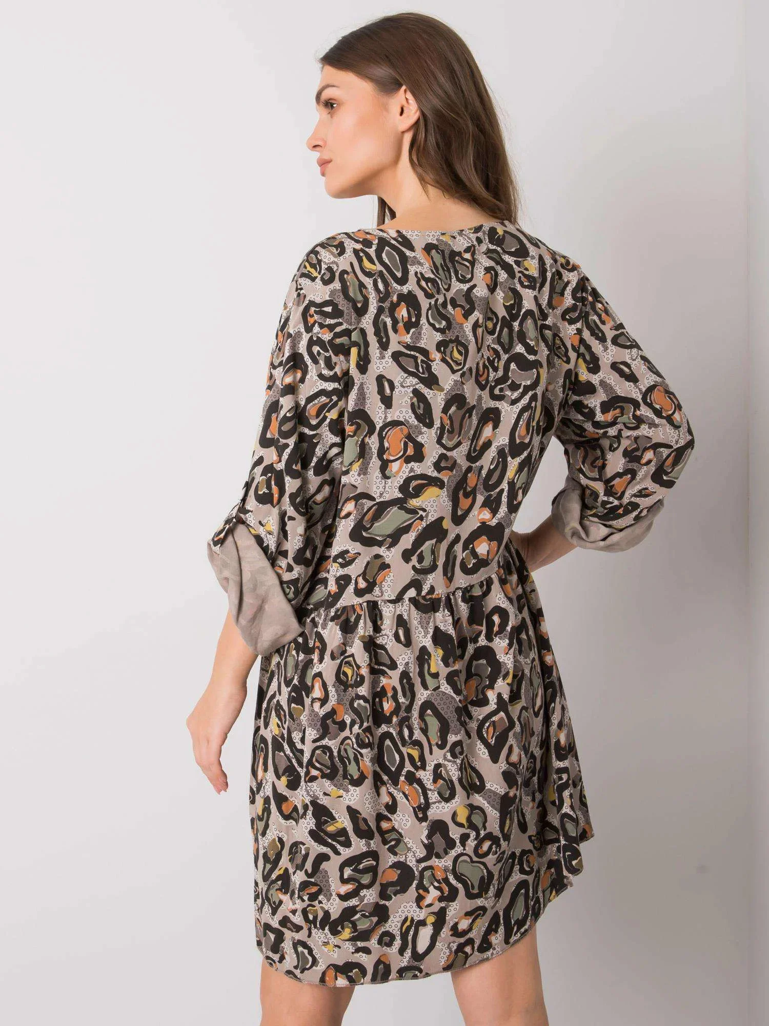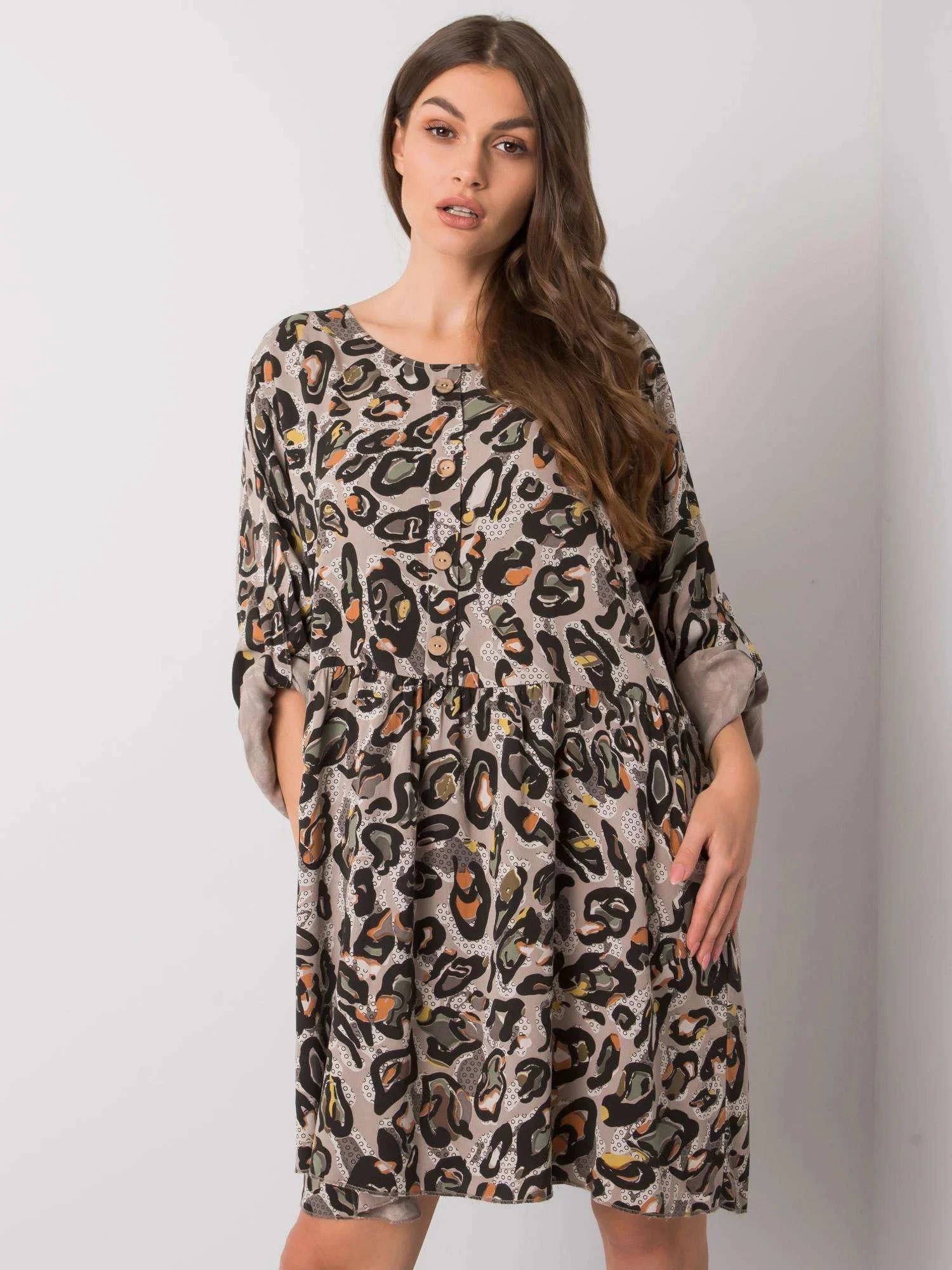 Šedé dámské vzorované šaty.