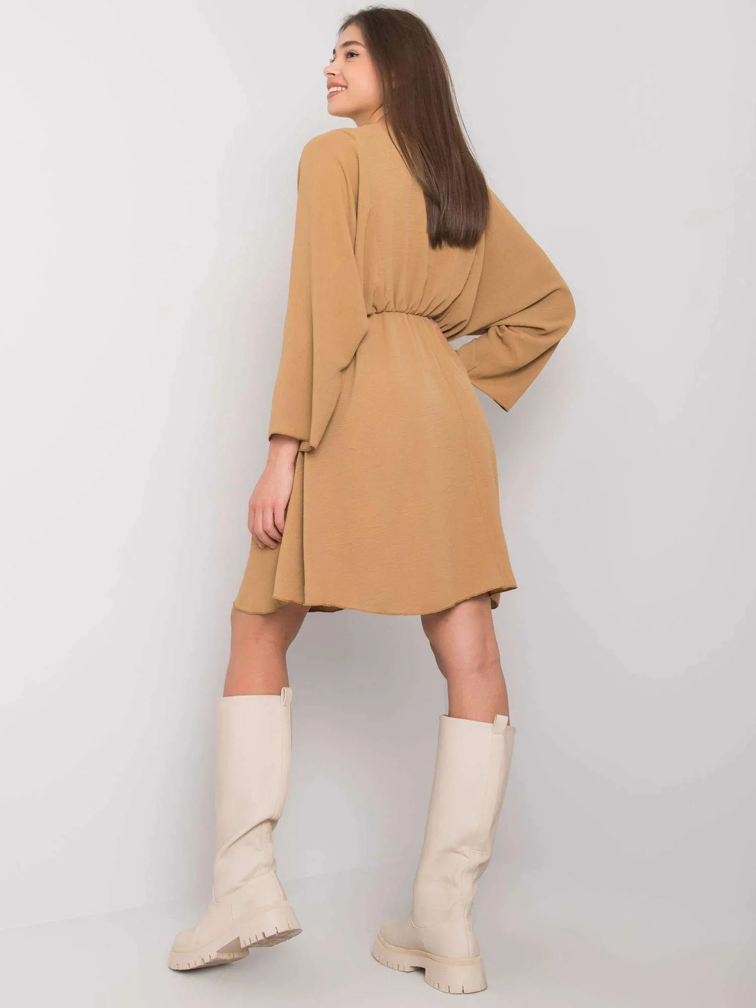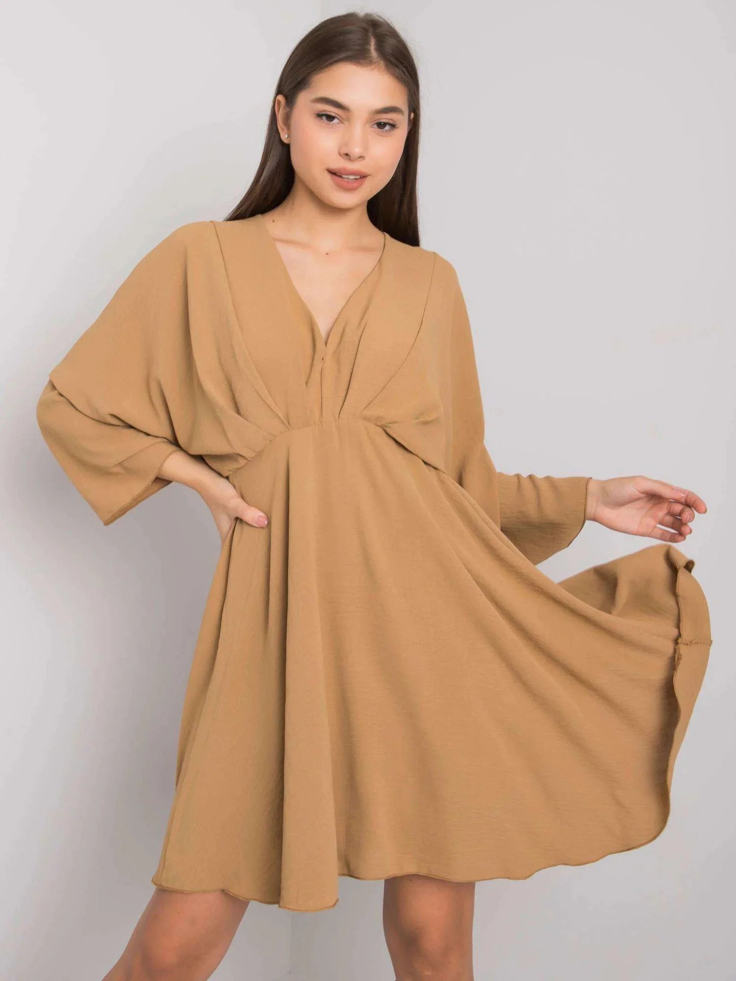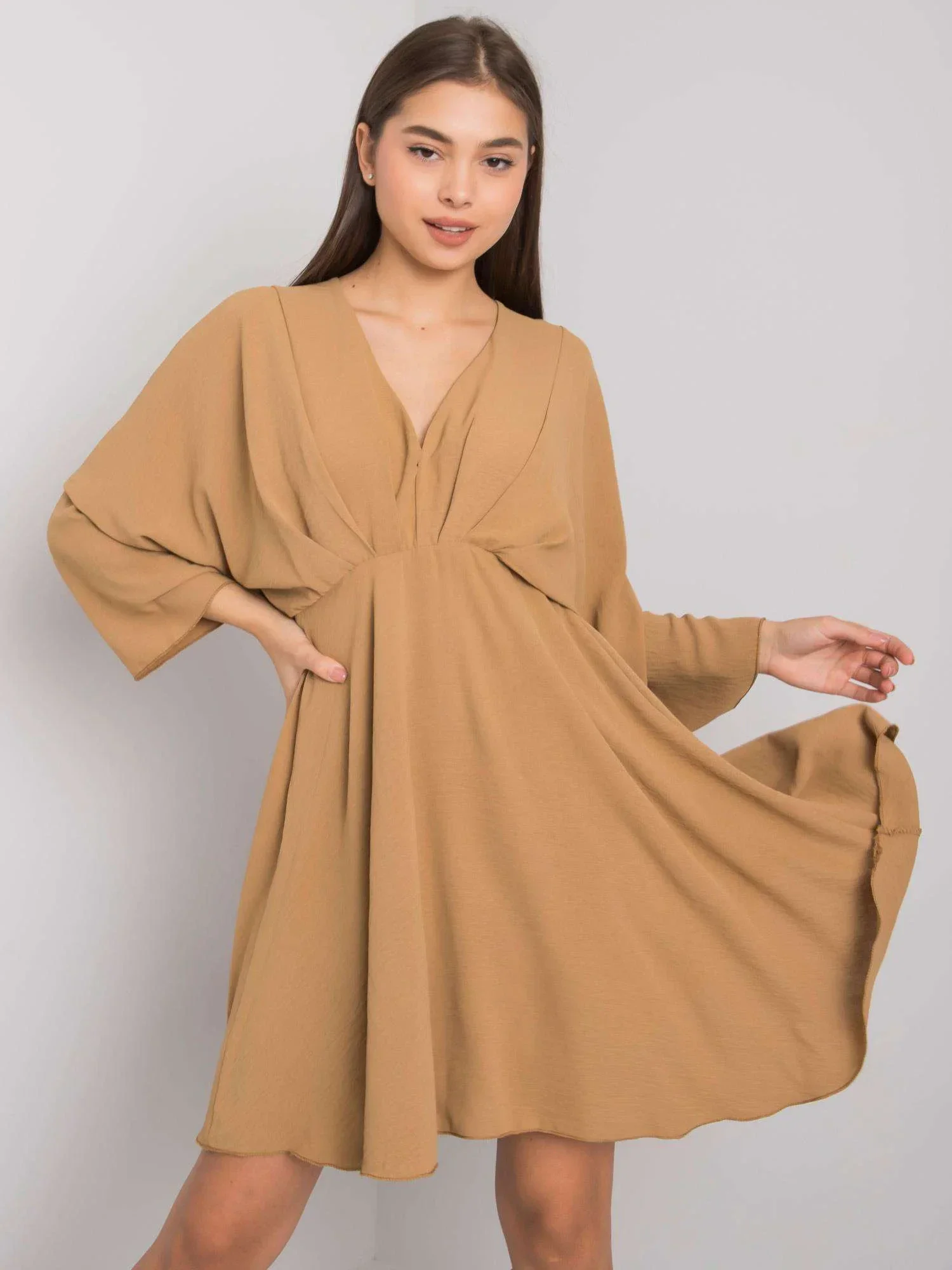 Tmavě béžové šaty s trojúhelníkovým výstřihem.