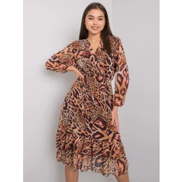Světle hnědé vzorované šaty s volánem.