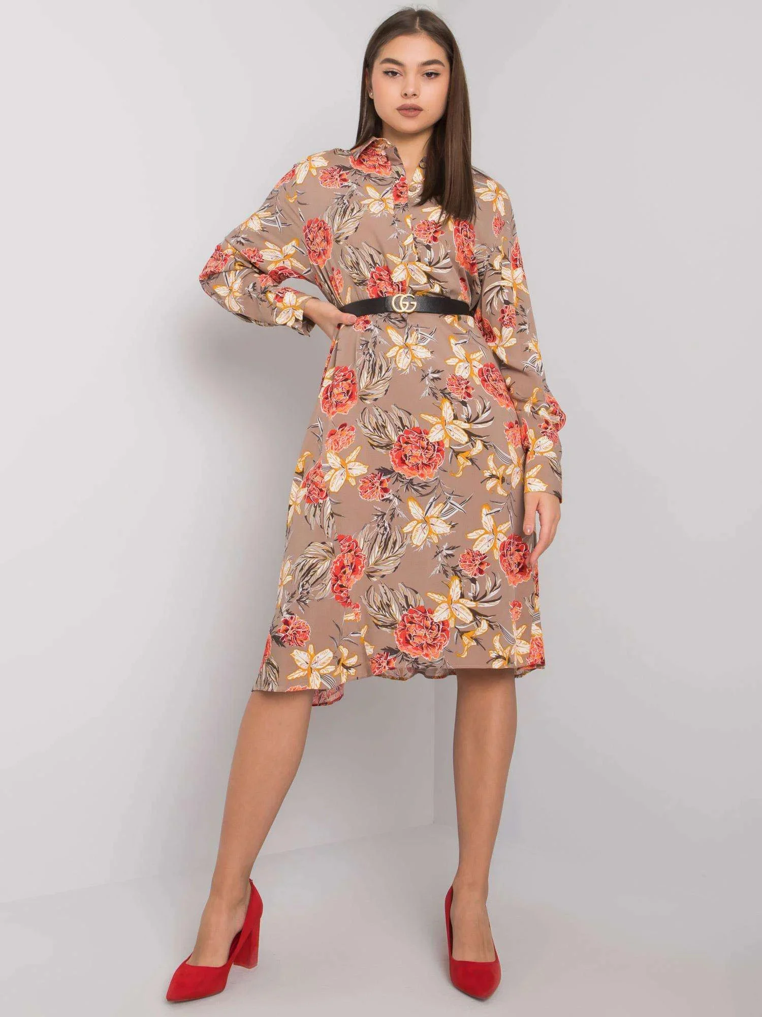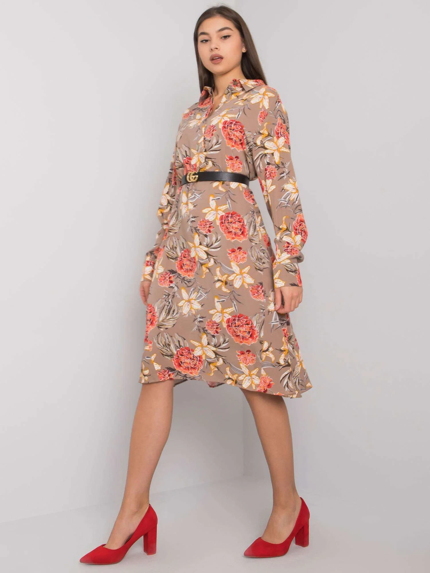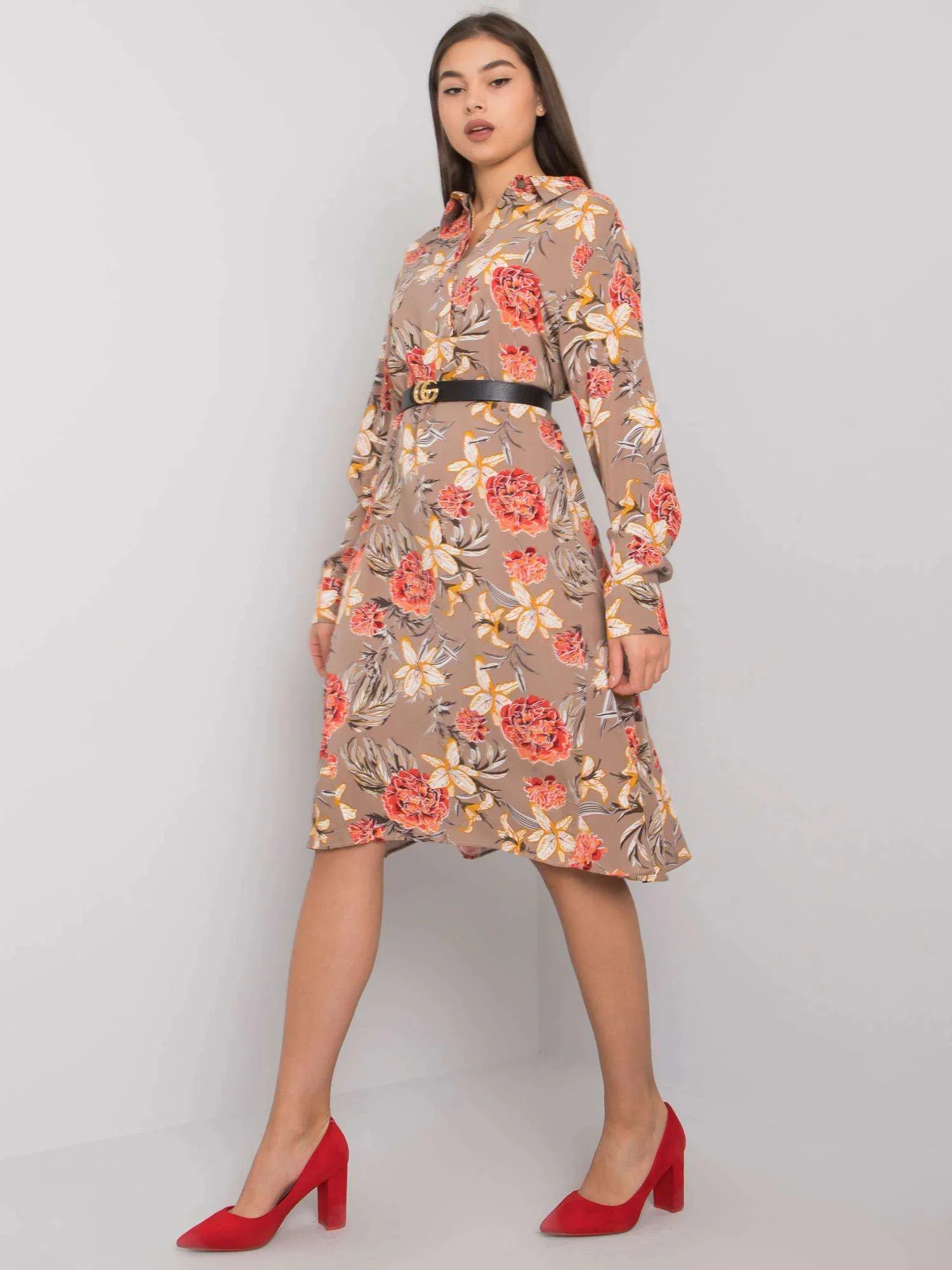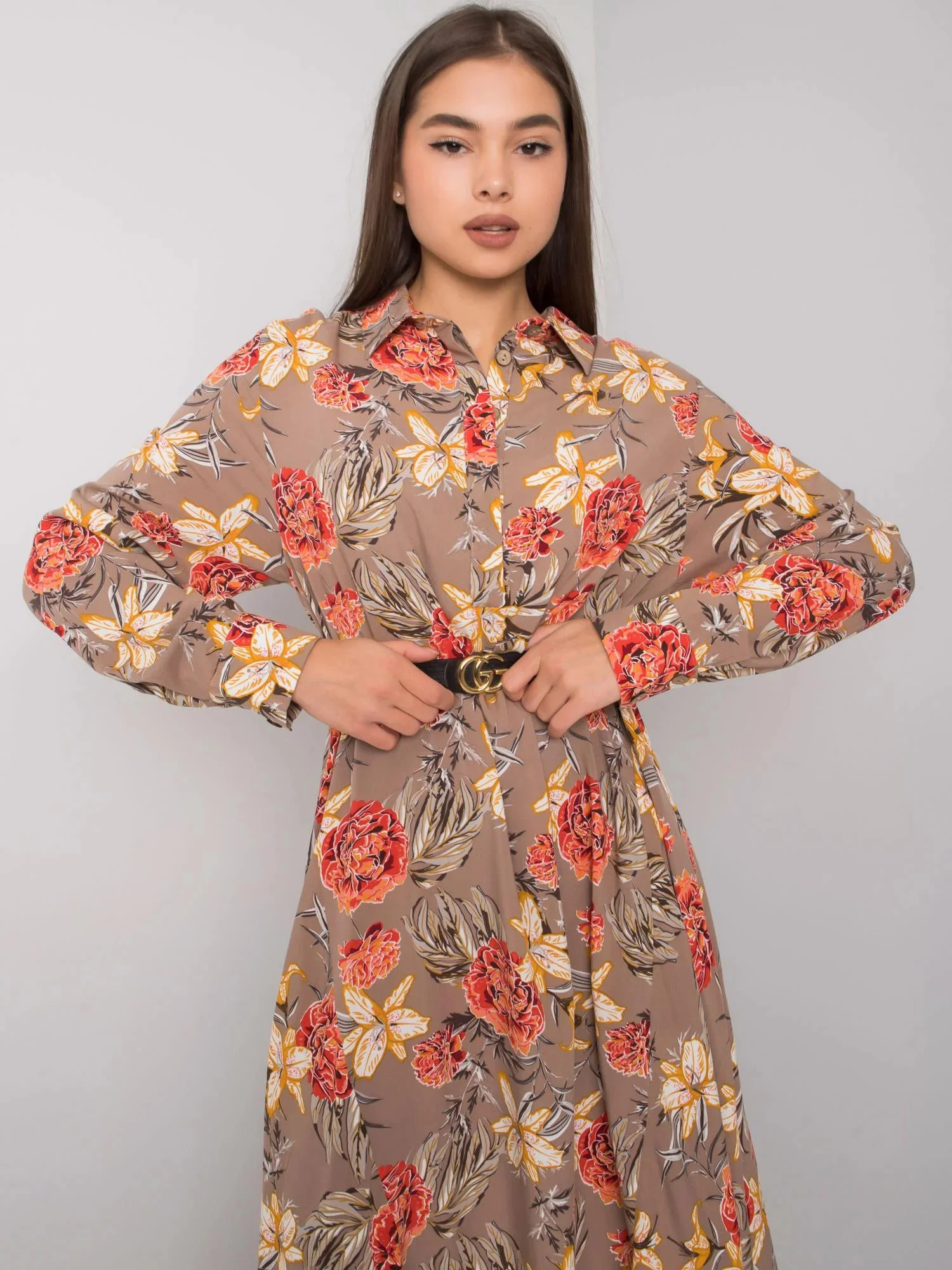 Tmavě béžové vzorované šaty.