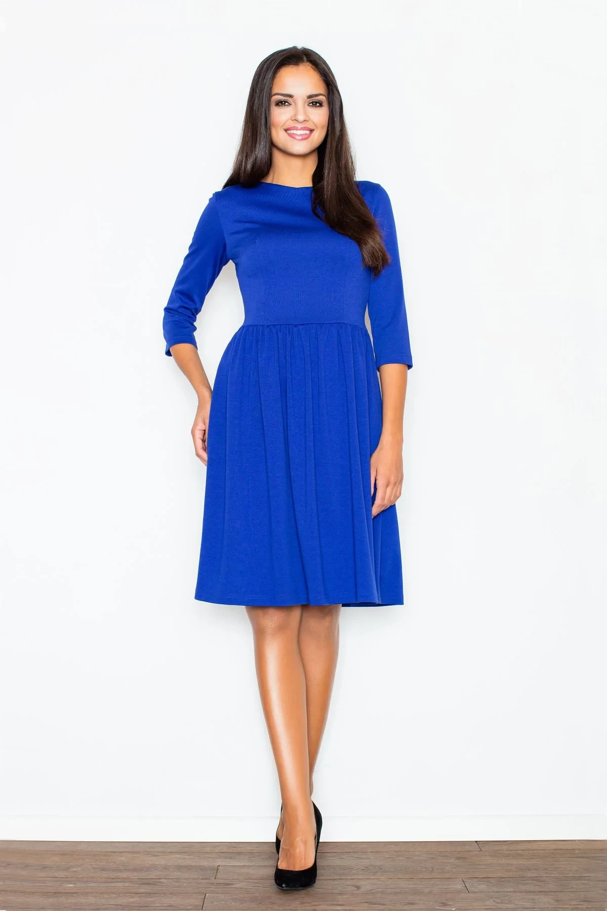 Safírové šaty plné elegance, ideální pro každou příležitost. Rozšířená spodní část dodává šarm a lehkost. Vrchní díl je pěkně vypasovaný, zvýrazňuje pas. Zapínání na zip, rukávy ve 3/4 délce.
