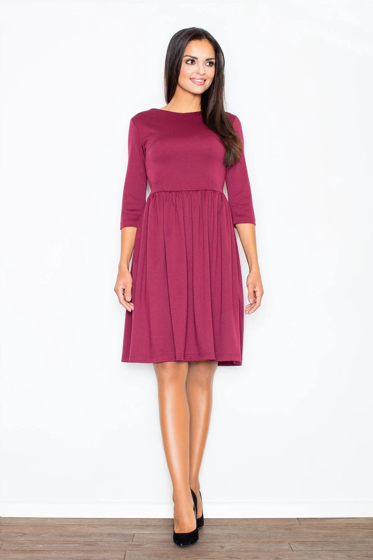 Vínové šaty plné elegance, ideální pro každou příležitost. Rozšířený spodní díl dodává šarm a lehkost. Vrchní díl je pěkně střižený, zvýrazňuje pas. Zapíná se na zip, má rukávy ve 3/4 délce.