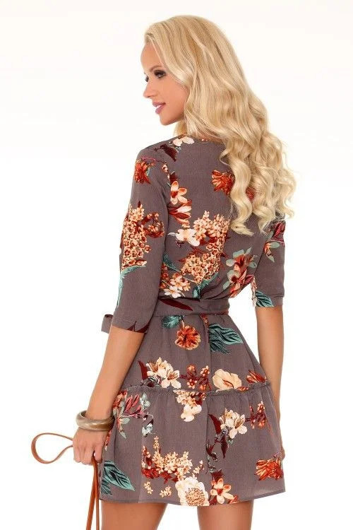 Pohodlné světle hnědé šaty s krásnými jemnými květy, ideální na léto. Model má kulatý decentní výstřih, rukávy dlouhé až k loktům, zavazování, které zvýrazňuje pas, a volný, vzdušný spodní díl zakončený volánkem. Návrh, ve kterém se budete cítit krásně, žensky a pohodlně. Výstřih ve tvaru slzy na zadní straně krku. Složení: 95% polyester, 5% elastan.