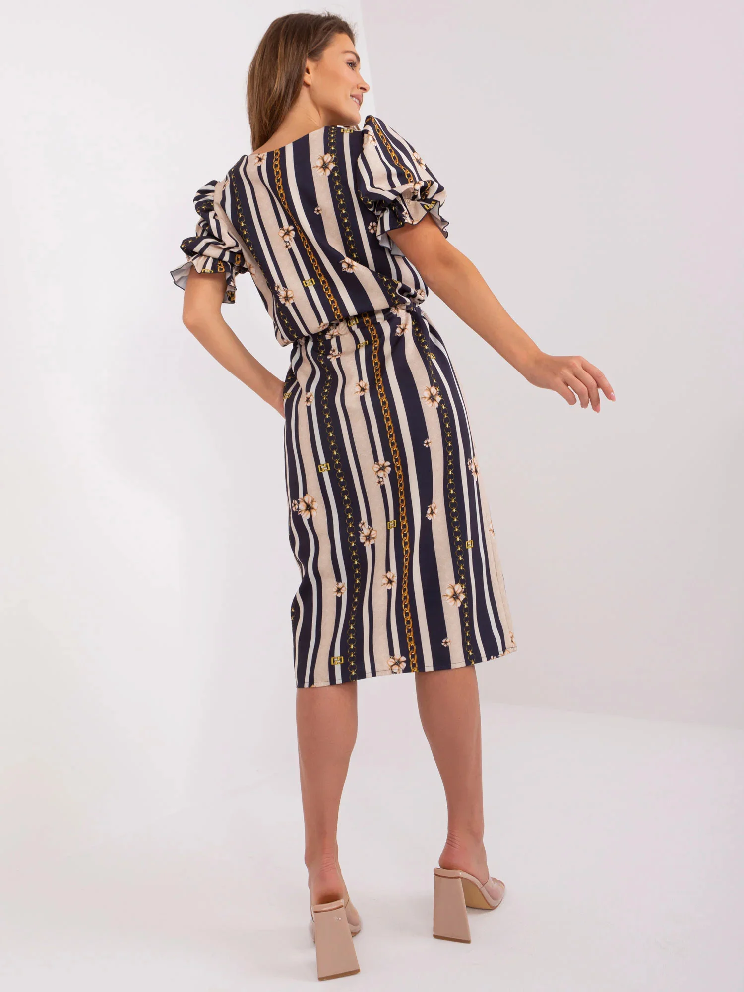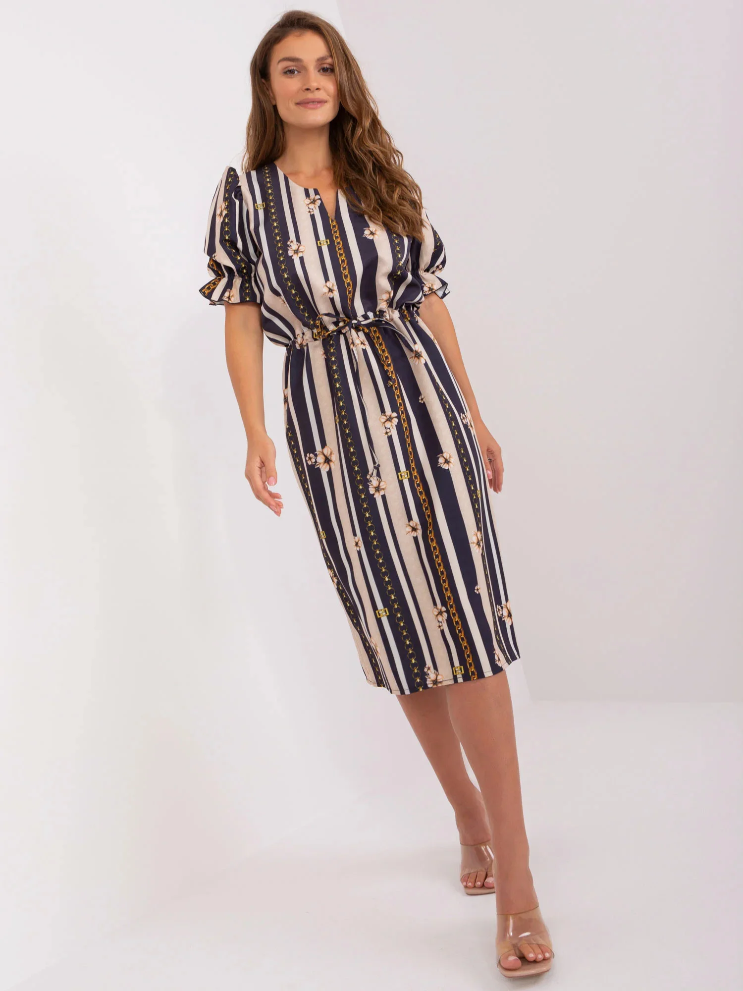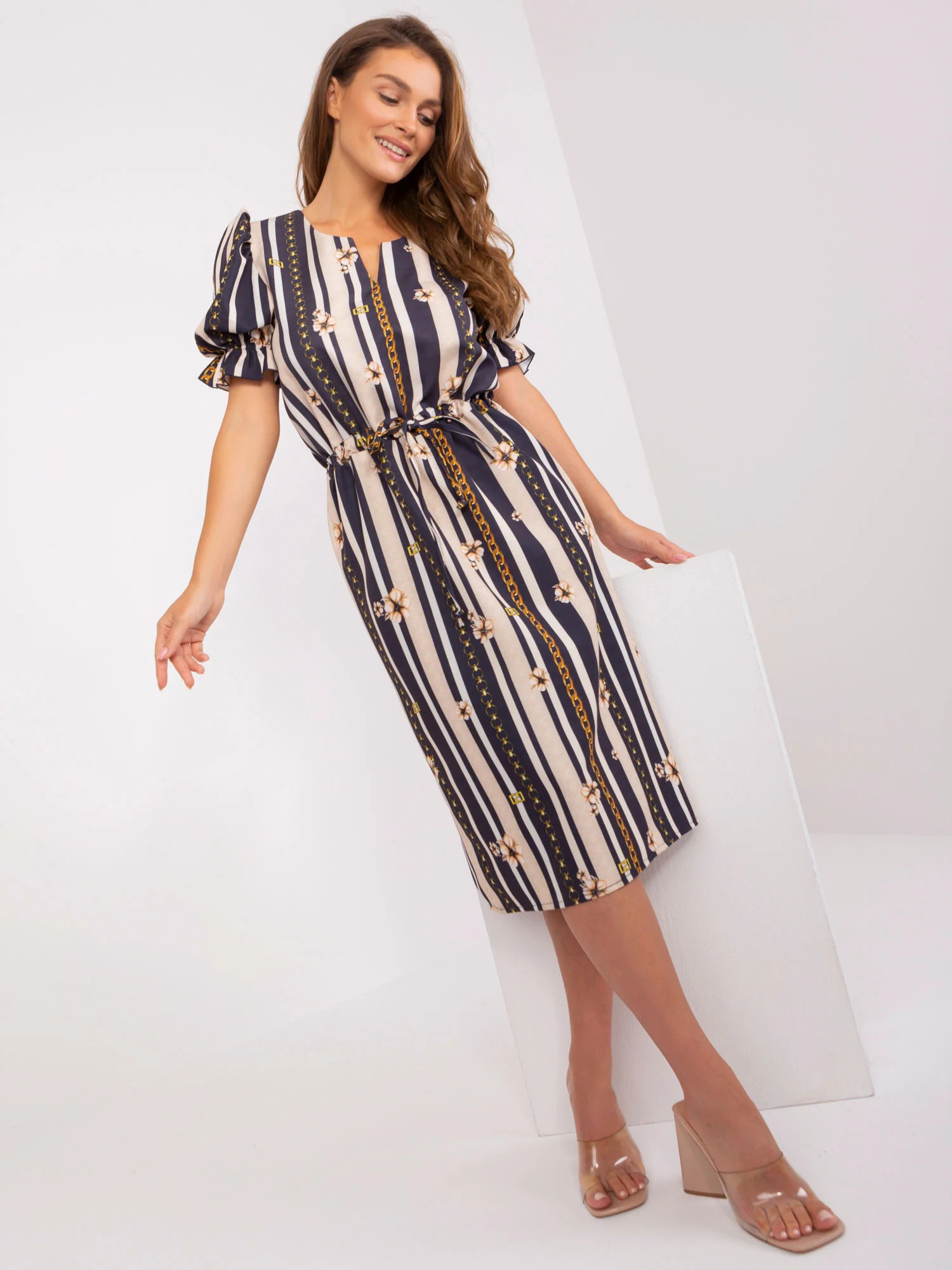 Námořnicky modré šaty s potiskem a buffovými rukávy .