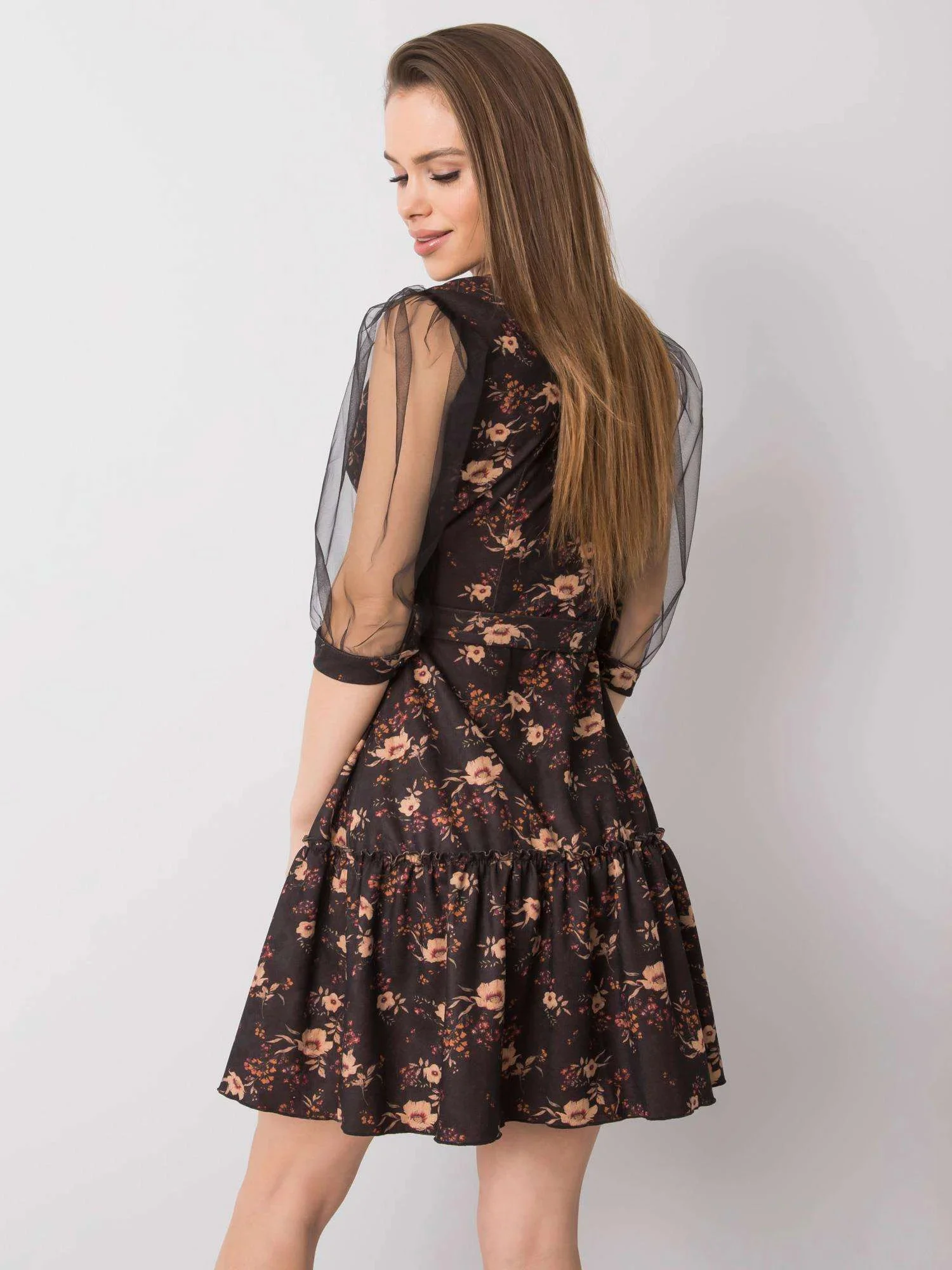 Černé květované šaty s ozdobnými rukávy.