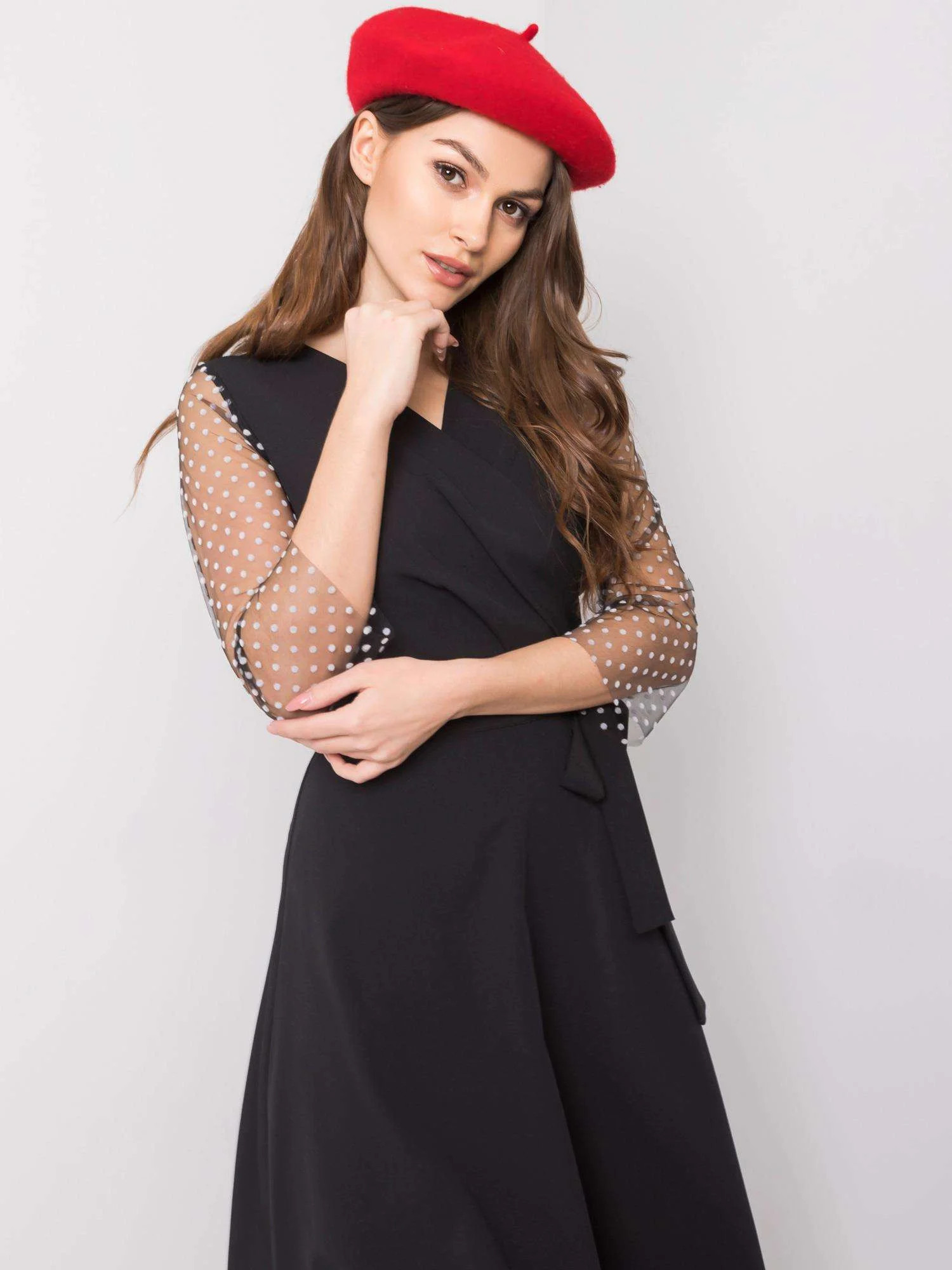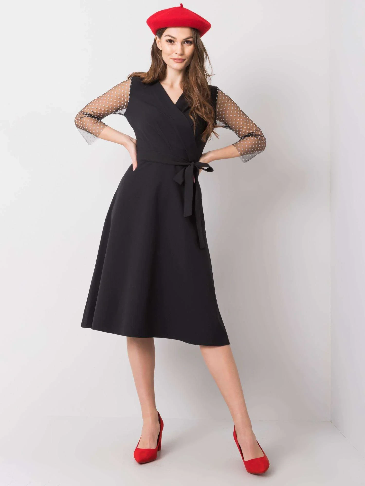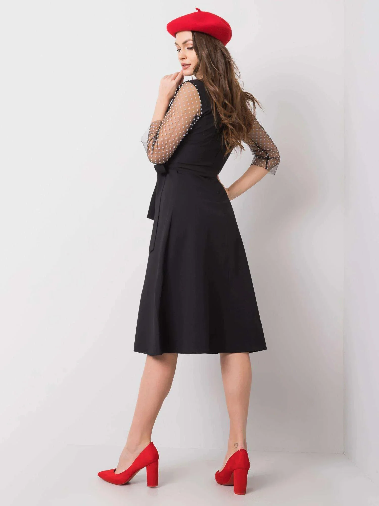 Černé šaty s ozdobnými rukávy.