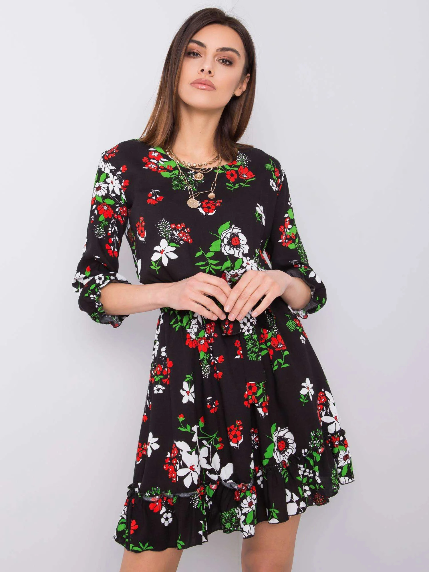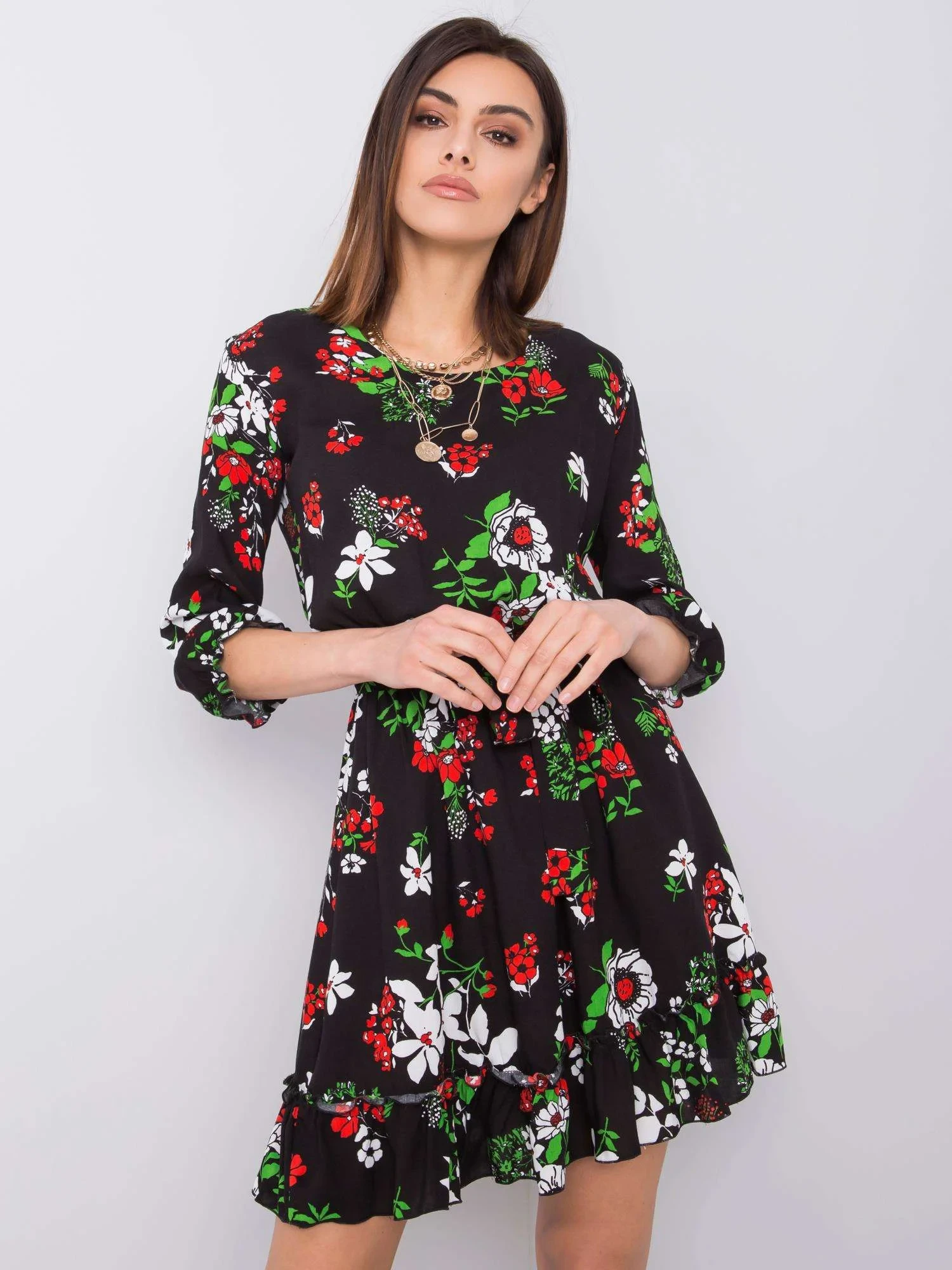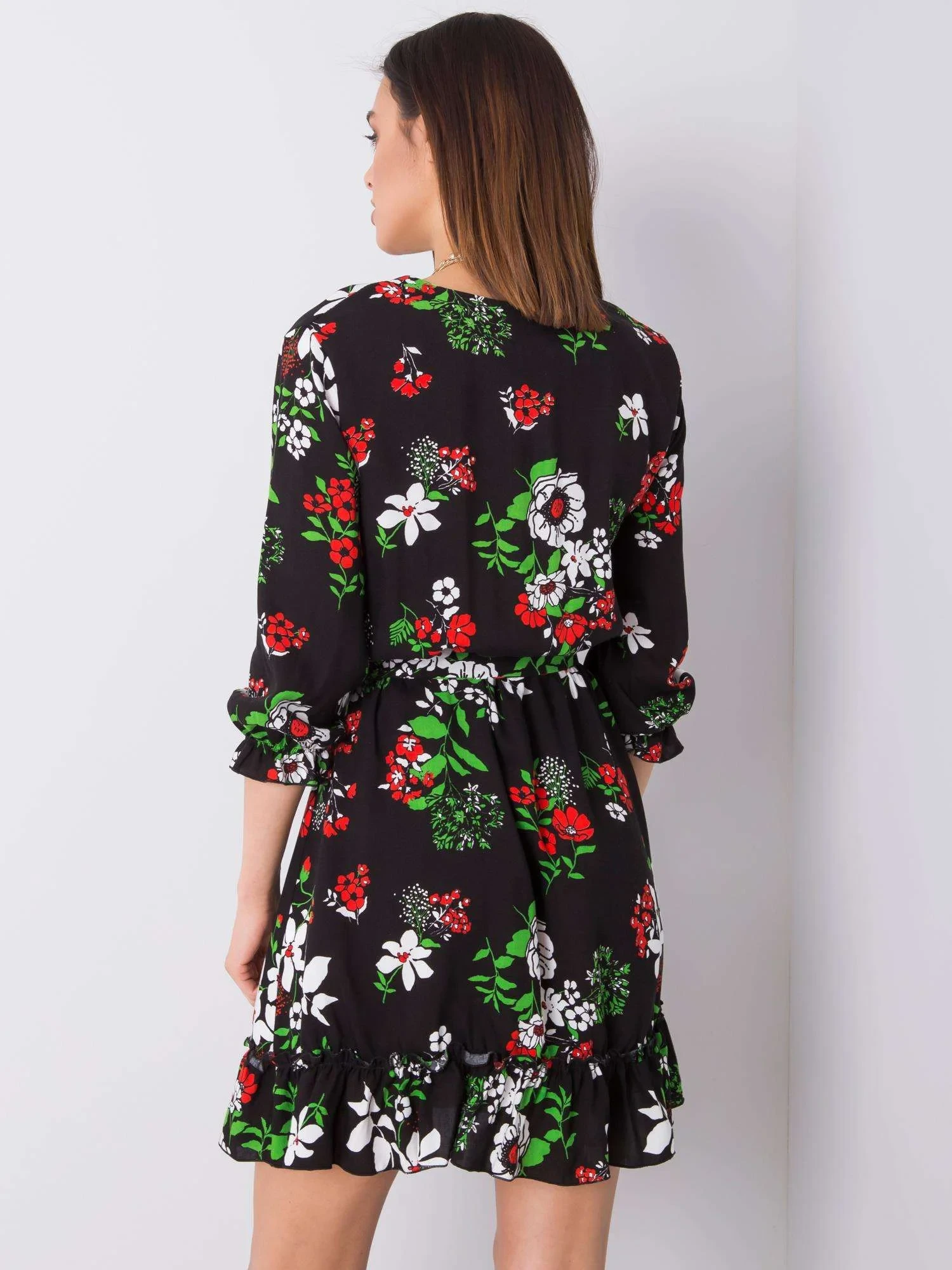 Černé květinové šaty s volánem .