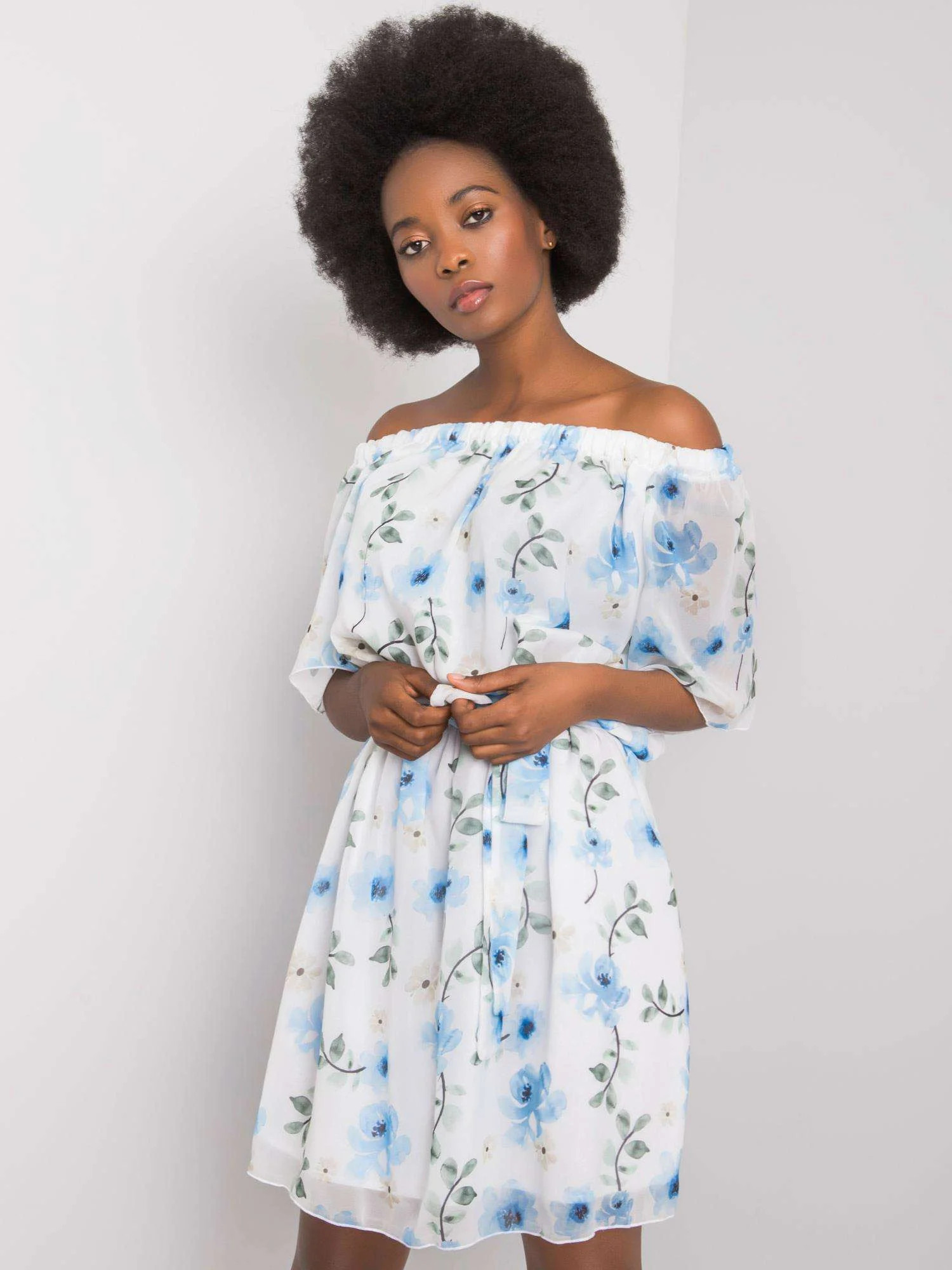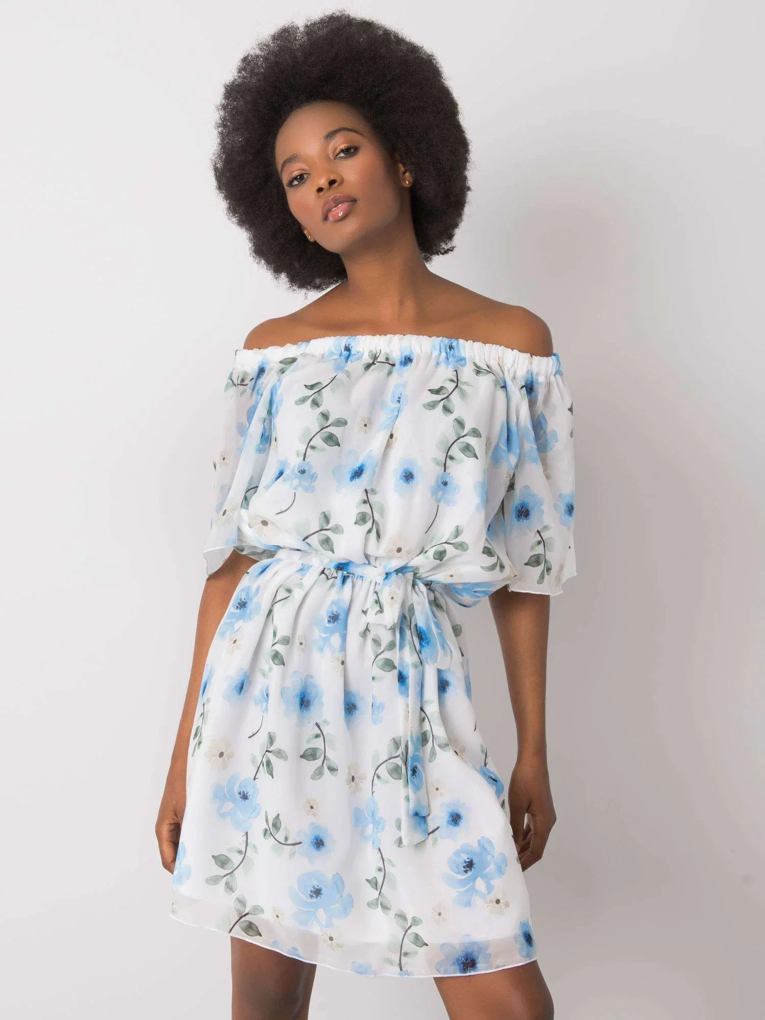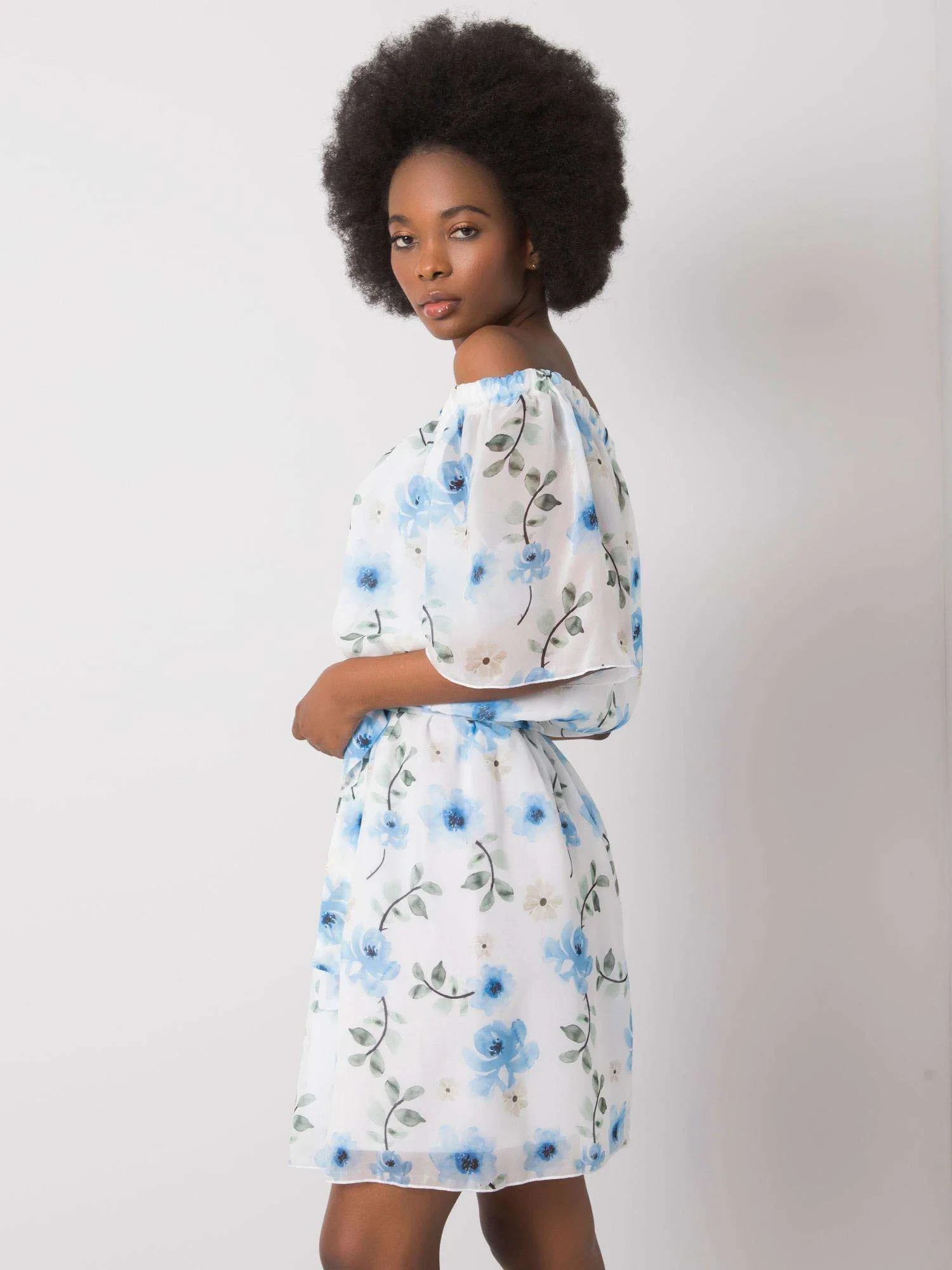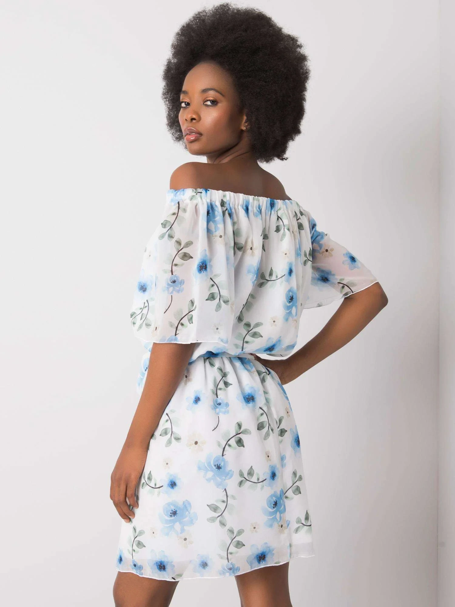 Bílé šaty s květinovými vzory.