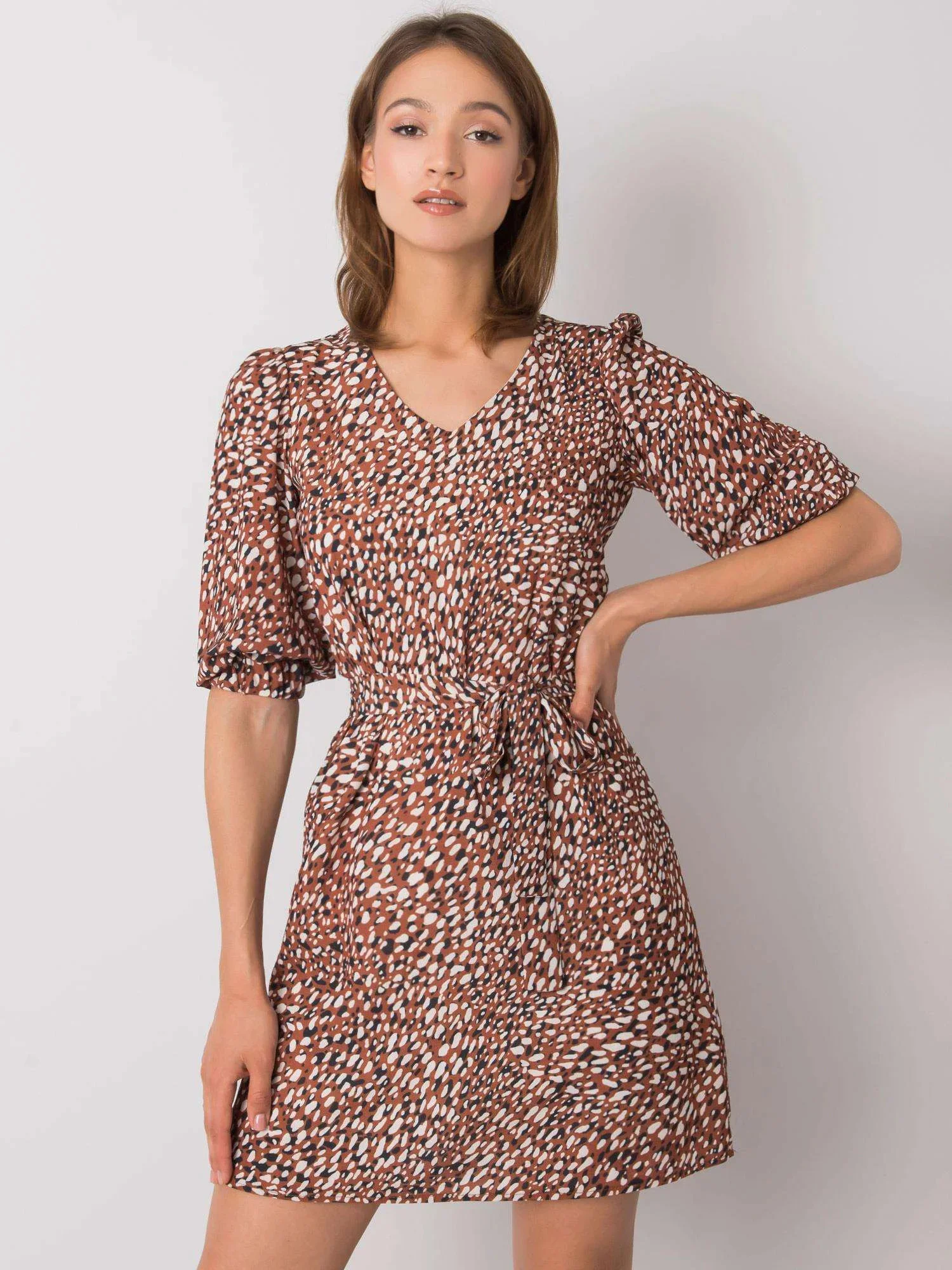 Hnědé vzorované šaty s páskem.