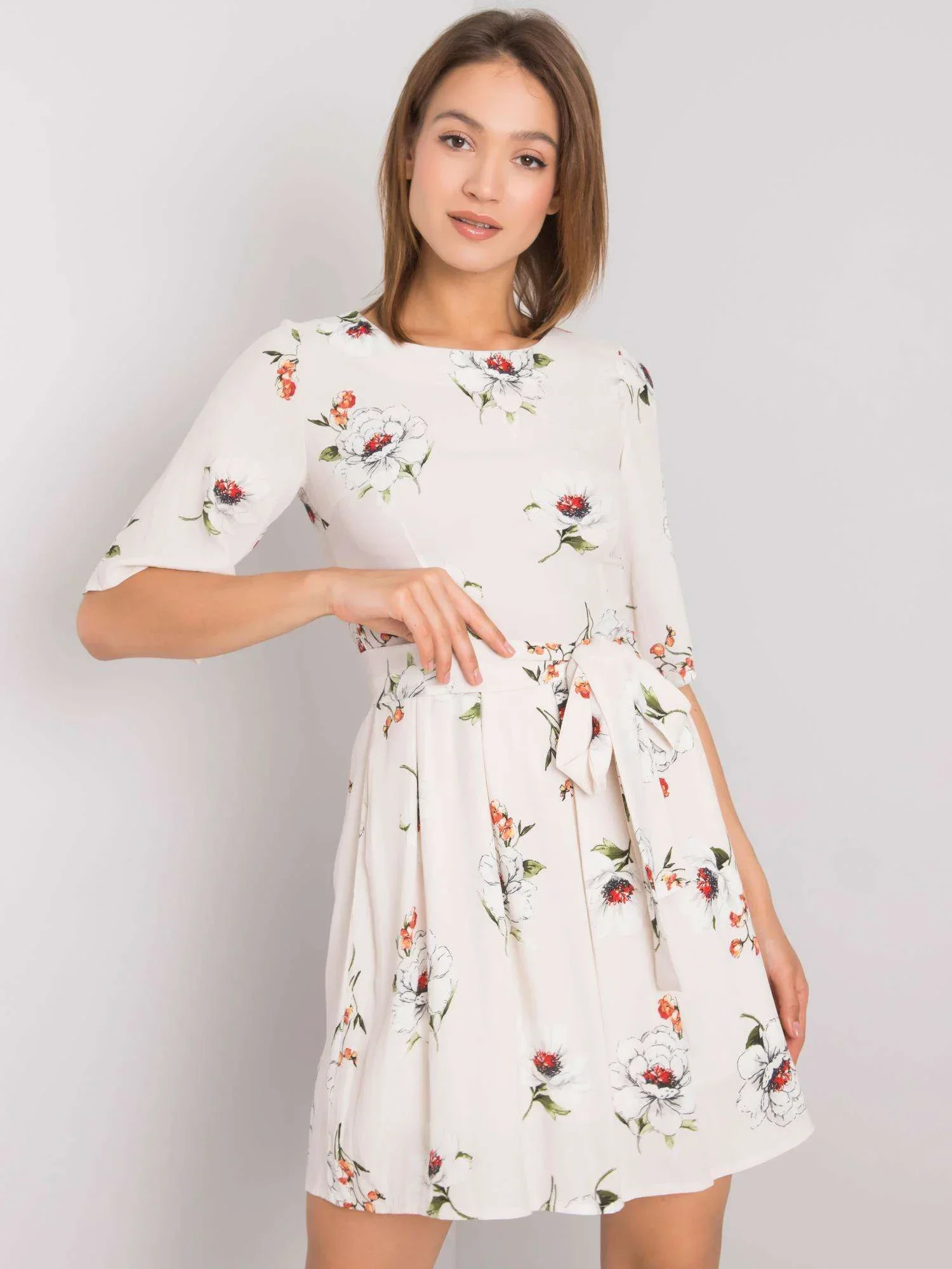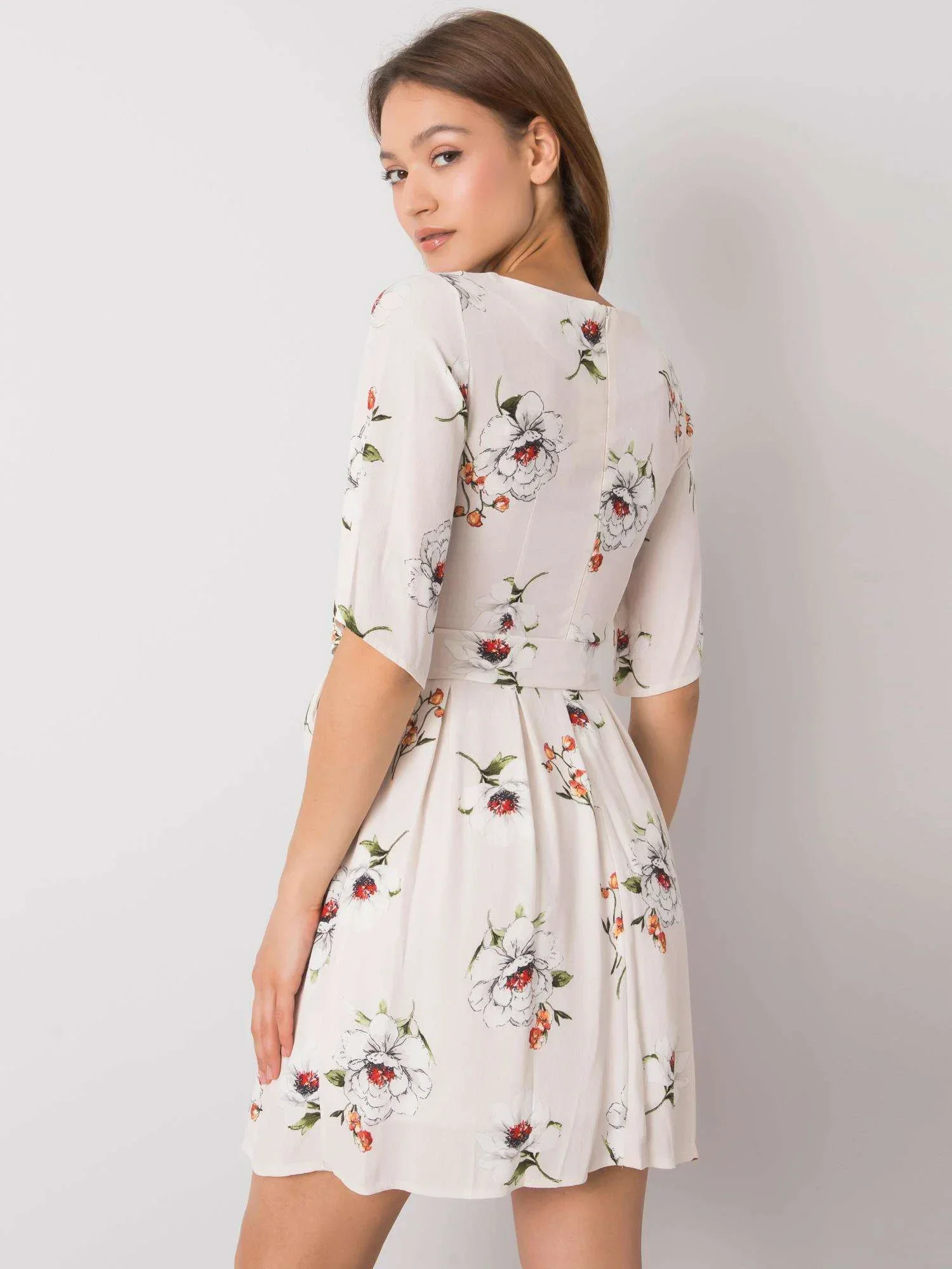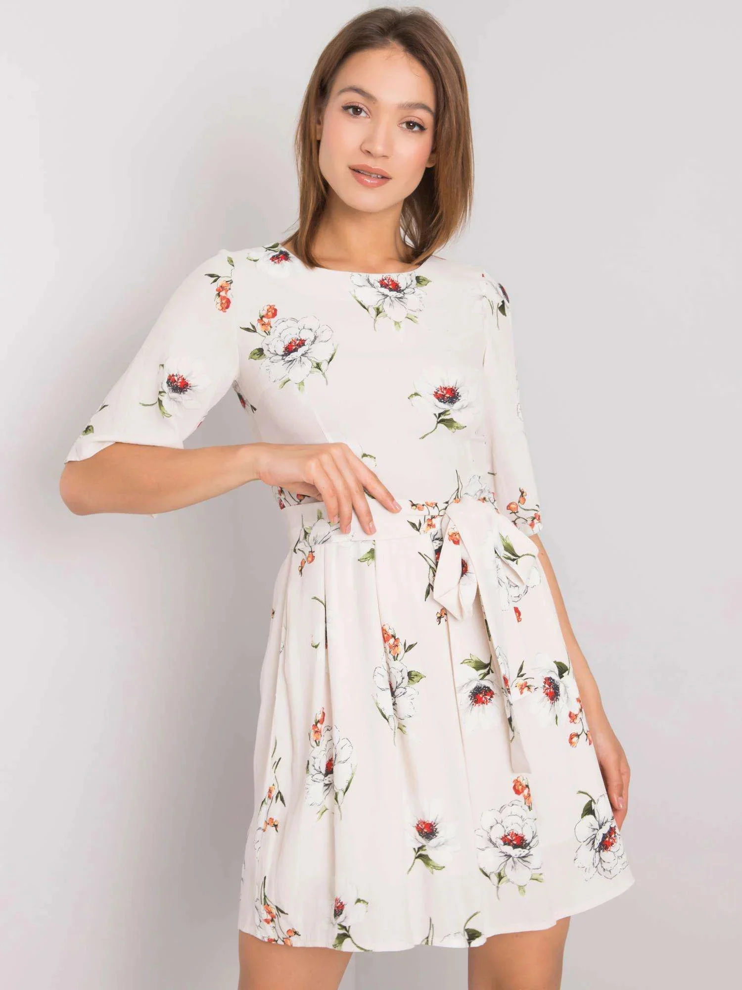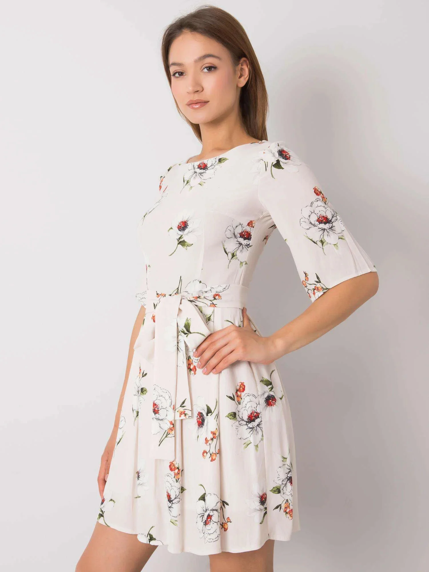 Světle béžové šaty s květinovým potiskem.