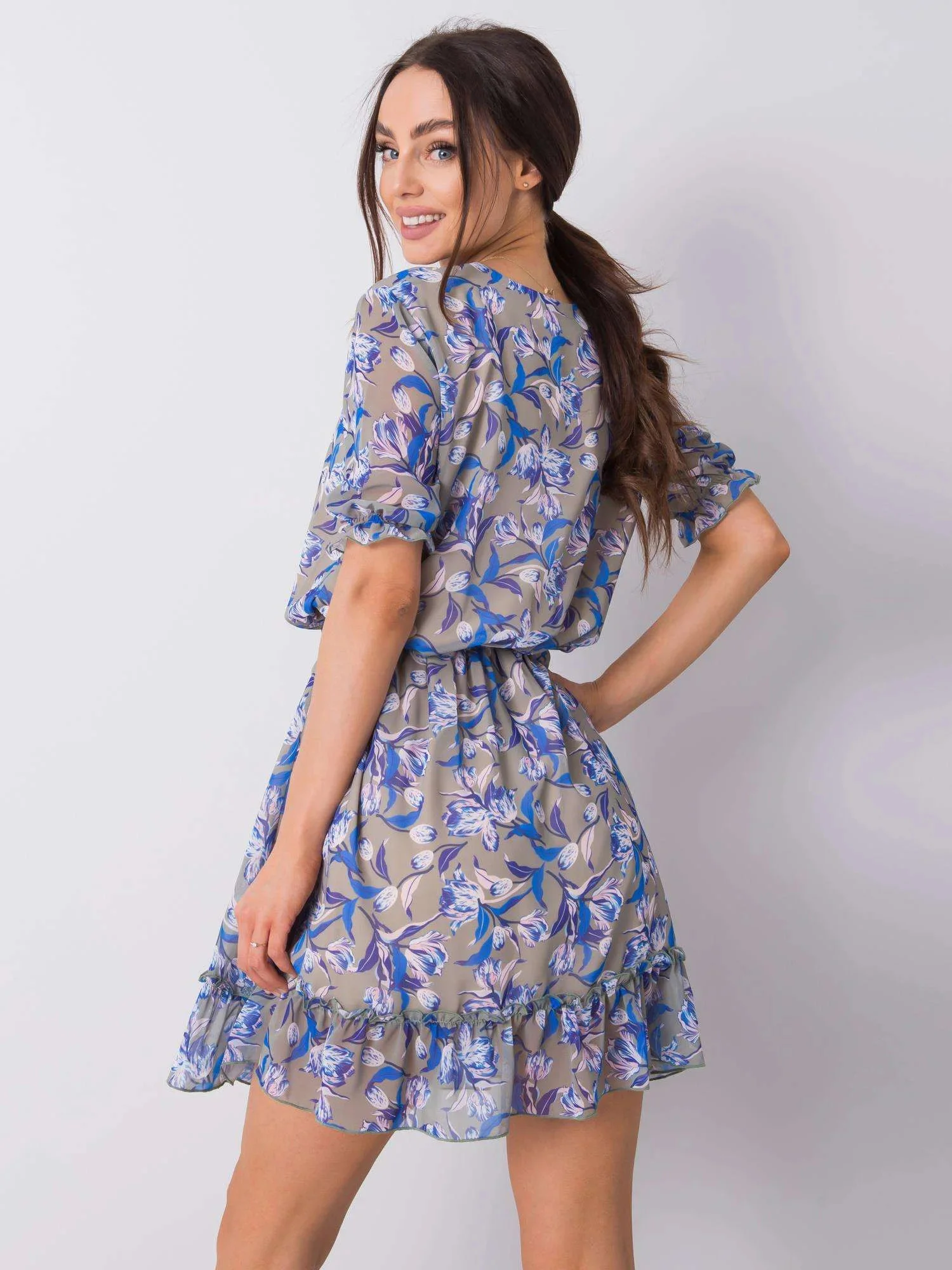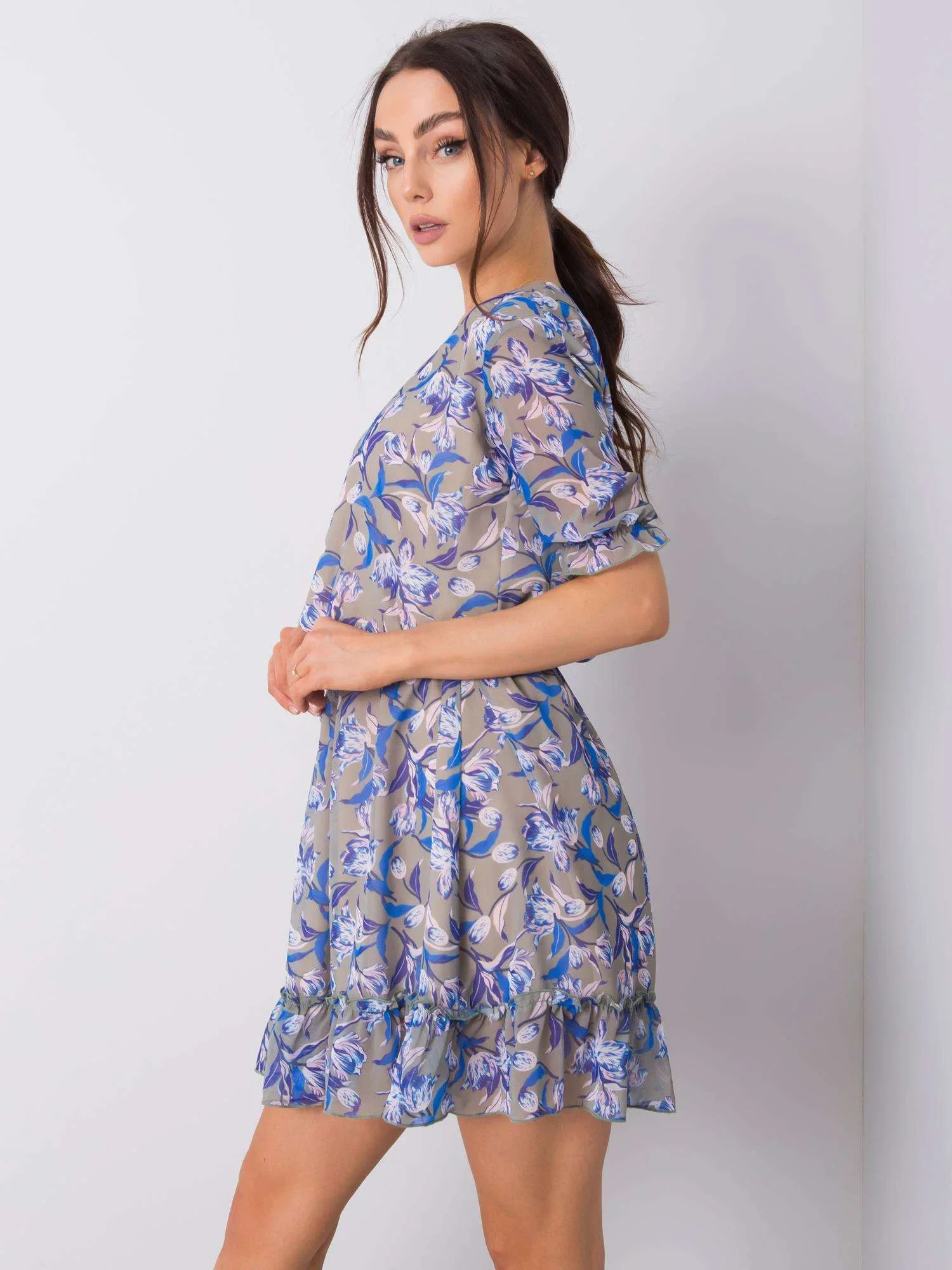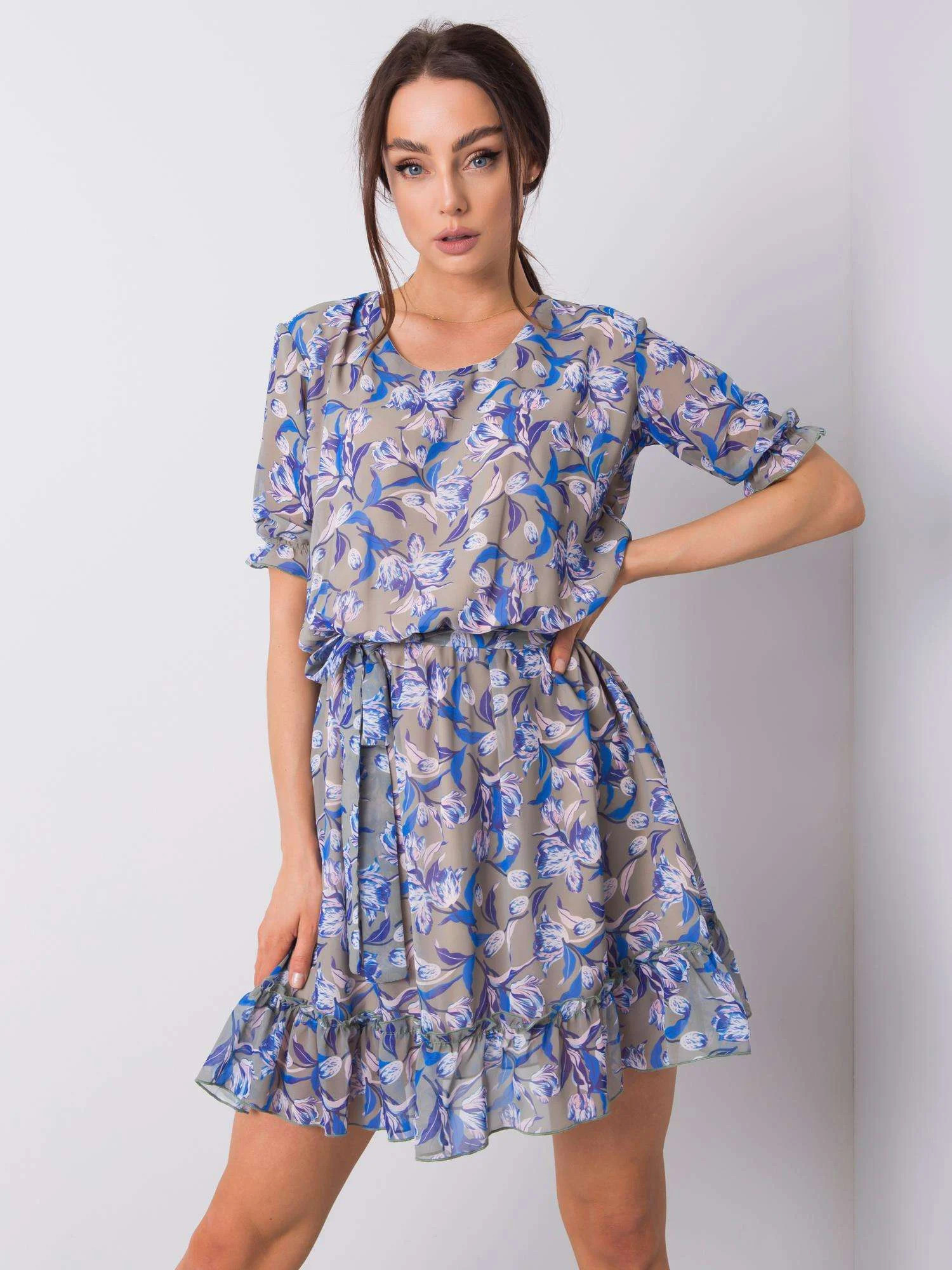 Khaki šaty s květinovým potiskem.