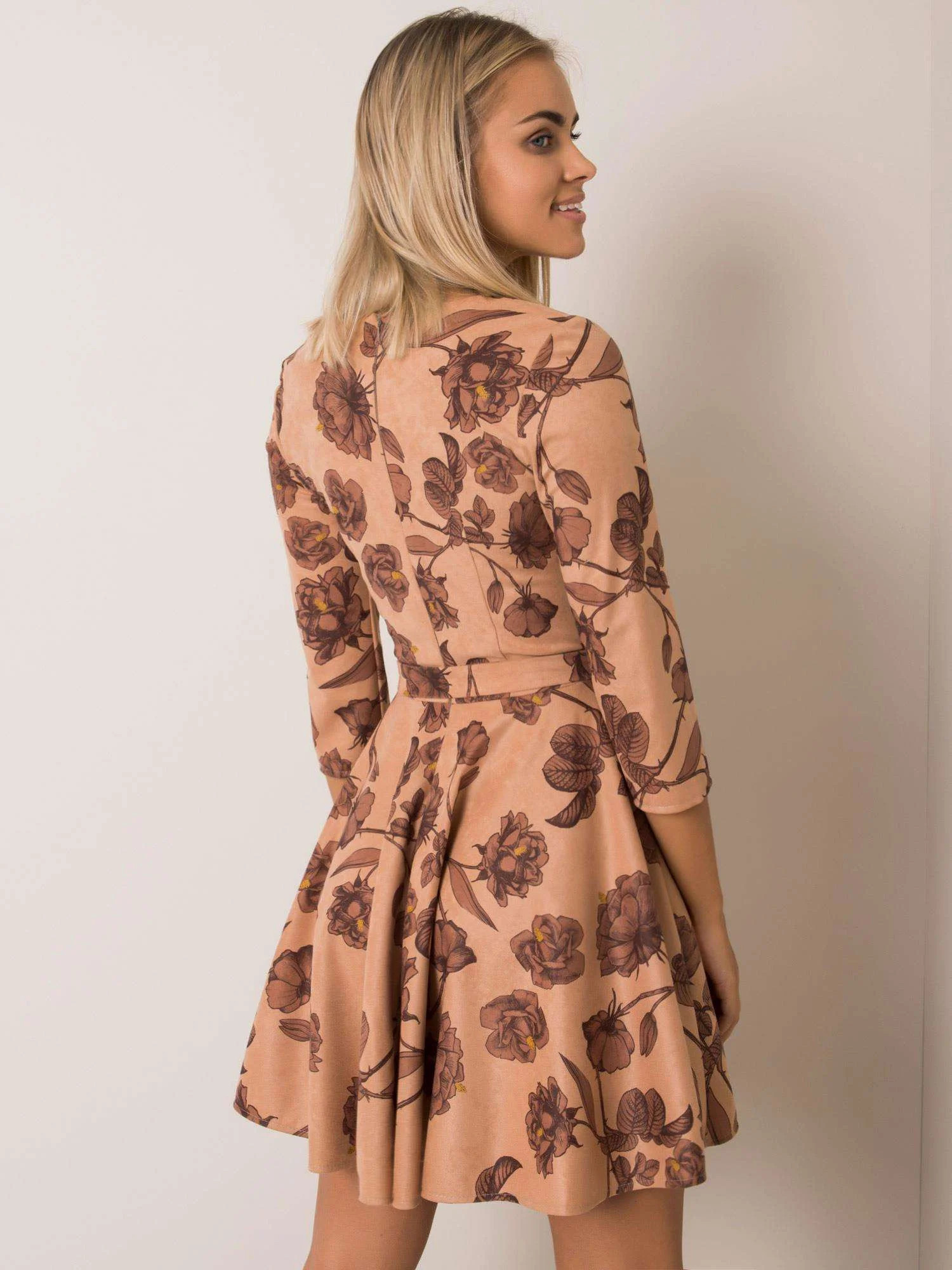 Béžové a hnědé květované šaty s páskem.