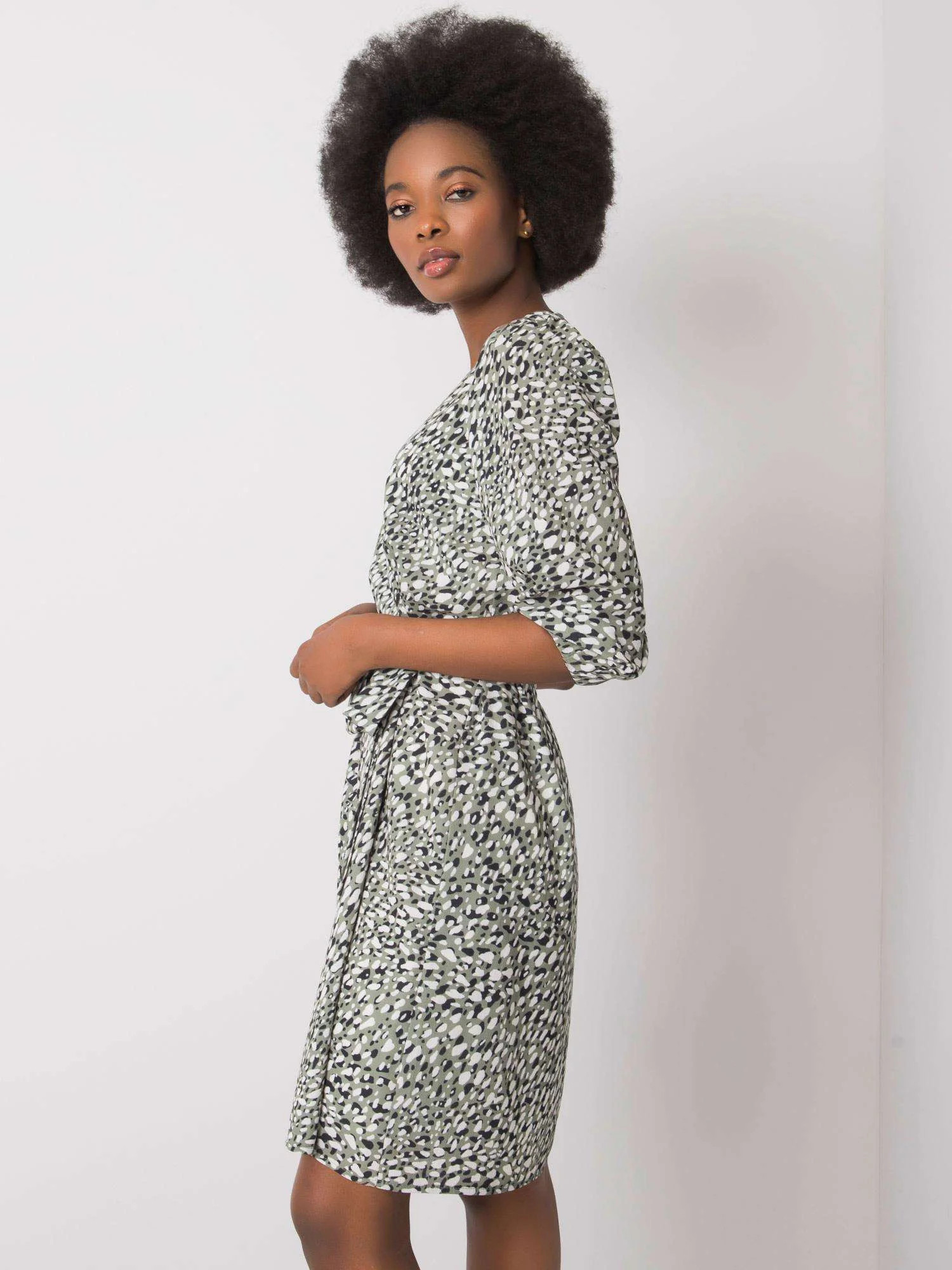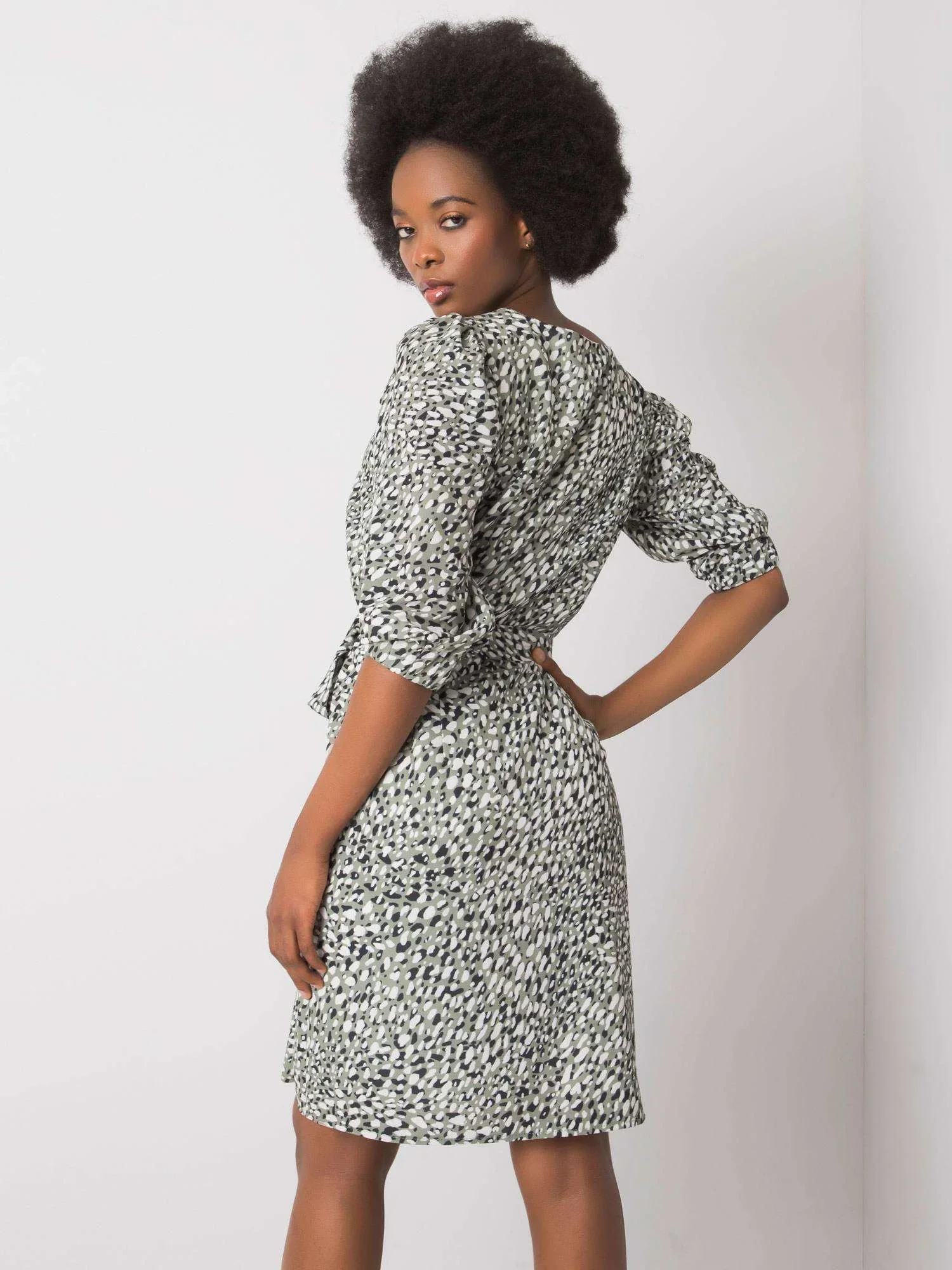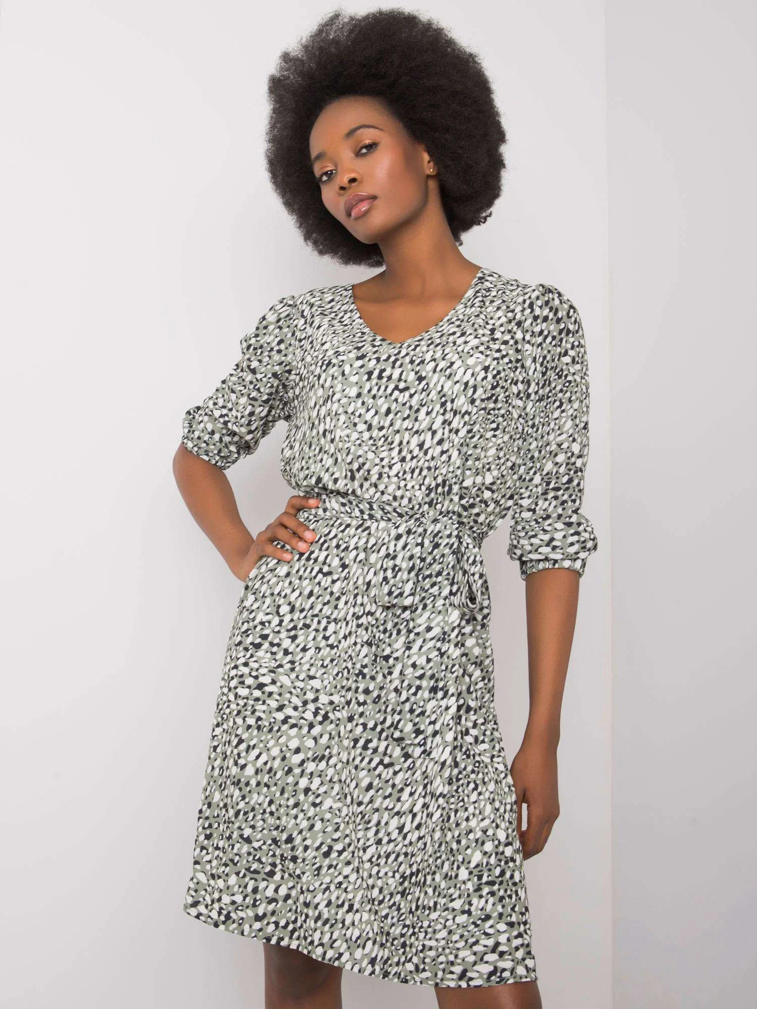 Zelené vzorované šaty s páskem.